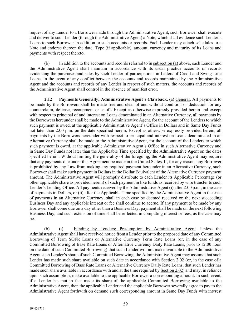 59 194639719 request of any Lender to a Borrower made through the Administrative Agent, such Borrower shall execute and deliver to such Lender (through the Administrative Agent) a Note, which shall evidence such Lender’s Loans to such Borrower in addition to such accounts or records. Each Lender may attach schedules to a Note and endorse thereon the date, Type (if applicable), amount, currency and maturity of its Loans and payments with respect thereto. (b) In addition to the accounts and records referred to in subsection (a) above, each Lender and the Administrative Agent shall maintain in accordance with its usual practice accounts or records evidencing the purchases and sales by such Lender of participations in Letters of Credit and Swing Line Loans. In the event of any conflict between the accounts and records maintained by the Administrative Agent and the accounts and records of any Lender in respect of such matters, the accounts and records of the Administrative Agent shall control in the absence of manifest error. 2.12 Payments Generally; Administrative Agent’s Clawback. (a) General. All payments to be made by the Borrowers shall be made free and clear of and without condition or deduction for any counterclaim, defense, recoupment or setoff. Except as otherwise expressly provided herein and except with respect to principal of and interest on Loans denominated in an Alternative Currency, all payments by the Borrowers hereunder shall be made to the Administrative Agent, for the account of the Lenders to which such payment is owed, at the applicable Administrative Agent’s Office in Dollars and in Same Day Funds not later than 2:00 p.m. on the date specified herein. Except as otherwise expressly provided herein, all payments by the Borrowers hereunder with respect to principal and interest on Loans denominated in an Alternative Currency shall be made to the Administrative Agent, for the account of the Lenders to which such payment is owed, at the applicable Administrative Agent’s Office in such Alternative Currency and in Same Day Funds not later than the Applicable Time specified by the Administrative Agent on the dates specified herein. Without limiting the generality of the foregoing, the Administrative Agent may require that any payments due under this Agreement be made in the United States. If, for any reason, any Borrower is prohibited by any Law from making any required payment hereunder in an Alternative Currency, such Borrower shall make such payment in Dollars in the Dollar Equivalent of the Alternative Currency payment amount. The Administrative Agent will promptly distribute to each Lender its Applicable Percentage (or other applicable share as provided herein) of such payment in like funds as received by wire transfer to such Lender’s Lending Office. All payments received by the Administrative Agent (i) after 2:00 p.m., in the case of payments in Dollars, or (ii) after the Applicable Time specified by the Administrative Agent in the case of payments in an Alternative Currency, shall in each case be deemed received on the next succeeding Business Day and any applicable interest or fee shall continue to accrue. If any payment to be made by any Borrower shall come due on a day other than a Business Day, payment shall be made on the next following Business Day, and such extension of time shall be reflected in computing interest or fees, as the case may be. (b) (i) Funding by Lenders; Presumption by Administrative Agent. Unless the Administrative Agent shall have received notice from a Lender prior to the proposed date of any Committed Borrowing of Term SOFR Loans or Alternative Currency Term Rate Loans (or, in the case of any Committed Borrowing of Base Rate Loans or Alternative Currency Daily Rate Loans, prior to 12:00 noon on the date of such Committed Borrowing) that such Lender will not make available to the Administrative Agent such Lender’s share of such Committed Borrowing, the Administrative Agent may assume that such Lender has made such share available on such date in accordance with Section 2.02 (or, in the case of a Committed Borrowing of Base Rate Loans or Alternative Currency Daily Rate Loans, that such Lender has made such share available in accordance with and at the time required by Section 2.02) and may, in reliance upon such assumption, make available to the applicable Borrower a corresponding amount. In such event, if a Lender has not in fact made its share of the applicable Committed Borrowing available to the Administrative Agent, then the applicable Lender and the applicable Borrower severally agree to pay to the Administrative Agent forthwith on demand such corresponding amount in Same Day Funds with interest