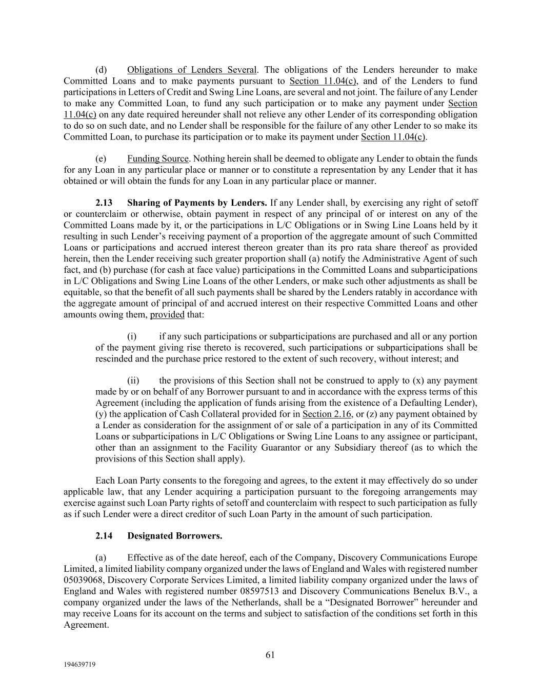 61 194639719 (d) Obligations of Lenders Several. The obligations of the Lenders hereunder to make Committed Loans and to make payments pursuant to Section 11.04(c), and of the Lenders to fund participations in Letters of Credit and Swing Line Loans, are several and not joint. The failure of any Lender to make any Committed Loan, to fund any such participation or to make any payment under Section 11.04(c) on any date required hereunder shall not relieve any other Lender of its corresponding obligation to do so on such date, and no Lender shall be responsible for the failure of any other Lender to so make its Committed Loan, to purchase its participation or to make its payment under Section 11.04(c). (e) Funding Source. Nothing herein shall be deemed to obligate any Lender to obtain the funds for any Loan in any particular place or manner or to constitute a representation by any Lender that it has obtained or will obtain the funds for any Loan in any particular place or manner. 2.13 Sharing of Payments by Lenders. If any Lender shall, by exercising any right of setoff or counterclaim or otherwise, obtain payment in respect of any principal of or interest on any of the Committed Loans made by it, or the participations in L/C Obligations or in Swing Line Loans held by it resulting in such Lender’s receiving payment of a proportion of the aggregate amount of such Committed Loans or participations and accrued interest thereon greater than its pro rata share thereof as provided herein, then the Lender receiving such greater proportion shall (a) notify the Administrative Agent of such fact, and (b) purchase (for cash at face value) participations in the Committed Loans and subparticipations in L/C Obligations and Swing Line Loans of the other Lenders, or make such other adjustments as shall be equitable, so that the benefit of all such payments shall be shared by the Lenders ratably in accordance with the aggregate amount of principal of and accrued interest on their respective Committed Loans and other amounts owing them, provided that: (i) if any such participations or subparticipations are purchased and all or any portion of the payment giving rise thereto is recovered, such participations or subparticipations shall be rescinded and the purchase price restored to the extent of such recovery, without interest; and (ii) the provisions of this Section shall not be construed to apply to (x) any payment made by or on behalf of any Borrower pursuant to and in accordance with the express terms of this Agreement (including the application of funds arising from the existence of a Defaulting Lender), (y) the application of Cash Collateral provided for in Section 2.16, or (z) any payment obtained by a Lender as consideration for the assignment of or sale of a participation in any of its Committed Loans or subparticipations in L/C Obligations or Swing Line Loans to any assignee or participant, other than an assignment to the Facility Guarantor or any Subsidiary thereof (as to which the provisions of this Section shall apply). Each Loan Party consents to the foregoing and agrees, to the extent it may effectively do so under applicable law, that any Lender acquiring a participation pursuant to the foregoing arrangements may exercise against such Loan Party rights of setoff and counterclaim with respect to such participation as fully as if such Lender were a direct creditor of such Loan Party in the amount of such participation. 2.14 Designated Borrowers. (a) Effective as of the date hereof, each of the Company, Discovery Communications Europe Limited, a limited liability company organized under the laws of England and Wales with registered number 05039068, Discovery Corporate Services Limited, a limited liability company organized under the laws of England and Wales with registered number 08597513 and Discovery Communications Benelux B.V., a company organized under the laws of the Netherlands, shall be a “Designated Borrower” hereunder and may receive Loans for its account on the terms and subject to satisfaction of the conditions set forth in this Agreement.