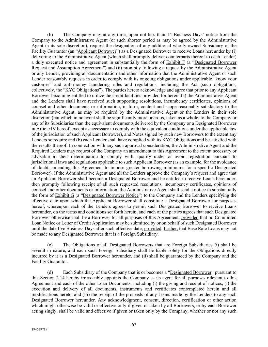 62 194639719 (b) The Company may at any time, upon not less than 14 Business Days’ notice from the Company to the Administrative Agent (or such shorter period as may be agreed by the Administrative Agent in its sole discretion), request the designation of any additional wholly-owned Subsidiary of the Facility Guarantor (an “Applicant Borrower”) as a Designated Borrower to receive Loans hereunder by (i) delivering to the Administrative Agent (which shall promptly deliver counterparts thereof to each Lender) a duly executed notice and agreement in substantially the form of Exhibit F (a “Designated Borrower Request and Assumption Agreement”) and (ii) promptly following a request by the Administrative Agent or any Lender, providing all documentation and other information that the Administrative Agent or such Lender reasonably requests in order to comply with its ongoing obligations under applicable “know your customer” and anti-money laundering rules and regulations, including the Act (such obligations, collectively, the “KYC Obligations”). The parties hereto acknowledge and agree that prior to any Applicant Borrower becoming entitled to utilize the credit facilities provided for herein (a) the Administrative Agent and the Lenders shall have received such supporting resolutions, incumbency certificates, opinions of counsel and other documents or information, in form, content and scope reasonably satisfactory to the Administrative Agent, as may be required by the Administrative Agent or the Lenders in their sole discretion (but which in no event shall be significantly more onerous, taken as a whole, to the Company or any of its Subsidiaries than the equivalent documents delivered by the Company or a Designated Borrower in Article IV hereof, except as necessary to comply with the equivalent conditions under the applicable law of the jurisdiction of such Applicant Borrower), and Notes signed by such new Borrowers to the extent any Lenders so require and (b) each Lender shall have complied with its KYC Obligations and be satisfied with the results thereof. In connection with any such approval consideration, the Administrative Agent and the Required Lenders may request of the Company an amendment to this Agreement to the extent necessary or advisable in their determination to comply with, qualify under or avoid registration pursuant to jurisdictional laws and regulations applicable to such Applicant Borrower (as an example, for the avoidance of doubt, amending this Agreement to impose greater borrowing minimums for a specific Designated Borrower). If the Administrative Agent and all the Lenders approve the Company’s request and agree that an Applicant Borrower shall become a Designated Borrower and be entitled to receive Loans hereunder, then promptly following receipt of all such requested resolutions, incumbency certificates, opinions of counsel and other documents or information, the Administrative Agent shall send a notice in substantially the form of Exhibit G (a “Designated Borrower Notice”) to the Company and the Lenders specifying the effective date upon which the Applicant Borrower shall constitute a Designated Borrower for purposes hereof, whereupon each of the Lenders agrees to permit such Designated Borrower to receive Loans hereunder, on the terms and conditions set forth herein, and each of the parties agrees that such Designated Borrower otherwise shall be a Borrower for all purposes of this Agreement; provided that no Committed Loan Notice or Letter of Credit Application may be submitted by or on behalf of such Designated Borrower until the date five Business Days after such effective date; provided, further, that Base Rate Loans may not be made to any Designated Borrower that is a Foreign Subsidiary. (c) The Obligations of all Designated Borrowers that are Foreign Subsidiaries (i) shall be several in nature, and each such Foreign Subsidiary shall be liable solely for the Obligations directly incurred by it as a Designated Borrower hereunder, and (ii) shall be guaranteed by the Company and the Facility Guarantor. (d) Each Subsidiary of the Company that is or becomes a “Designated Borrower” pursuant to this Section 2.14 hereby irrevocably appoints the Company as its agent for all purposes relevant to this Agreement and each of the other Loan Documents, including (i) the giving and receipt of notices, (i) the execution and delivery of all documents, instruments and certificates contemplated herein and all modifications hereto, and (iii) the receipt of the proceeds of any Loans made by the Lenders to any such Designated Borrower hereunder. Any acknowledgment, consent, direction, certification or other action which might otherwise be valid or effective only if given or taken by all Borrowers, or by each Borrower acting singly, shall be valid and effective if given or taken only by the Company, whether or not any such