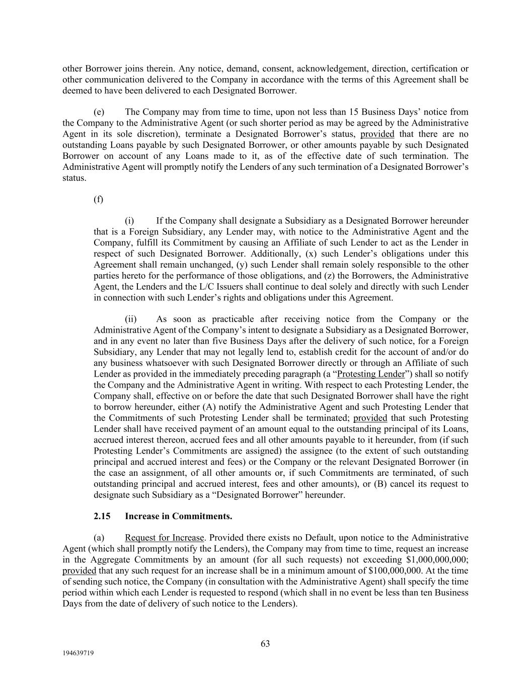 63 194639719 other Borrower joins therein. Any notice, demand, consent, acknowledgement, direction, certification or other communication delivered to the Company in accordance with the terms of this Agreement shall be deemed to have been delivered to each Designated Borrower. (e) The Company may from time to time, upon not less than 15 Business Days’ notice from the Company to the Administrative Agent (or such shorter period as may be agreed by the Administrative Agent in its sole discretion), terminate a Designated Borrower’s status, provided that there are no outstanding Loans payable by such Designated Borrower, or other amounts payable by such Designated Borrower on account of any Loans made to it, as of the effective date of such termination. The Administrative Agent will promptly notify the Lenders of any such termination of a Designated Borrower’s status. (f) (i) If the Company shall designate a Subsidiary as a Designated Borrower hereunder that is a Foreign Subsidiary, any Lender may, with notice to the Administrative Agent and the Company, fulfill its Commitment by causing an Affiliate of such Lender to act as the Lender in respect of such Designated Borrower. Additionally, (x) such Lender’s obligations under this Agreement shall remain unchanged, (y) such Lender shall remain solely responsible to the other parties hereto for the performance of those obligations, and (z) the Borrowers, the Administrative Agent, the Lenders and the L/C Issuers shall continue to deal solely and directly with such Lender in connection with such Lender’s rights and obligations under this Agreement. (ii) As soon as practicable after receiving notice from the Company or the Administrative Agent of the Company’s intent to designate a Subsidiary as a Designated Borrower, and in any event no later than five Business Days after the delivery of such notice, for a Foreign Subsidiary, any Lender that may not legally lend to, establish credit for the account of and/or do any business whatsoever with such Designated Borrower directly or through an Affiliate of such Lender as provided in the immediately preceding paragraph (a “Protesting Lender”) shall so notify the Company and the Administrative Agent in writing. With respect to each Protesting Lender, the Company shall, effective on or before the date that such Designated Borrower shall have the right to borrow hereunder, either (A) notify the Administrative Agent and such Protesting Lender that the Commitments of such Protesting Lender shall be terminated; provided that such Protesting Lender shall have received payment of an amount equal to the outstanding principal of its Loans, accrued interest thereon, accrued fees and all other amounts payable to it hereunder, from (if such Protesting Lender’s Commitments are assigned) the assignee (to the extent of such outstanding principal and accrued interest and fees) or the Company or the relevant Designated Borrower (in the case an assignment, of all other amounts or, if such Commitments are terminated, of such outstanding principal and accrued interest, fees and other amounts), or (B) cancel its request to designate such Subsidiary as a “Designated Borrower” hereunder. 2.15 Increase in Commitments. (a) Request for Increase. Provided there exists no Default, upon notice to the Administrative Agent (which shall promptly notify the Lenders), the Company may from time to time, request an increase in the Aggregate Commitments by an amount (for all such requests) not exceeding $1,000,000,000; provided that any such request for an increase shall be in a minimum amount of $100,000,000. At the time of sending such notice, the Company (in consultation with the Administrative Agent) shall specify the time period within which each Lender is requested to respond (which shall in no event be less than ten Business Days from the date of delivery of such notice to the Lenders).