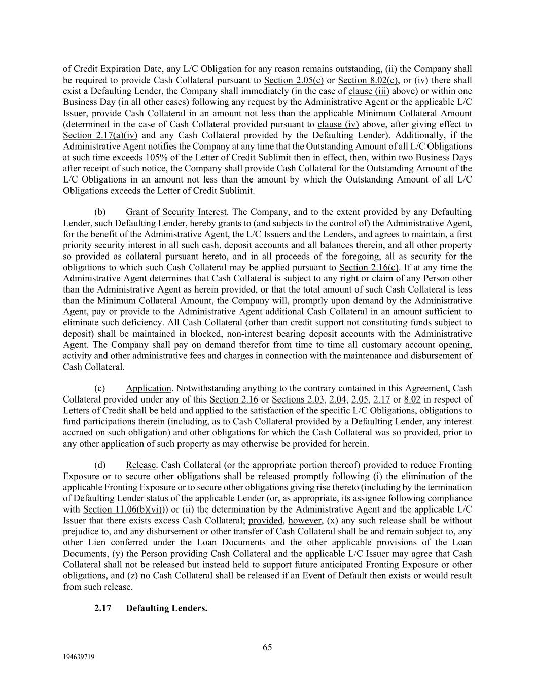 65 194639719 of Credit Expiration Date, any L/C Obligation for any reason remains outstanding, (ii) the Company shall be required to provide Cash Collateral pursuant to Section 2.05(c) or Section 8.02(c), or (iv) there shall exist a Defaulting Lender, the Company shall immediately (in the case of clause (iii) above) or within one Business Day (in all other cases) following any request by the Administrative Agent or the applicable L/C Issuer, provide Cash Collateral in an amount not less than the applicable Minimum Collateral Amount (determined in the case of Cash Collateral provided pursuant to clause (iv) above, after giving effect to Section 2.17(a)(iv) and any Cash Collateral provided by the Defaulting Lender). Additionally, if the Administrative Agent notifies the Company at any time that the Outstanding Amount of all L/C Obligations at such time exceeds 105% of the Letter of Credit Sublimit then in effect, then, within two Business Days after receipt of such notice, the Company shall provide Cash Collateral for the Outstanding Amount of the L/C Obligations in an amount not less than the amount by which the Outstanding Amount of all L/C Obligations exceeds the Letter of Credit Sublimit. (b) Grant of Security Interest. The Company, and to the extent provided by any Defaulting Lender, such Defaulting Lender, hereby grants to (and subjects to the control of) the Administrative Agent, for the benefit of the Administrative Agent, the L/C Issuers and the Lenders, and agrees to maintain, a first priority security interest in all such cash, deposit accounts and all balances therein, and all other property so provided as collateral pursuant hereto, and in all proceeds of the foregoing, all as security for the obligations to which such Cash Collateral may be applied pursuant to Section 2.16(c). If at any time the Administrative Agent determines that Cash Collateral is subject to any right or claim of any Person other than the Administrative Agent as herein provided, or that the total amount of such Cash Collateral is less than the Minimum Collateral Amount, the Company will, promptly upon demand by the Administrative Agent, pay or provide to the Administrative Agent additional Cash Collateral in an amount sufficient to eliminate such deficiency. All Cash Collateral (other than credit support not constituting funds subject to deposit) shall be maintained in blocked, non-interest bearing deposit accounts with the Administrative Agent. The Company shall pay on demand therefor from time to time all customary account opening, activity and other administrative fees and charges in connection with the maintenance and disbursement of Cash Collateral. (c) Application. Notwithstanding anything to the contrary contained in this Agreement, Cash Collateral provided under any of this Section 2.16 or Sections 2.03, 2.04, 2.05, 2.17 or 8.02 in respect of Letters of Credit shall be held and applied to the satisfaction of the specific L/C Obligations, obligations to fund participations therein (including, as to Cash Collateral provided by a Defaulting Lender, any interest accrued on such obligation) and other obligations for which the Cash Collateral was so provided, prior to any other application of such property as may otherwise be provided for herein. (d) Release. Cash Collateral (or the appropriate portion thereof) provided to reduce Fronting Exposure or to secure other obligations shall be released promptly following (i) the elimination of the applicable Fronting Exposure or to secure other obligations giving rise thereto (including by the termination of Defaulting Lender status of the applicable Lender (or, as appropriate, its assignee following compliance with Section 11.06(b)(vi))) or (ii) the determination by the Administrative Agent and the applicable L/C Issuer that there exists excess Cash Collateral; provided, however, (x) any such release shall be without prejudice to, and any disbursement or other transfer of Cash Collateral shall be and remain subject to, any other Lien conferred under the Loan Documents and the other applicable provisions of the Loan Documents, (y) the Person providing Cash Collateral and the applicable L/C Issuer may agree that Cash Collateral shall not be released but instead held to support future anticipated Fronting Exposure or other obligations, and (z) no Cash Collateral shall be released if an Event of Default then exists or would result from such release. 2.17 Defaulting Lenders.