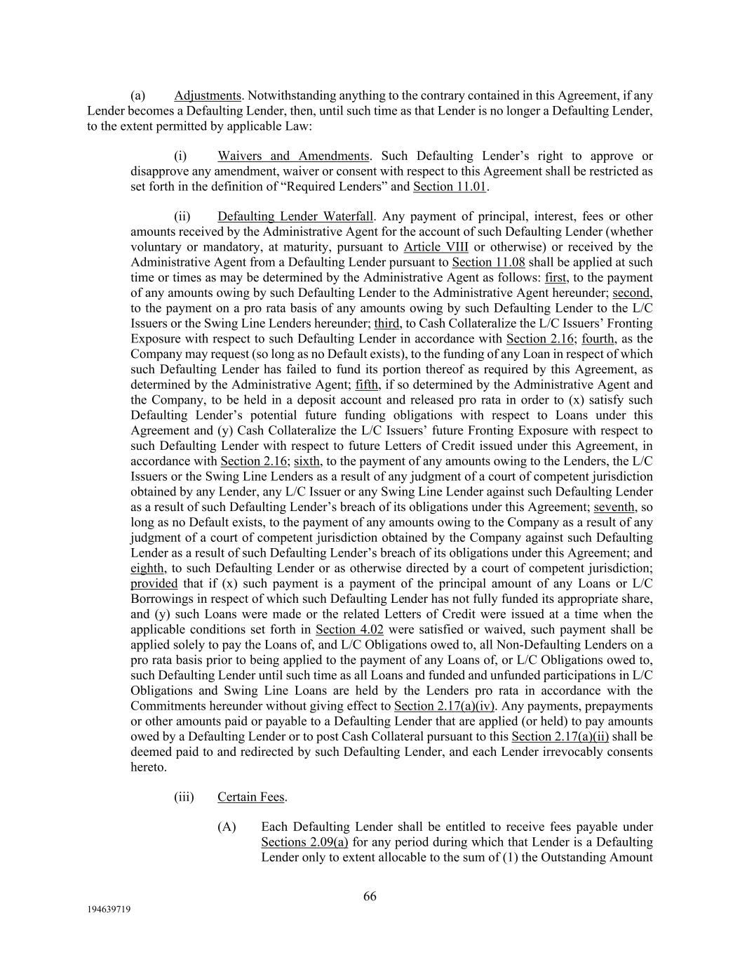 66 194639719 (a) Adjustments. Notwithstanding anything to the contrary contained in this Agreement, if any Lender becomes a Defaulting Lender, then, until such time as that Lender is no longer a Defaulting Lender, to the extent permitted by applicable Law: (i) Waivers and Amendments. Such Defaulting Lender’s right to approve or disapprove any amendment, waiver or consent with respect to this Agreement shall be restricted as set forth in the definition of “Required Lenders” and Section 11.01. (ii) Defaulting Lender Waterfall. Any payment of principal, interest, fees or other amounts received by the Administrative Agent for the account of such Defaulting Lender (whether voluntary or mandatory, at maturity, pursuant to Article VIII or otherwise) or received by the Administrative Agent from a Defaulting Lender pursuant to Section 11.08 shall be applied at such time or times as may be determined by the Administrative Agent as follows: first, to the payment of any amounts owing by such Defaulting Lender to the Administrative Agent hereunder; second, to the payment on a pro rata basis of any amounts owing by such Defaulting Lender to the L/C Issuers or the Swing Line Lenders hereunder; third, to Cash Collateralize the L/C Issuers’ Fronting Exposure with respect to such Defaulting Lender in accordance with Section 2.16; fourth, as the Company may request (so long as no Default exists), to the funding of any Loan in respect of which such Defaulting Lender has failed to fund its portion thereof as required by this Agreement, as determined by the Administrative Agent; fifth, if so determined by the Administrative Agent and the Company, to be held in a deposit account and released pro rata in order to (x) satisfy such Defaulting Lender’s potential future funding obligations with respect to Loans under this Agreement and (y) Cash Collateralize the L/C Issuers’ future Fronting Exposure with respect to such Defaulting Lender with respect to future Letters of Credit issued under this Agreement, in accordance with Section 2.16; sixth, to the payment of any amounts owing to the Lenders, the L/C Issuers or the Swing Line Lenders as a result of any judgment of a court of competent jurisdiction obtained by any Lender, any L/C Issuer or any Swing Line Lender against such Defaulting Lender as a result of such Defaulting Lender’s breach of its obligations under this Agreement; seventh, so long as no Default exists, to the payment of any amounts owing to the Company as a result of any judgment of a court of competent jurisdiction obtained by the Company against such Defaulting Lender as a result of such Defaulting Lender’s breach of its obligations under this Agreement; and eighth, to such Defaulting Lender or as otherwise directed by a court of competent jurisdiction; provided that if (x) such payment is a payment of the principal amount of any Loans or L/C Borrowings in respect of which such Defaulting Lender has not fully funded its appropriate share, and (y) such Loans were made or the related Letters of Credit were issued at a time when the applicable conditions set forth in Section 4.02 were satisfied or waived, such payment shall be applied solely to pay the Loans of, and L/C Obligations owed to, all Non-Defaulting Lenders on a pro rata basis prior to being applied to the payment of any Loans of, or L/C Obligations owed to, such Defaulting Lender until such time as all Loans and funded and unfunded participations in L/C Obligations and Swing Line Loans are held by the Lenders pro rata in accordance with the Commitments hereunder without giving effect to Section 2.17(a)(iv). Any payments, prepayments or other amounts paid or payable to a Defaulting Lender that are applied (or held) to pay amounts owed by a Defaulting Lender or to post Cash Collateral pursuant to this Section 2.17(a)(ii) shall be deemed paid to and redirected by such Defaulting Lender, and each Lender irrevocably consents hereto. (iii) Certain Fees. (A) Each Defaulting Lender shall be entitled to receive fees payable under Sections 2.09(a) for any period during which that Lender is a Defaulting Lender only to extent allocable to the sum of (1) the Outstanding Amount