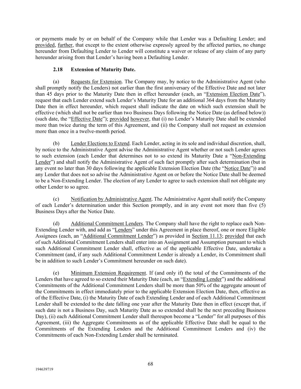 68 194639719 or payments made by or on behalf of the Company while that Lender was a Defaulting Lender; and provided, further, that except to the extent otherwise expressly agreed by the affected parties, no change hereunder from Defaulting Lender to Lender will constitute a waiver or release of any claim of any party hereunder arising from that Lender’s having been a Defaulting Lender. 2.18 Extension of Maturity Date. (a) Requests for Extension. The Company may, by notice to the Administrative Agent (who shall promptly notify the Lenders) not earlier than the first anniversary of the Effective Date and not later than 45 days prior to the Maturity Date then in effect hereunder (each, an “Extension Election Date”), request that each Lender extend such Lender’s Maturity Date for an additional 364 days from the Maturity Date then in effect hereunder, which request shall indicate the date on which such extension shall be effective (which shall not be earlier than two Business Days following the Notice Date (as defined below)) (such date, the “Effective Date”); provided however, that (i) no Lender’s Maturity Date shall be extended more than twice during the term of this Agreement, and (ii) the Company shall not request an extension more than once in a twelve-month period. (b) Lender Elections to Extend. Each Lender, acting in its sole and individual discretion, shall, by notice to the Administrative Agent advise the Administrative Agent whether or not such Lender agrees to such extension (each Lender that determines not to so extend its Maturity Date a “Non-Extending Lender”) and shall notify the Administrative Agent of such fact promptly after such determination (but in any event no later than 30 days following the applicable Extension Election Date (the “Notice Date”)) and any Lender that does not so advise the Administrative Agent on or before the Notice Date shall be deemed to be a Non-Extending Lender. The election of any Lender to agree to such extension shall not obligate any other Lender to so agree. (c) Notification by Administrative Agent. The Administrative Agent shall notify the Company of each Lender’s determination under this Section promptly, and in any event not more than five (5) Business Days after the Notice Date. (d) Additional Commitment Lenders. The Company shall have the right to replace each Non- Extending Lender with, and add as “Lenders” under this Agreement in place thereof, one or more Eligible Assignees (each, an “Additional Commitment Lender”) as provided in Section 11.13; provided that each of such Additional Commitment Lenders shall enter into an Assignment and Assumption pursuant to which such Additional Commitment Lender shall, effective as of the applicable Effective Date, undertake a Commitment (and, if any such Additional Commitment Lender is already a Lender, its Commitment shall be in addition to such Lender’s Commitment hereunder on such date). (e) Minimum Extension Requirement. If (and only if) the total of the Commitments of the Lenders that have agreed to so extend their Maturity Date (each, an “Extending Lender”) and the additional Commitments of the Additional Commitment Lenders shall be more than 50% of the aggregate amount of the Commitments in effect immediately prior to the applicable Extension Election Date, then, effective as of the Effective Date, (i) the Maturity Date of each Extending Lender and of each Additional Commitment Lender shall be extended to the date falling one year after the Maturity Date then in effect (except that, if such date is not a Business Day, such Maturity Date as so extended shall be the next preceding Business Day), (ii) each Additional Commitment Lender shall thereupon become a “Lender” for all purposes of this Agreement, (iii) the Aggregate Commitments as of the applicable Effective Date shall be equal to the Commitments of the Extending Lenders and the Additional Commitment Lenders and (iv) the Commitments of each Non-Extending Lender shall be terminated.