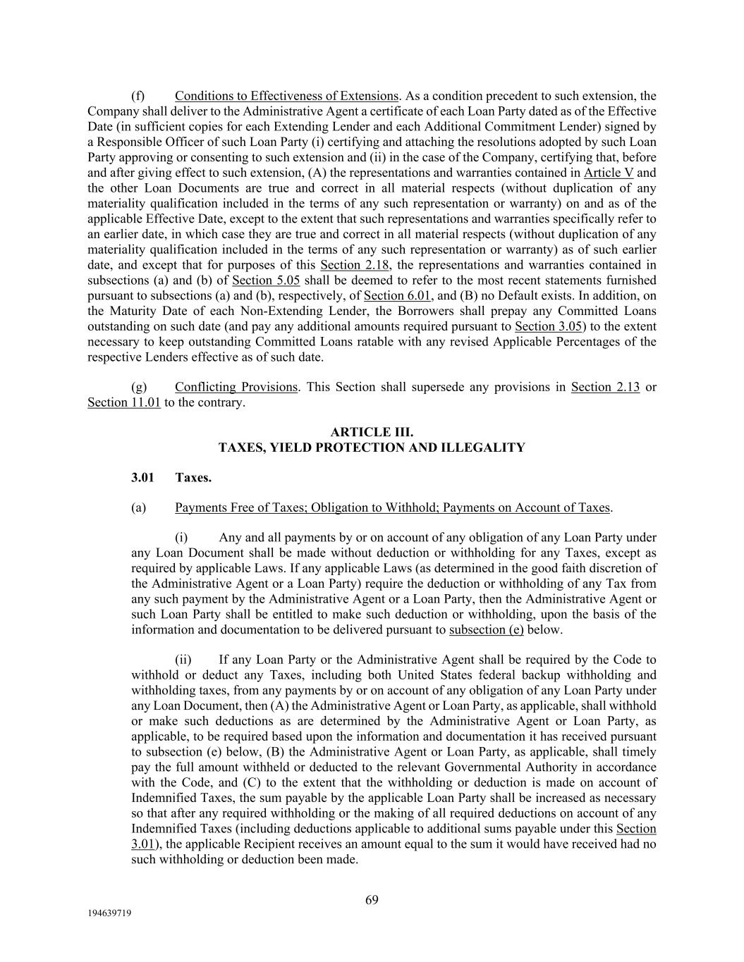 69 194639719 (f) Conditions to Effectiveness of Extensions. As a condition precedent to such extension, the Company shall deliver to the Administrative Agent a certificate of each Loan Party dated as of the Effective Date (in sufficient copies for each Extending Lender and each Additional Commitment Lender) signed by a Responsible Officer of such Loan Party (i) certifying and attaching the resolutions adopted by such Loan Party approving or consenting to such extension and (ii) in the case of the Company, certifying that, before and after giving effect to such extension, (A) the representations and warranties contained in Article V and the other Loan Documents are true and correct in all material respects (without duplication of any materiality qualification included in the terms of any such representation or warranty) on and as of the applicable Effective Date, except to the extent that such representations and warranties specifically refer to an earlier date, in which case they are true and correct in all material respects (without duplication of any materiality qualification included in the terms of any such representation or warranty) as of such earlier date, and except that for purposes of this Section 2.18, the representations and warranties contained in subsections (a) and (b) of Section 5.05 shall be deemed to refer to the most recent statements furnished pursuant to subsections (a) and (b), respectively, of Section 6.01, and (B) no Default exists. In addition, on the Maturity Date of each Non-Extending Lender, the Borrowers shall prepay any Committed Loans outstanding on such date (and pay any additional amounts required pursuant to Section 3.05) to the extent necessary to keep outstanding Committed Loans ratable with any revised Applicable Percentages of the respective Lenders effective as of such date. (g) Conflicting Provisions. This Section shall supersede any provisions in Section 2.13 or Section 11.01 to the contrary. ARTICLE III. TAXES, YIELD PROTECTION AND ILLEGALITY 3.01 Taxes. (a) Payments Free of Taxes; Obligation to Withhold; Payments on Account of Taxes. (i) Any and all payments by or on account of any obligation of any Loan Party under any Loan Document shall be made without deduction or withholding for any Taxes, except as required by applicable Laws. If any applicable Laws (as determined in the good faith discretion of the Administrative Agent or a Loan Party) require the deduction or withholding of any Tax from any such payment by the Administrative Agent or a Loan Party, then the Administrative Agent or such Loan Party shall be entitled to make such deduction or withholding, upon the basis of the information and documentation to be delivered pursuant to subsection (e) below. (ii) If any Loan Party or the Administrative Agent shall be required by the Code to withhold or deduct any Taxes, including both United States federal backup withholding and withholding taxes, from any payments by or on account of any obligation of any Loan Party under any Loan Document, then (A) the Administrative Agent or Loan Party, as applicable, shall withhold or make such deductions as are determined by the Administrative Agent or Loan Party, as applicable, to be required based upon the information and documentation it has received pursuant to subsection (e) below, (B) the Administrative Agent or Loan Party, as applicable, shall timely pay the full amount withheld or deducted to the relevant Governmental Authority in accordance with the Code, and (C) to the extent that the withholding or deduction is made on account of Indemnified Taxes, the sum payable by the applicable Loan Party shall be increased as necessary so that after any required withholding or the making of all required deductions on account of any Indemnified Taxes (including deductions applicable to additional sums payable under this Section 3.01), the applicable Recipient receives an amount equal to the sum it would have received had no such withholding or deduction been made.