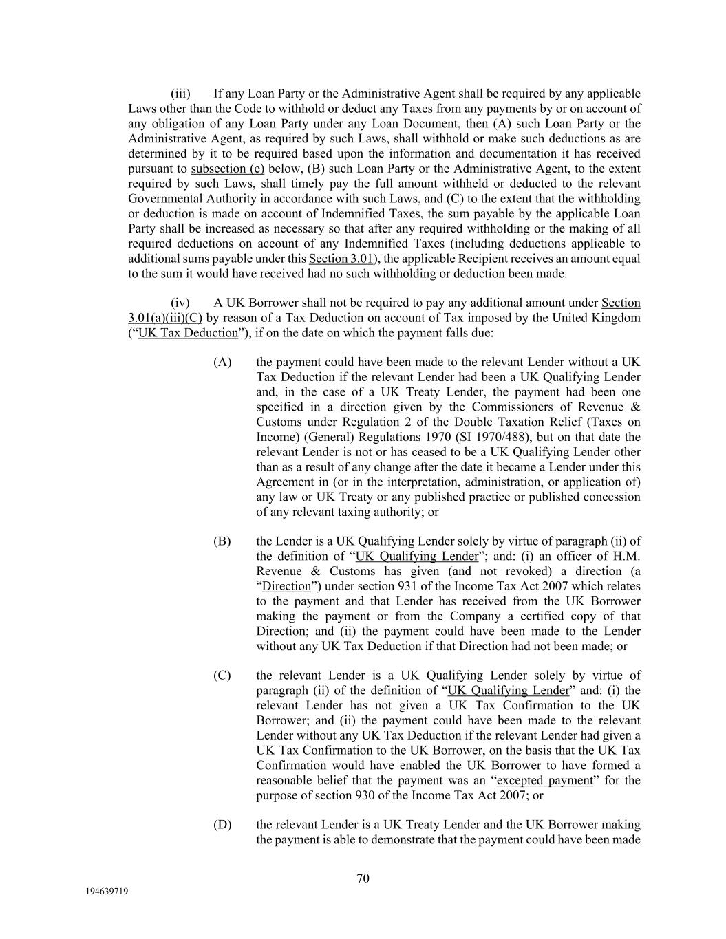 70 194639719 (iii) If any Loan Party or the Administrative Agent shall be required by any applicable Laws other than the Code to withhold or deduct any Taxes from any payments by or on account of any obligation of any Loan Party under any Loan Document, then (A) such Loan Party or the Administrative Agent, as required by such Laws, shall withhold or make such deductions as are determined by it to be required based upon the information and documentation it has received pursuant to subsection (e) below, (B) such Loan Party or the Administrative Agent, to the extent required by such Laws, shall timely pay the full amount withheld or deducted to the relevant Governmental Authority in accordance with such Laws, and (C) to the extent that the withholding or deduction is made on account of Indemnified Taxes, the sum payable by the applicable Loan Party shall be increased as necessary so that after any required withholding or the making of all required deductions on account of any Indemnified Taxes (including deductions applicable to additional sums payable under this Section 3.01), the applicable Recipient receives an amount equal to the sum it would have received had no such withholding or deduction been made. (iv) A UK Borrower shall not be required to pay any additional amount under Section 3.01(a)(iii)(C) by reason of a Tax Deduction on account of Tax imposed by the United Kingdom (“UK Tax Deduction”), if on the date on which the payment falls due: (A) the payment could have been made to the relevant Lender without a UK Tax Deduction if the relevant Lender had been a UK Qualifying Lender and, in the case of a UK Treaty Lender, the payment had been one specified in a direction given by the Commissioners of Revenue & Customs under Regulation 2 of the Double Taxation Relief (Taxes on Income) (General) Regulations 1970 (SI 1970/488), but on that date the relevant Lender is not or has ceased to be a UK Qualifying Lender other than as a result of any change after the date it became a Lender under this Agreement in (or in the interpretation, administration, or application of) any law or UK Treaty or any published practice or published concession of any relevant taxing authority; or (B) the Lender is a UK Qualifying Lender solely by virtue of paragraph (ii) of the definition of “UK Qualifying Lender”; and: (i) an officer of H.M. Revenue & Customs has given (and not revoked) a direction (a “Direction”) under section 931 of the Income Tax Act 2007 which relates to the payment and that Lender has received from the UK Borrower making the payment or from the Company a certified copy of that Direction; and (ii) the payment could have been made to the Lender without any UK Tax Deduction if that Direction had not been made; or (C) the relevant Lender is a UK Qualifying Lender solely by virtue of paragraph (ii) of the definition of “UK Qualifying Lender” and: (i) the relevant Lender has not given a UK Tax Confirmation to the UK Borrower; and (ii) the payment could have been made to the relevant Lender without any UK Tax Deduction if the relevant Lender had given a UK Tax Confirmation to the UK Borrower, on the basis that the UK Tax Confirmation would have enabled the UK Borrower to have formed a reasonable belief that the payment was an “excepted payment” for the purpose of section 930 of the Income Tax Act 2007; or (D) the relevant Lender is a UK Treaty Lender and the UK Borrower making the payment is able to demonstrate that the payment could have been made