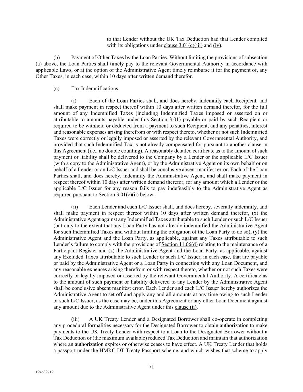 71 194639719 to that Lender without the UK Tax Deduction had that Lender complied with its obligations under clause 3.01(c)(iii) and (iv). (b) Payment of Other Taxes by the Loan Parties. Without limiting the provisions of subsection (a) above, the Loan Parties shall timely pay to the relevant Governmental Authority in accordance with applicable Laws, or at the option of the Administrative Agent timely reimburse it for the payment of, any Other Taxes, in each case, within 10 days after written demand therefor. (c) Tax Indemnifications. (i) Each of the Loan Parties shall, and does hereby, indemnify each Recipient, and shall make payment in respect thereof within 10 days after written demand therefor, for the full amount of any Indemnified Taxes (including Indemnified Taxes imposed or asserted on or attributable to amounts payable under this Section 3.01) payable or paid by such Recipient or required to be withheld or deducted from a payment to such Recipient, and any penalties, interest and reasonable expenses arising therefrom or with respect thereto, whether or not such Indemnified Taxes were correctly or legally imposed or asserted by the relevant Governmental Authority, and provided that such Indemnified Tax is not already compensated for pursuant to another clause in this Agreement (i.e., no double counting). A reasonably detailed certificate as to the amount of such payment or liability shall be delivered to the Company by a Lender or the applicable L/C Issuer (with a copy to the Administrative Agent), or by the Administrative Agent on its own behalf or on behalf of a Lender or an L/C Issuer and shall be conclusive absent manifest error. Each of the Loan Parties shall, and does hereby, indemnify the Administrative Agent, and shall make payment in respect thereof within 10 days after written demand therefor, for any amount which a Lender or the applicable L/C Issuer for any reason fails to pay indefeasibly to the Administrative Agent as required pursuant to Section 3.01(c)(ii) below. (ii) Each Lender and each L/C Issuer shall, and does hereby, severally indemnify, and shall make payment in respect thereof within 10 days after written demand therefor, (x) the Administrative Agent against any Indemnified Taxes attributable to such Lender or such L/C Issuer (but only to the extent that any Loan Party has not already indemnified the Administrative Agent for such Indemnified Taxes and without limiting the obligation of the Loan Party to do so), (y) the Administrative Agent and the Loan Party, as applicable, against any Taxes attributable to such Lender’s failure to comply with the provisions of Section 11.06(d) relating to the maintenance of a Participant Register and (z) the Administrative Agent and the Loan Party, as applicable, against any Excluded Taxes attributable to such Lender or such L/C Issuer, in each case, that are payable or paid by the Administrative Agent or a Loan Party in connection with any Loan Document, and any reasonable expenses arising therefrom or with respect thereto, whether or not such Taxes were correctly or legally imposed or asserted by the relevant Governmental Authority. A certificate as to the amount of such payment or liability delivered to any Lender by the Administrative Agent shall be conclusive absent manifest error. Each Lender and each L/C Issuer hereby authorizes the Administrative Agent to set off and apply any and all amounts at any time owing to such Lender or such L/C Issuer, as the case may be, under this Agreement or any other Loan Document against any amount due to the Administrative Agent under this clause (ii). (iii) A UK Treaty Lender and a Designated Borrower shall co-operate in completing any procedural formalities necessary for the Designated Borrower to obtain authorization to make payments to the UK Treaty Lender with respect to a Loan to the Designated Borrower without a Tax Deduction or (the maximum available) reduced Tax Deduction and maintain that authorization where an authorization expires or otherwise ceases to have effect. A UK Treaty Lender that holds a passport under the HMRC DT Treaty Passport scheme, and which wishes that scheme to apply