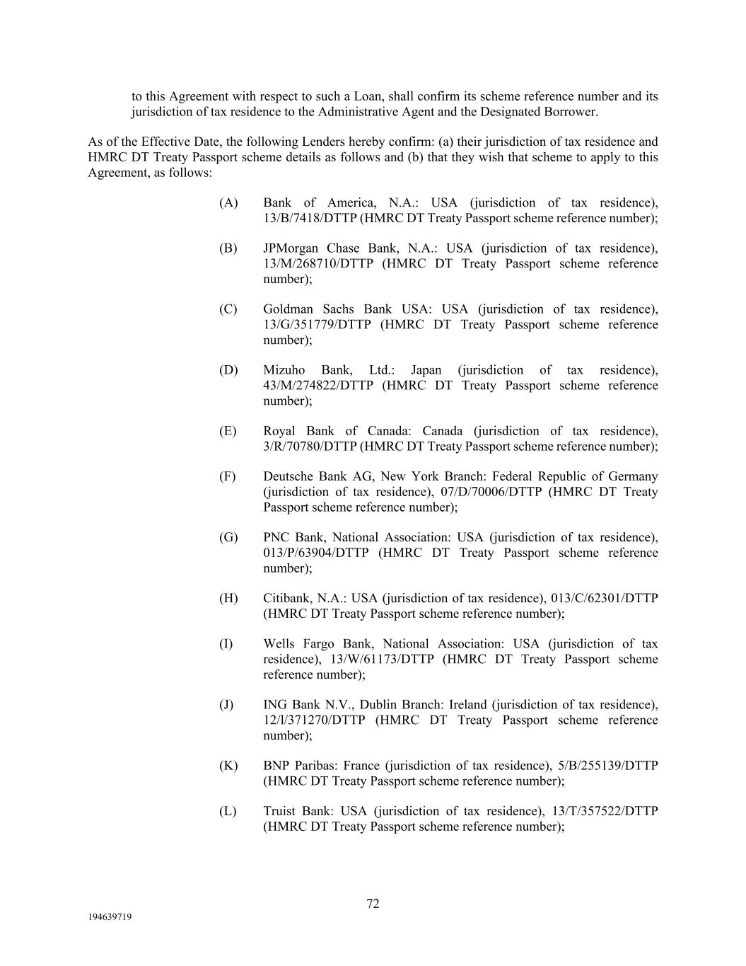 72 194639719 to this Agreement with respect to such a Loan, shall confirm its scheme reference number and its jurisdiction of tax residence to the Administrative Agent and the Designated Borrower. As of the Effective Date, the following Lenders hereby confirm: (a) their jurisdiction of tax residence and HMRC DT Treaty Passport scheme details as follows and (b) that they wish that scheme to apply to this Agreement, as follows: (A) Bank of America, N.A.: USA (jurisdiction of tax residence), 13/B/7418/DTTP (HMRC DT Treaty Passport scheme reference number); (B) JPMorgan Chase Bank, N.A.: USA (jurisdiction of tax residence), 13/M/268710/DTTP (HMRC DT Treaty Passport scheme reference number); (C) Goldman Sachs Bank USA: USA (jurisdiction of tax residence), 13/G/351779/DTTP (HMRC DT Treaty Passport scheme reference number); (D) Mizuho Bank, Ltd.: Japan (jurisdiction of tax residence), 43/M/274822/DTTP (HMRC DT Treaty Passport scheme reference number); (E) Royal Bank of Canada: Canada (jurisdiction of tax residence), 3/R/70780/DTTP (HMRC DT Treaty Passport scheme reference number); (F) Deutsche Bank AG, New York Branch: Federal Republic of Germany (jurisdiction of tax residence), 07/D/70006/DTTP (HMRC DT Treaty Passport scheme reference number); (G) PNC Bank, National Association: USA (jurisdiction of tax residence), 013/P/63904/DTTP (HMRC DT Treaty Passport scheme reference number); (H) Citibank, N.A.: USA (jurisdiction of tax residence), 013/C/62301/DTTP (HMRC DT Treaty Passport scheme reference number); (I) Wells Fargo Bank, National Association: USA (jurisdiction of tax residence), 13/W/61173/DTTP (HMRC DT Treaty Passport scheme reference number); (J) ING Bank N.V., Dublin Branch: Ireland (jurisdiction of tax residence), 12/l/371270/DTTP (HMRC DT Treaty Passport scheme reference number); (K) BNP Paribas: France (jurisdiction of tax residence), 5/B/255139/DTTP (HMRC DT Treaty Passport scheme reference number); (L) Truist Bank: USA (jurisdiction of tax residence), 13/T/357522/DTTP (HMRC DT Treaty Passport scheme reference number);