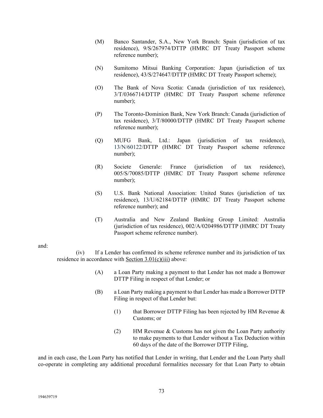 73 194639719 (M) Banco Santander, S.A., New York Branch: Spain (jurisdiction of tax residence), 9/S/267974/DTTP (HMRC DT Treaty Passport scheme reference number); (N) Sumitomo Mitsui Banking Corporation: Japan (jurisdiction of tax residence), 43/S/274647/DTTP (HMRC DT Treaty Passport scheme); (O) The Bank of Nova Scotia: Canada (jurisdiction of tax residence), 3/T/0366714/DTTP (HMRC DT Treaty Passport scheme reference number); (P) The Toronto-Dominion Bank, New York Branch: Canada (jurisdiction of tax residence), 3/T/80000/DTTP (HMRC DT Treaty Passport scheme reference number); (Q) MUFG Bank, Ltd.: Japan (jurisdiction of tax residence), 13/N/60122/DTTP (HMRC DT Treaty Passport scheme reference number); (R) Societe Generale: France (jurisdiction of tax residence), 005/S/70085/DTTP (HMRC DT Treaty Passport scheme reference number); (S) U.S. Bank National Association: United States (jurisdiction of tax residence), 13/U/62184/DTTP (HMRC DT Treaty Passport scheme reference number); and (T) Australia and New Zealand Banking Group Limited: Australia (jurisdiction of tax residence), 002/A/0204986/DTTP (HMRC DT Treaty Passport scheme reference number). and: (iv) If a Lender has confirmed its scheme reference number and its jurisdiction of tax residence in accordance with Section 3.01(c)(iii) above: (A) a Loan Party making a payment to that Lender has not made a Borrower DTTP Filing in respect of that Lender; or (B) a Loan Party making a payment to that Lender has made a Borrower DTTP Filing in respect of that Lender but: (1) that Borrower DTTP Filing has been rejected by HM Revenue & Customs; or (2) HM Revenue & Customs has not given the Loan Party authority to make payments to that Lender without a Tax Deduction within 60 days of the date of the Borrower DTTP Filing, and in each case, the Loan Party has notified that Lender in writing, that Lender and the Loan Party shall co-operate in completing any additional procedural formalities necessary for that Loan Party to obtain