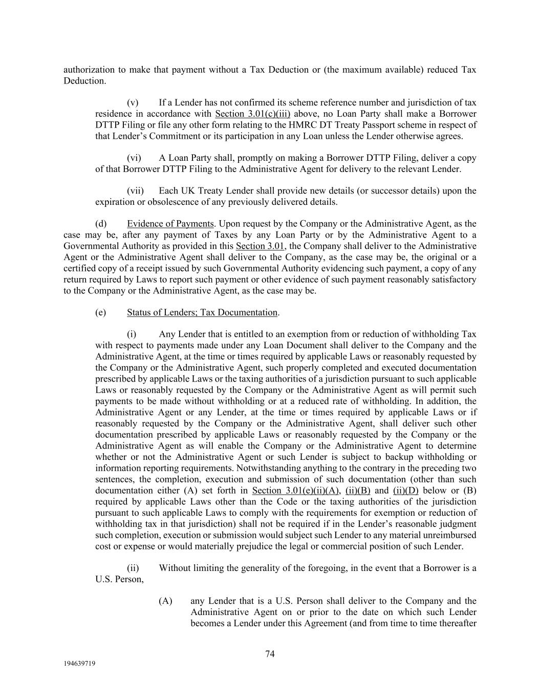 74 194639719 authorization to make that payment without a Tax Deduction or (the maximum available) reduced Tax Deduction. (v) If a Lender has not confirmed its scheme reference number and jurisdiction of tax residence in accordance with Section 3.01(c)(iii) above, no Loan Party shall make a Borrower DTTP Filing or file any other form relating to the HMRC DT Treaty Passport scheme in respect of that Lender’s Commitment or its participation in any Loan unless the Lender otherwise agrees. (vi) A Loan Party shall, promptly on making a Borrower DTTP Filing, deliver a copy of that Borrower DTTP Filing to the Administrative Agent for delivery to the relevant Lender. (vii) Each UK Treaty Lender shall provide new details (or successor details) upon the expiration or obsolescence of any previously delivered details. (d) Evidence of Payments. Upon request by the Company or the Administrative Agent, as the case may be, after any payment of Taxes by any Loan Party or by the Administrative Agent to a Governmental Authority as provided in this Section 3.01, the Company shall deliver to the Administrative Agent or the Administrative Agent shall deliver to the Company, as the case may be, the original or a certified copy of a receipt issued by such Governmental Authority evidencing such payment, a copy of any return required by Laws to report such payment or other evidence of such payment reasonably satisfactory to the Company or the Administrative Agent, as the case may be. (e) Status of Lenders; Tax Documentation. (i) Any Lender that is entitled to an exemption from or reduction of withholding Tax with respect to payments made under any Loan Document shall deliver to the Company and the Administrative Agent, at the time or times required by applicable Laws or reasonably requested by the Company or the Administrative Agent, such properly completed and executed documentation prescribed by applicable Laws or the taxing authorities of a jurisdiction pursuant to such applicable Laws or reasonably requested by the Company or the Administrative Agent as will permit such payments to be made without withholding or at a reduced rate of withholding. In addition, the Administrative Agent or any Lender, at the time or times required by applicable Laws or if reasonably requested by the Company or the Administrative Agent, shall deliver such other documentation prescribed by applicable Laws or reasonably requested by the Company or the Administrative Agent as will enable the Company or the Administrative Agent to determine whether or not the Administrative Agent or such Lender is subject to backup withholding or information reporting requirements. Notwithstanding anything to the contrary in the preceding two sentences, the completion, execution and submission of such documentation (other than such documentation either (A) set forth in Section 3.01(e)(ii)(A), (ii)(B) and (ii)(D) below or (B) required by applicable Laws other than the Code or the taxing authorities of the jurisdiction pursuant to such applicable Laws to comply with the requirements for exemption or reduction of withholding tax in that jurisdiction) shall not be required if in the Lender’s reasonable judgment such completion, execution or submission would subject such Lender to any material unreimbursed cost or expense or would materially prejudice the legal or commercial position of such Lender. (ii) Without limiting the generality of the foregoing, in the event that a Borrower is a U.S. Person, (A) any Lender that is a U.S. Person shall deliver to the Company and the Administrative Agent on or prior to the date on which such Lender becomes a Lender under this Agreement (and from time to time thereafter