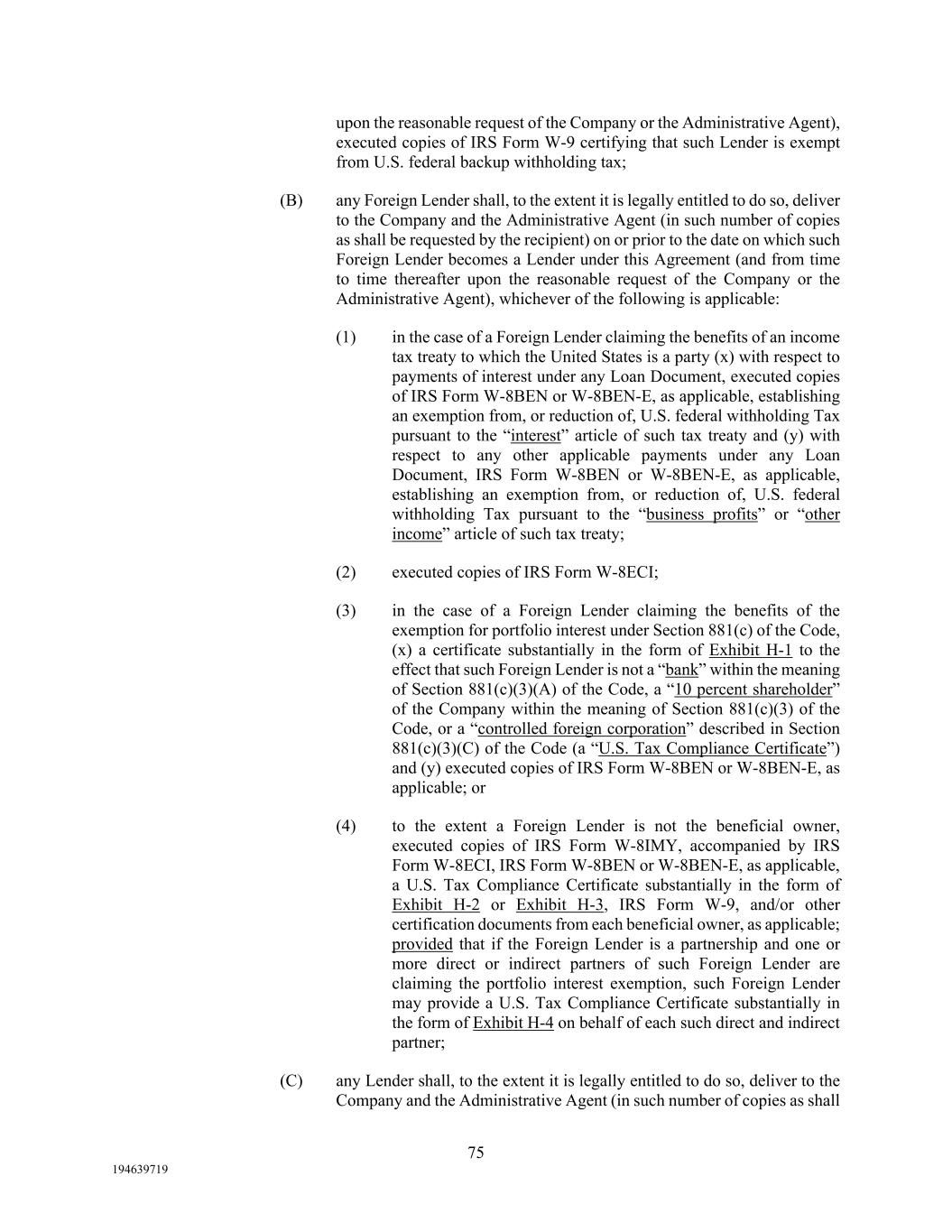 75 194639719 upon the reasonable request of the Company or the Administrative Agent), executed copies of IRS Form W-9 certifying that such Lender is exempt from U.S. federal backup withholding tax; (B) any Foreign Lender shall, to the extent it is legally entitled to do so, deliver to the Company and the Administrative Agent (in such number of copies as shall be requested by the recipient) on or prior to the date on which such Foreign Lender becomes a Lender under this Agreement (and from time to time thereafter upon the reasonable request of the Company or the Administrative Agent), whichever of the following is applicable: (1) in the case of a Foreign Lender claiming the benefits of an income tax treaty to which the United States is a party (x) with respect to payments of interest under any Loan Document, executed copies of IRS Form W-8BEN or W-8BEN-E, as applicable, establishing an exemption from, or reduction of, U.S. federal withholding Tax pursuant to the “interest” article of such tax treaty and (y) with respect to any other applicable payments under any Loan Document, IRS Form W-8BEN or W-8BEN-E, as applicable, establishing an exemption from, or reduction of, U.S. federal withholding Tax pursuant to the “business profits” or “other income” article of such tax treaty; (2) executed copies of IRS Form W-8ECI; (3) in the case of a Foreign Lender claiming the benefits of the exemption for portfolio interest under Section 881(c) of the Code, (x) a certificate substantially in the form of Exhibit H-1 to the effect that such Foreign Lender is not a “bank” within the meaning of Section 881(c)(3)(A) of the Code, a “10 percent shareholder” of the Company within the meaning of Section 881(c)(3) of the Code, or a “controlled foreign corporation” described in Section 881(c)(3)(C) of the Code (a “U.S. Tax Compliance Certificate”) and (y) executed copies of IRS Form W-8BEN or W-8BEN-E, as applicable; or (4) to the extent a Foreign Lender is not the beneficial owner, executed copies of IRS Form W-8IMY, accompanied by IRS Form W-8ECI, IRS Form W-8BEN or W-8BEN-E, as applicable, a U.S. Tax Compliance Certificate substantially in the form of Exhibit H-2 or Exhibit H-3, IRS Form W-9, and/or other certification documents from each beneficial owner, as applicable; provided that if the Foreign Lender is a partnership and one or more direct or indirect partners of such Foreign Lender are claiming the portfolio interest exemption, such Foreign Lender may provide a U.S. Tax Compliance Certificate substantially in the form of Exhibit H-4 on behalf of each such direct and indirect partner; (C) any Lender shall, to the extent it is legally entitled to do so, deliver to the Company and the Administrative Agent (in such number of copies as shall