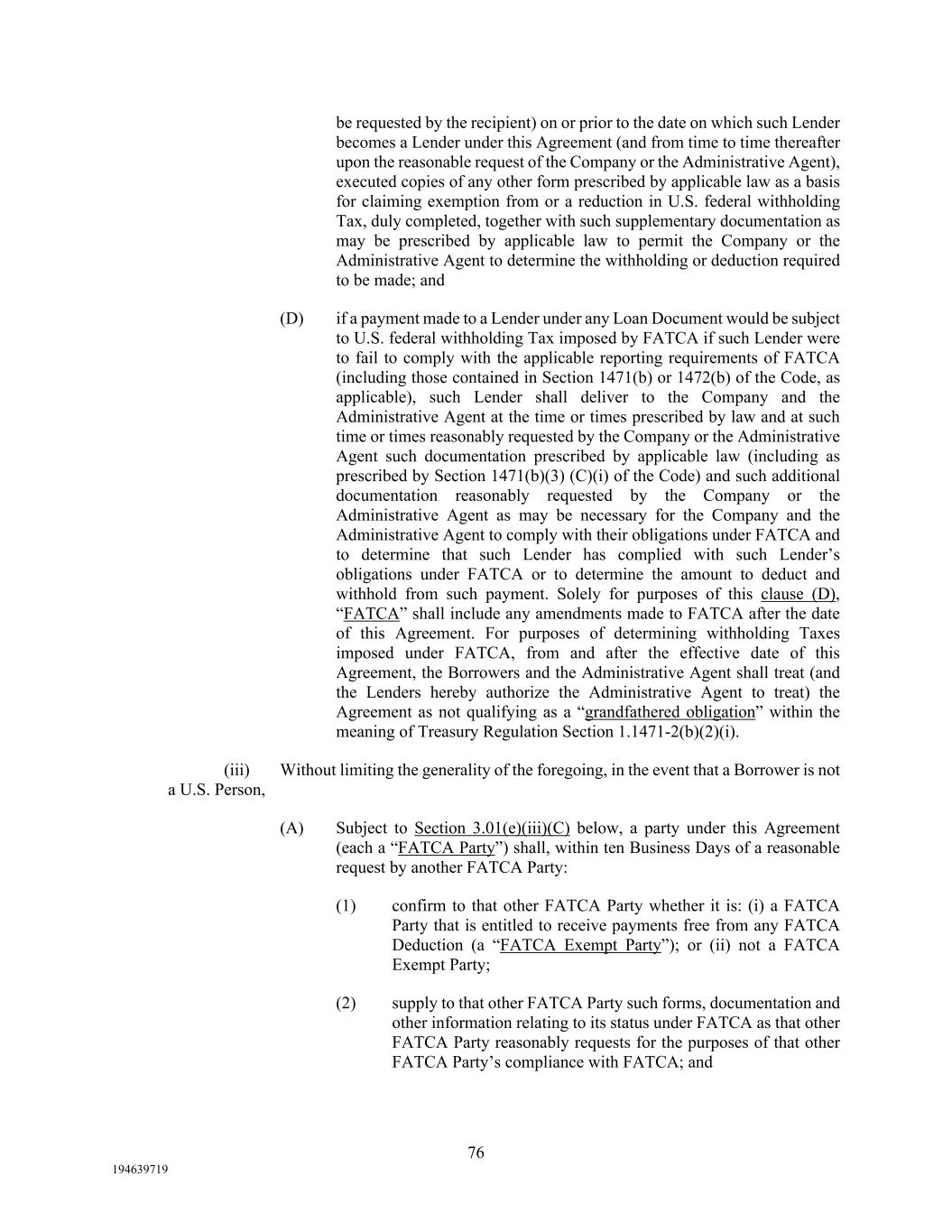 76 194639719 be requested by the recipient) on or prior to the date on which such Lender becomes a Lender under this Agreement (and from time to time thereafter upon the reasonable request of the Company or the Administrative Agent), executed copies of any other form prescribed by applicable law as a basis for claiming exemption from or a reduction in U.S. federal withholding Tax, duly completed, together with such supplementary documentation as may be prescribed by applicable law to permit the Company or the Administrative Agent to determine the withholding or deduction required to be made; and (D) if a payment made to a Lender under any Loan Document would be subject to U.S. federal withholding Tax imposed by FATCA if such Lender were to fail to comply with the applicable reporting requirements of FATCA (including those contained in Section 1471(b) or 1472(b) of the Code, as applicable), such Lender shall deliver to the Company and the Administrative Agent at the time or times prescribed by law and at such time or times reasonably requested by the Company or the Administrative Agent such documentation prescribed by applicable law (including as prescribed by Section 1471(b)(3) (C)(i) of the Code) and such additional documentation reasonably requested by the Company or the Administrative Agent as may be necessary for the Company and the Administrative Agent to comply with their obligations under FATCA and to determine that such Lender has complied with such Lender’s obligations under FATCA or to determine the amount to deduct and withhold from such payment. Solely for purposes of this clause (D), “FATCA” shall include any amendments made to FATCA after the date of this Agreement. For purposes of determining withholding Taxes imposed under FATCA, from and after the effective date of this Agreement, the Borrowers and the Administrative Agent shall treat (and the Lenders hereby authorize the Administrative Agent to treat) the Agreement as not qualifying as a “grandfathered obligation” within the meaning of Treasury Regulation Section 1.1471-2(b)(2)(i). (iii) Without limiting the generality of the foregoing, in the event that a Borrower is not a U.S. Person, (A) Subject to Section 3.01(e)(iii)(C) below, a party under this Agreement (each a “FATCA Party”) shall, within ten Business Days of a reasonable request by another FATCA Party: (1) confirm to that other FATCA Party whether it is: (i) a FATCA Party that is entitled to receive payments free from any FATCA Deduction (a “FATCA Exempt Party”); or (ii) not a FATCA Exempt Party; (2) supply to that other FATCA Party such forms, documentation and other information relating to its status under FATCA as that other FATCA Party reasonably requests for the purposes of that other FATCA Party’s compliance with FATCA; and