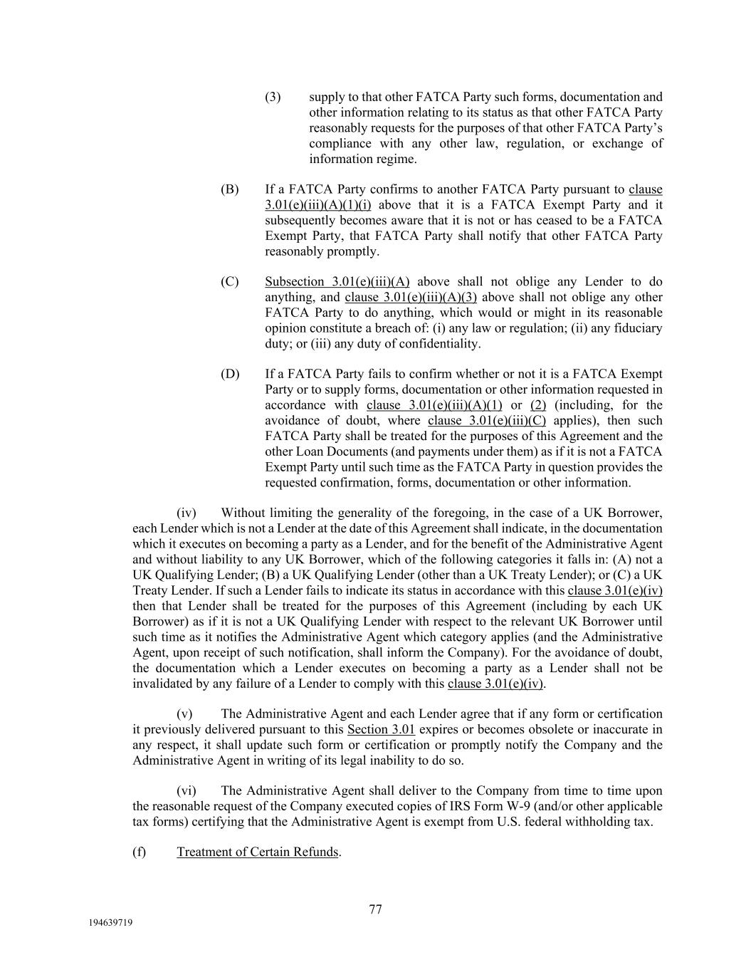 77 194639719 (3) supply to that other FATCA Party such forms, documentation and other information relating to its status as that other FATCA Party reasonably requests for the purposes of that other FATCA Party’s compliance with any other law, regulation, or exchange of information regime. (B) If a FATCA Party confirms to another FATCA Party pursuant to clause 3.01(e)(iii)(A)(1)(i) above that it is a FATCA Exempt Party and it subsequently becomes aware that it is not or has ceased to be a FATCA Exempt Party, that FATCA Party shall notify that other FATCA Party reasonably promptly. (C) Subsection 3.01(e)(iii)(A) above shall not oblige any Lender to do anything, and clause 3.01(e)(iii)(A)(3) above shall not oblige any other FATCA Party to do anything, which would or might in its reasonable opinion constitute a breach of: (i) any law or regulation; (ii) any fiduciary duty; or (iii) any duty of confidentiality. (D) If a FATCA Party fails to confirm whether or not it is a FATCA Exempt Party or to supply forms, documentation or other information requested in accordance with clause 3.01(e)(iii)(A)(1) or (2) (including, for the avoidance of doubt, where clause 3.01(e)(iii)(C) applies), then such FATCA Party shall be treated for the purposes of this Agreement and the other Loan Documents (and payments under them) as if it is not a FATCA Exempt Party until such time as the FATCA Party in question provides the requested confirmation, forms, documentation or other information. (iv) Without limiting the generality of the foregoing, in the case of a UK Borrower, each Lender which is not a Lender at the date of this Agreement shall indicate, in the documentation which it executes on becoming a party as a Lender, and for the benefit of the Administrative Agent and without liability to any UK Borrower, which of the following categories it falls in: (A) not a UK Qualifying Lender; (B) a UK Qualifying Lender (other than a UK Treaty Lender); or (C) a UK Treaty Lender. If such a Lender fails to indicate its status in accordance with this clause 3.01(e)(iv) then that Lender shall be treated for the purposes of this Agreement (including by each UK Borrower) as if it is not a UK Qualifying Lender with respect to the relevant UK Borrower until such time as it notifies the Administrative Agent which category applies (and the Administrative Agent, upon receipt of such notification, shall inform the Company). For the avoidance of doubt, the documentation which a Lender executes on becoming a party as a Lender shall not be invalidated by any failure of a Lender to comply with this clause 3.01(e)(iv). (v) The Administrative Agent and each Lender agree that if any form or certification it previously delivered pursuant to this Section 3.01 expires or becomes obsolete or inaccurate in any respect, it shall update such form or certification or promptly notify the Company and the Administrative Agent in writing of its legal inability to do so. (vi) The Administrative Agent shall deliver to the Company from time to time upon the reasonable request of the Company executed copies of IRS Form W-9 (and/or other applicable tax forms) certifying that the Administrative Agent is exempt from U.S. federal withholding tax. (f) Treatment of Certain Refunds.