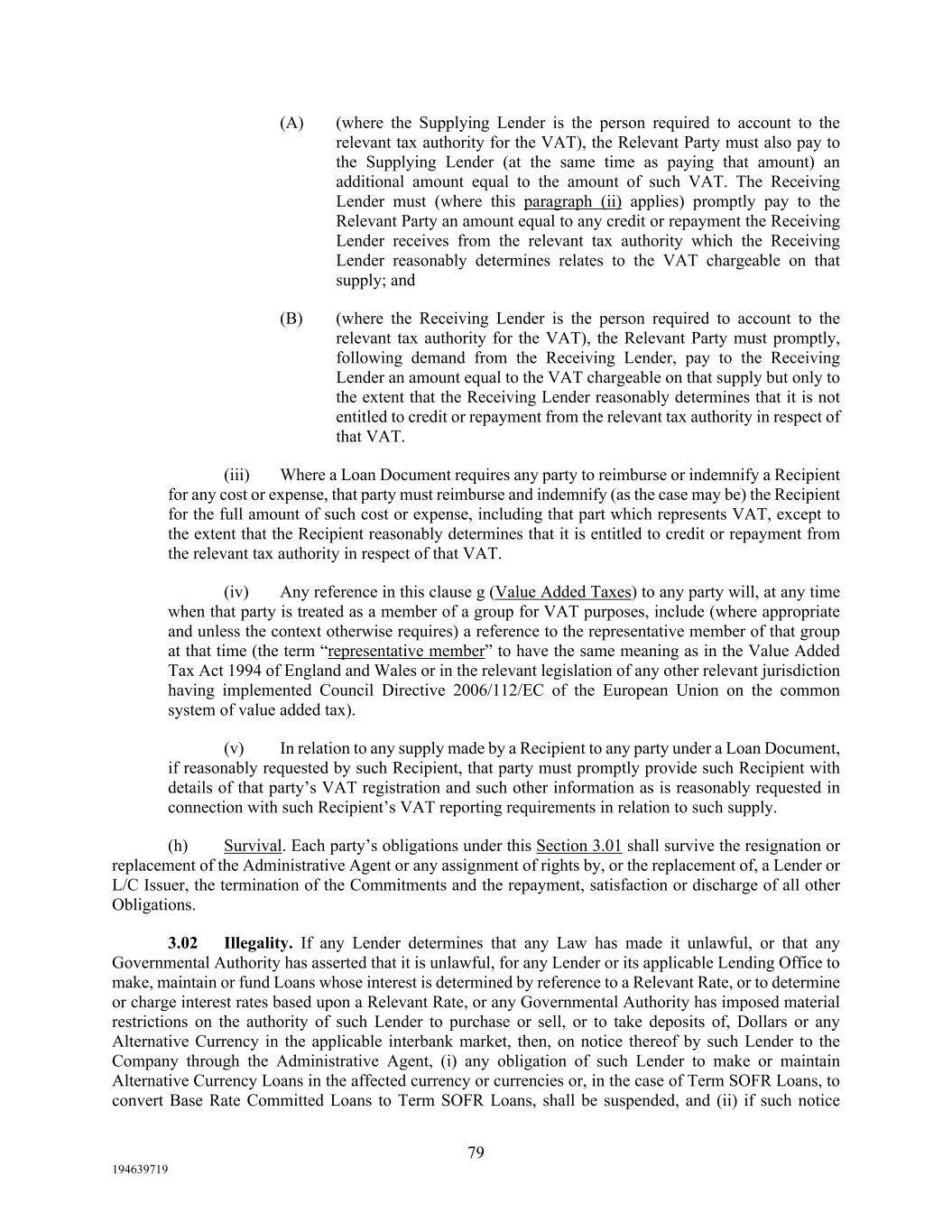 79 194639719 (A) (where the Supplying Lender is the person required to account to the relevant tax authority for the VAT), the Relevant Party must also pay to the Supplying Lender (at the same time as paying that amount) an additional amount equal to the amount of such VAT. The Receiving Lender must (where this paragraph (ii) applies) promptly pay to the Relevant Party an amount equal to any credit or repayment the Receiving Lender receives from the relevant tax authority which the Receiving Lender reasonably determines relates to the VAT chargeable on that supply; and (B) (where the Receiving Lender is the person required to account to the relevant tax authority for the VAT), the Relevant Party must promptly, following demand from the Receiving Lender, pay to the Receiving Lender an amount equal to the VAT chargeable on that supply but only to the extent that the Receiving Lender reasonably determines that it is not entitled to credit or repayment from the relevant tax authority in respect of that VAT. (iii) Where a Loan Document requires any party to reimburse or indemnify a Recipient for any cost or expense, that party must reimburse and indemnify (as the case may be) the Recipient for the full amount of such cost or expense, including that part which represents VAT, except to the extent that the Recipient reasonably determines that it is entitled to credit or repayment from the relevant tax authority in respect of that VAT. (iv) Any reference in this clause g (Value Added Taxes) to any party will, at any time when that party is treated as a member of a group for VAT purposes, include (where appropriate and unless the context otherwise requires) a reference to the representative member of that group at that time (the term “representative member” to have the same meaning as in the Value Added Tax Act 1994 of England and Wales or in the relevant legislation of any other relevant jurisdiction having implemented Council Directive 2006/112/EC of the European Union on the common system of value added tax). (v) In relation to any supply made by a Recipient to any party under a Loan Document, if reasonably requested by such Recipient, that party must promptly provide such Recipient with details of that party’s VAT registration and such other information as is reasonably requested in connection with such Recipient’s VAT reporting requirements in relation to such supply. (h) Survival. Each party’s obligations under this Section 3.01 shall survive the resignation or replacement of the Administrative Agent or any assignment of rights by, or the replacement of, a Lender or L/C Issuer, the termination of the Commitments and the repayment, satisfaction or discharge of all other Obligations. 3.02 Illegality. If any Lender determines that any Law has made it unlawful, or that any Governmental Authority has asserted that it is unlawful, for any Lender or its applicable Lending Office to make, maintain or fund Loans whose interest is determined by reference to a Relevant Rate, or to determine or charge interest rates based upon a Relevant Rate, or any Governmental Authority has imposed material restrictions on the authority of such Lender to purchase or sell, or to take deposits of, Dollars or any Alternative Currency in the applicable interbank market, then, on notice thereof by such Lender to the Company through the Administrative Agent, (i) any obligation of such Lender to make or maintain Alternative Currency Loans in the affected currency or currencies or, in the case of Term SOFR Loans, to convert Base Rate Committed Loans to Term SOFR Loans, shall be suspended, and (ii) if such notice
