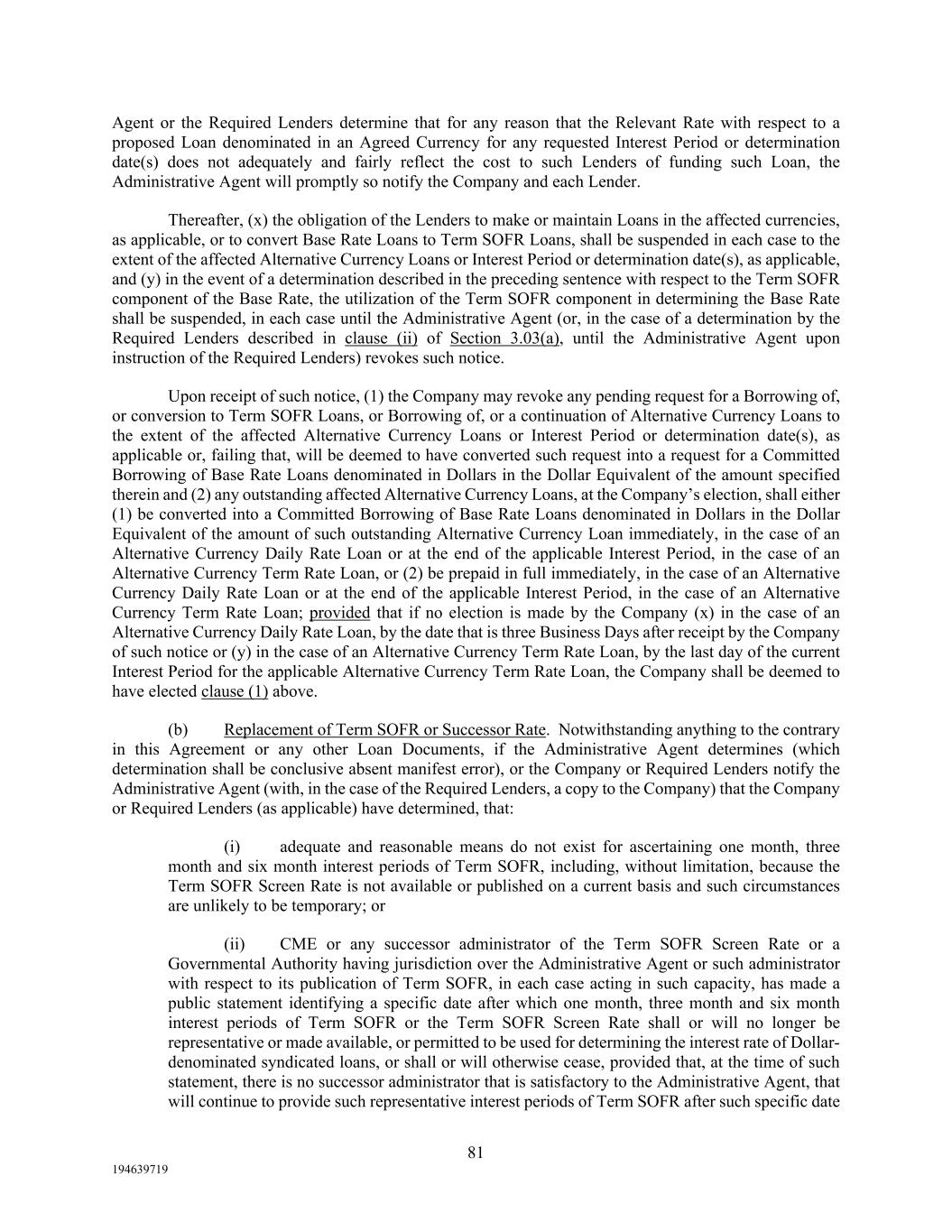 81 194639719 Agent or the Required Lenders determine that for any reason that the Relevant Rate with respect to a proposed Loan denominated in an Agreed Currency for any requested Interest Period or determination date(s) does not adequately and fairly reflect the cost to such Lenders of funding such Loan, the Administrative Agent will promptly so notify the Company and each Lender. Thereafter, (x) the obligation of the Lenders to make or maintain Loans in the affected currencies, as applicable, or to convert Base Rate Loans to Term SOFR Loans, shall be suspended in each case to the extent of the affected Alternative Currency Loans or Interest Period or determination date(s), as applicable, and (y) in the event of a determination described in the preceding sentence with respect to the Term SOFR component of the Base Rate, the utilization of the Term SOFR component in determining the Base Rate shall be suspended, in each case until the Administrative Agent (or, in the case of a determination by the Required Lenders described in clause (ii) of Section 3.03(a), until the Administrative Agent upon instruction of the Required Lenders) revokes such notice. Upon receipt of such notice, (1) the Company may revoke any pending request for a Borrowing of, or conversion to Term SOFR Loans, or Borrowing of, or a continuation of Alternative Currency Loans to the extent of the affected Alternative Currency Loans or Interest Period or determination date(s), as applicable or, failing that, will be deemed to have converted such request into a request for a Committed Borrowing of Base Rate Loans denominated in Dollars in the Dollar Equivalent of the amount specified therein and (2) any outstanding affected Alternative Currency Loans, at the Company’s election, shall either (1) be converted into a Committed Borrowing of Base Rate Loans denominated in Dollars in the Dollar Equivalent of the amount of such outstanding Alternative Currency Loan immediately, in the case of an Alternative Currency Daily Rate Loan or at the end of the applicable Interest Period, in the case of an Alternative Currency Term Rate Loan, or (2) be prepaid in full immediately, in the case of an Alternative Currency Daily Rate Loan or at the end of the applicable Interest Period, in the case of an Alternative Currency Term Rate Loan; provided that if no election is made by the Company (x) in the case of an Alternative Currency Daily Rate Loan, by the date that is three Business Days after receipt by the Company of such notice or (y) in the case of an Alternative Currency Term Rate Loan, by the last day of the current Interest Period for the applicable Alternative Currency Term Rate Loan, the Company shall be deemed to have elected clause (1) above. (b) Replacement of Term SOFR or Successor Rate. Notwithstanding anything to the contrary in this Agreement or any other Loan Documents, if the Administrative Agent determines (which determination shall be conclusive absent manifest error), or the Company or Required Lenders notify the Administrative Agent (with, in the case of the Required Lenders, a copy to the Company) that the Company or Required Lenders (as applicable) have determined, that: (i) adequate and reasonable means do not exist for ascertaining one month, three month and six month interest periods of Term SOFR, including, without limitation, because the Term SOFR Screen Rate is not available or published on a current basis and such circumstances are unlikely to be temporary; or (ii) CME or any successor administrator of the Term SOFR Screen Rate or a Governmental Authority having jurisdiction over the Administrative Agent or such administrator with respect to its publication of Term SOFR, in each case acting in such capacity, has made a public statement identifying a specific date after which one month, three month and six month interest periods of Term SOFR or the Term SOFR Screen Rate shall or will no longer be representative or made available, or permitted to be used for determining the interest rate of Dollar- denominated syndicated loans, or shall or will otherwise cease, provided that, at the time of such statement, there is no successor administrator that is satisfactory to the Administrative Agent, that will continue to provide such representative interest periods of Term SOFR after such specific date