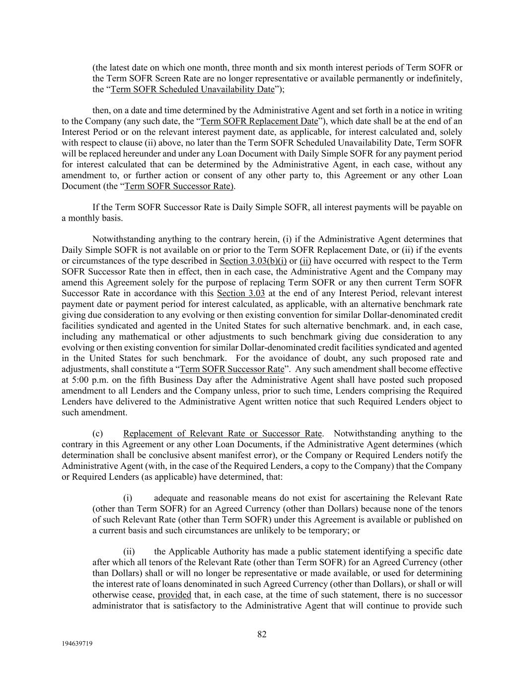 82 194639719 (the latest date on which one month, three month and six month interest periods of Term SOFR or the Term SOFR Screen Rate are no longer representative or available permanently or indefinitely, the “Term SOFR Scheduled Unavailability Date”); then, on a date and time determined by the Administrative Agent and set forth in a notice in writing to the Company (any such date, the “Term SOFR Replacement Date”), which date shall be at the end of an Interest Period or on the relevant interest payment date, as applicable, for interest calculated and, solely with respect to clause (ii) above, no later than the Term SOFR Scheduled Unavailability Date, Term SOFR will be replaced hereunder and under any Loan Document with Daily Simple SOFR for any payment period for interest calculated that can be determined by the Administrative Agent, in each case, without any amendment to, or further action or consent of any other party to, this Agreement or any other Loan Document (the “Term SOFR Successor Rate). If the Term SOFR Successor Rate is Daily Simple SOFR, all interest payments will be payable on a monthly basis. Notwithstanding anything to the contrary herein, (i) if the Administrative Agent determines that Daily Simple SOFR is not available on or prior to the Term SOFR Replacement Date, or (ii) if the events or circumstances of the type described in Section 3.03(b)(i) or (ii) have occurred with respect to the Term SOFR Successor Rate then in effect, then in each case, the Administrative Agent and the Company may amend this Agreement solely for the purpose of replacing Term SOFR or any then current Term SOFR Successor Rate in accordance with this Section 3.03 at the end of any Interest Period, relevant interest payment date or payment period for interest calculated, as applicable, with an alternative benchmark rate giving due consideration to any evolving or then existing convention for similar Dollar-denominated credit facilities syndicated and agented in the United States for such alternative benchmark. and, in each case, including any mathematical or other adjustments to such benchmark giving due consideration to any evolving or then existing convention for similar Dollar-denominated credit facilities syndicated and agented in the United States for such benchmark. For the avoidance of doubt, any such proposed rate and adjustments, shall constitute a “Term SOFR Successor Rate”. Any such amendment shall become effective at 5:00 p.m. on the fifth Business Day after the Administrative Agent shall have posted such proposed amendment to all Lenders and the Company unless, prior to such time, Lenders comprising the Required Lenders have delivered to the Administrative Agent written notice that such Required Lenders object to such amendment. (c) Replacement of Relevant Rate or Successor Rate. Notwithstanding anything to the contrary in this Agreement or any other Loan Documents, if the Administrative Agent determines (which determination shall be conclusive absent manifest error), or the Company or Required Lenders notify the Administrative Agent (with, in the case of the Required Lenders, a copy to the Company) that the Company or Required Lenders (as applicable) have determined, that: (i) adequate and reasonable means do not exist for ascertaining the Relevant Rate (other than Term SOFR) for an Agreed Currency (other than Dollars) because none of the tenors of such Relevant Rate (other than Term SOFR) under this Agreement is available or published on a current basis and such circumstances are unlikely to be temporary; or (ii) the Applicable Authority has made a public statement identifying a specific date after which all tenors of the Relevant Rate (other than Term SOFR) for an Agreed Currency (other than Dollars) shall or will no longer be representative or made available, or used for determining the interest rate of loans denominated in such Agreed Currency (other than Dollars), or shall or will otherwise cease, provided that, in each case, at the time of such statement, there is no successor administrator that is satisfactory to the Administrative Agent that will continue to provide such