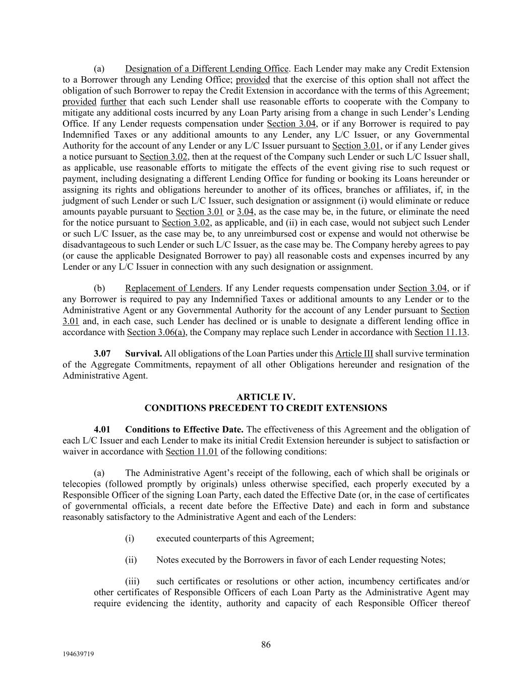 86 194639719 (a) Designation of a Different Lending Office. Each Lender may make any Credit Extension to a Borrower through any Lending Office; provided that the exercise of this option shall not affect the obligation of such Borrower to repay the Credit Extension in accordance with the terms of this Agreement; provided further that each such Lender shall use reasonable efforts to cooperate with the Company to mitigate any additional costs incurred by any Loan Party arising from a change in such Lender’s Lending Office. If any Lender requests compensation under Section 3.04, or if any Borrower is required to pay Indemnified Taxes or any additional amounts to any Lender, any L/C Issuer, or any Governmental Authority for the account of any Lender or any L/C Issuer pursuant to Section 3.01, or if any Lender gives a notice pursuant to Section 3.02, then at the request of the Company such Lender or such L/C Issuer shall, as applicable, use reasonable efforts to mitigate the effects of the event giving rise to such request or payment, including designating a different Lending Office for funding or booking its Loans hereunder or assigning its rights and obligations hereunder to another of its offices, branches or affiliates, if, in the judgment of such Lender or such L/C Issuer, such designation or assignment (i) would eliminate or reduce amounts payable pursuant to Section 3.01 or 3.04, as the case may be, in the future, or eliminate the need for the notice pursuant to Section 3.02, as applicable, and (ii) in each case, would not subject such Lender or such L/C Issuer, as the case may be, to any unreimbursed cost or expense and would not otherwise be disadvantageous to such Lender or such L/C Issuer, as the case may be. The Company hereby agrees to pay (or cause the applicable Designated Borrower to pay) all reasonable costs and expenses incurred by any Lender or any L/C Issuer in connection with any such designation or assignment. (b) Replacement of Lenders. If any Lender requests compensation under Section 3.04, or if any Borrower is required to pay any Indemnified Taxes or additional amounts to any Lender or to the Administrative Agent or any Governmental Authority for the account of any Lender pursuant to Section 3.01 and, in each case, such Lender has declined or is unable to designate a different lending office in accordance with Section 3.06(a), the Company may replace such Lender in accordance with Section 11.13. 3.07 Survival. All obligations of the Loan Parties under this Article III shall survive termination of the Aggregate Commitments, repayment of all other Obligations hereunder and resignation of the Administrative Agent. ARTICLE IV. CONDITIONS PRECEDENT TO CREDIT EXTENSIONS 4.01 Conditions to Effective Date. The effectiveness of this Agreement and the obligation of each L/C Issuer and each Lender to make its initial Credit Extension hereunder is subject to satisfaction or waiver in accordance with Section 11.01 of the following conditions: (a) The Administrative Agent’s receipt of the following, each of which shall be originals or telecopies (followed promptly by originals) unless otherwise specified, each properly executed by a Responsible Officer of the signing Loan Party, each dated the Effective Date (or, in the case of certificates of governmental officials, a recent date before the Effective Date) and each in form and substance reasonably satisfactory to the Administrative Agent and each of the Lenders: (i) executed counterparts of this Agreement; (ii) Notes executed by the Borrowers in favor of each Lender requesting Notes; (iii) such certificates or resolutions or other action, incumbency certificates and/or other certificates of Responsible Officers of each Loan Party as the Administrative Agent may require evidencing the identity, authority and capacity of each Responsible Officer thereof