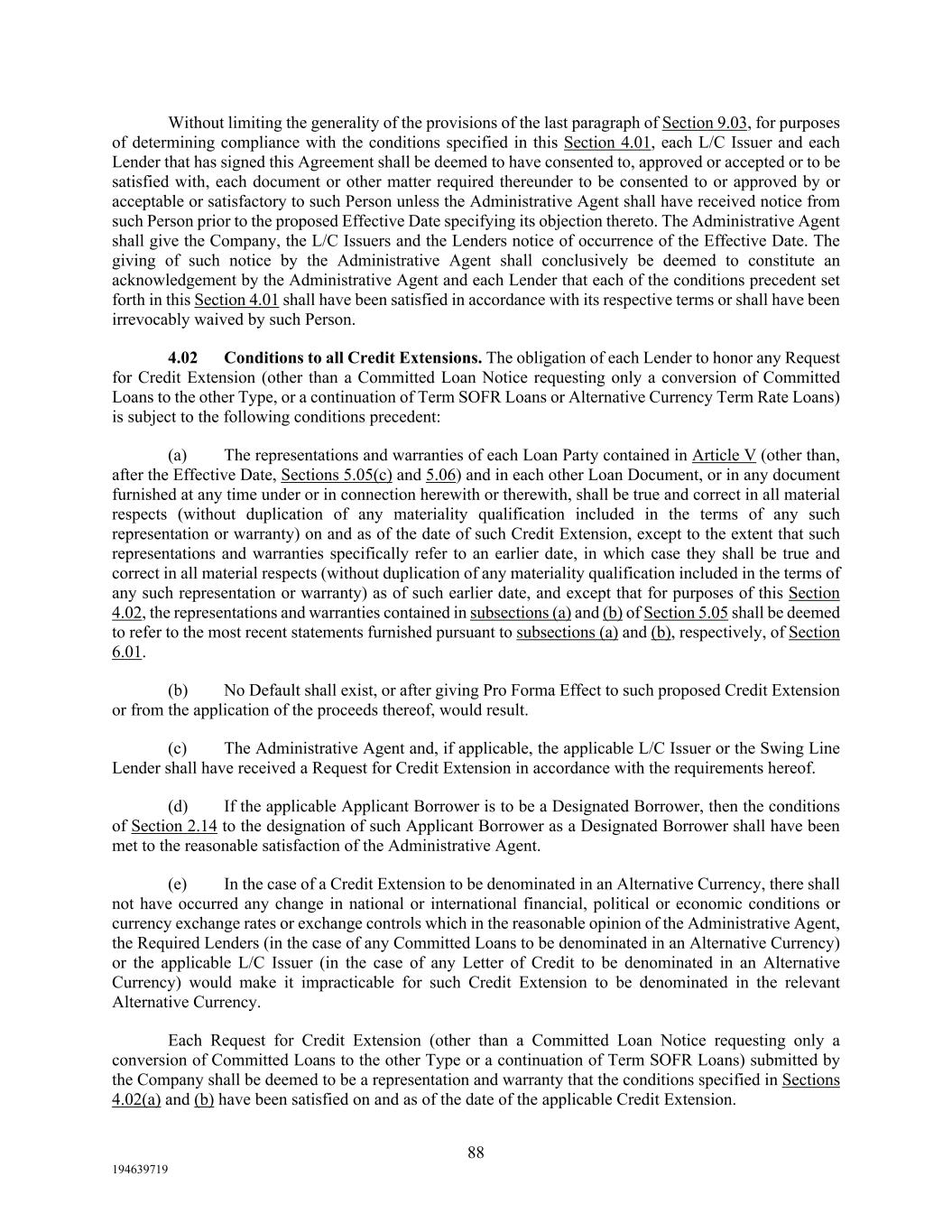88 194639719 Without limiting the generality of the provisions of the last paragraph of Section 9.03, for purposes of determining compliance with the conditions specified in this Section 4.01, each L/C Issuer and each Lender that has signed this Agreement shall be deemed to have consented to, approved or accepted or to be satisfied with, each document or other matter required thereunder to be consented to or approved by or acceptable or satisfactory to such Person unless the Administrative Agent shall have received notice from such Person prior to the proposed Effective Date specifying its objection thereto. The Administrative Agent shall give the Company, the L/C Issuers and the Lenders notice of occurrence of the Effective Date. The giving of such notice by the Administrative Agent shall conclusively be deemed to constitute an acknowledgement by the Administrative Agent and each Lender that each of the conditions precedent set forth in this Section 4.01 shall have been satisfied in accordance with its respective terms or shall have been irrevocably waived by such Person. 4.02 Conditions to all Credit Extensions. The obligation of each Lender to honor any Request for Credit Extension (other than a Committed Loan Notice requesting only a conversion of Committed Loans to the other Type, or a continuation of Term SOFR Loans or Alternative Currency Term Rate Loans) is subject to the following conditions precedent: (a) The representations and warranties of each Loan Party contained in Article V (other than, after the Effective Date, Sections 5.05(c) and 5.06) and in each other Loan Document, or in any document furnished at any time under or in connection herewith or therewith, shall be true and correct in all material respects (without duplication of any materiality qualification included in the terms of any such representation or warranty) on and as of the date of such Credit Extension, except to the extent that such representations and warranties specifically refer to an earlier date, in which case they shall be true and correct in all material respects (without duplication of any materiality qualification included in the terms of any such representation or warranty) as of such earlier date, and except that for purposes of this Section 4.02, the representations and warranties contained in subsections (a) and (b) of Section 5.05 shall be deemed to refer to the most recent statements furnished pursuant to subsections (a) and (b), respectively, of Section 6.01. (b) No Default shall exist, or after giving Pro Forma Effect to such proposed Credit Extension or from the application of the proceeds thereof, would result. (c) The Administrative Agent and, if applicable, the applicable L/C Issuer or the Swing Line Lender shall have received a Request for Credit Extension in accordance with the requirements hereof. (d) If the applicable Applicant Borrower is to be a Designated Borrower, then the conditions of Section 2.14 to the designation of such Applicant Borrower as a Designated Borrower shall have been met to the reasonable satisfaction of the Administrative Agent. (e) In the case of a Credit Extension to be denominated in an Alternative Currency, there shall not have occurred any change in national or international financial, political or economic conditions or currency exchange rates or exchange controls which in the reasonable opinion of the Administrative Agent, the Required Lenders (in the case of any Committed Loans to be denominated in an Alternative Currency) or the applicable L/C Issuer (in the case of any Letter of Credit to be denominated in an Alternative Currency) would make it impracticable for such Credit Extension to be denominated in the relevant Alternative Currency. Each Request for Credit Extension (other than a Committed Loan Notice requesting only a conversion of Committed Loans to the other Type or a continuation of Term SOFR Loans) submitted by the Company shall be deemed to be a representation and warranty that the conditions specified in Sections 4.02(a) and (b) have been satisfied on and as of the date of the applicable Credit Extension.