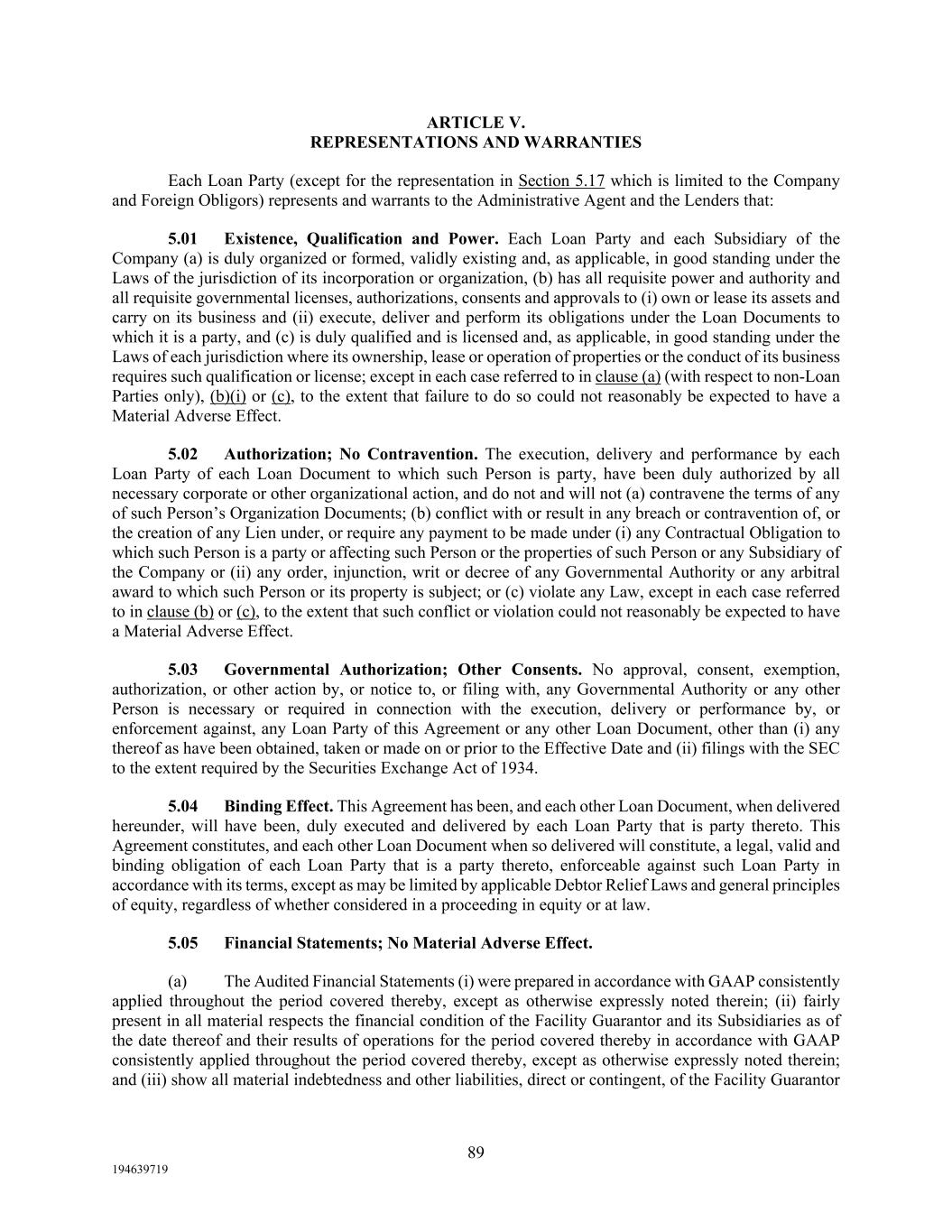 89 194639719 ARTICLE V. REPRESENTATIONS AND WARRANTIES Each Loan Party (except for the representation in Section 5.17 which is limited to the Company and Foreign Obligors) represents and warrants to the Administrative Agent and the Lenders that: 5.01 Existence, Qualification and Power. Each Loan Party and each Subsidiary of the Company (a) is duly organized or formed, validly existing and, as applicable, in good standing under the Laws of the jurisdiction of its incorporation or organization, (b) has all requisite power and authority and all requisite governmental licenses, authorizations, consents and approvals to (i) own or lease its assets and carry on its business and (ii) execute, deliver and perform its obligations under the Loan Documents to which it is a party, and (c) is duly qualified and is licensed and, as applicable, in good standing under the Laws of each jurisdiction where its ownership, lease or operation of properties or the conduct of its business requires such qualification or license; except in each case referred to in clause (a) (with respect to non-Loan Parties only), (b)(i) or (c), to the extent that failure to do so could not reasonably be expected to have a Material Adverse Effect. 5.02 Authorization; No Contravention. The execution, delivery and performance by each Loan Party of each Loan Document to which such Person is party, have been duly authorized by all necessary corporate or other organizational action, and do not and will not (a) contravene the terms of any of such Person’s Organization Documents; (b) conflict with or result in any breach or contravention of, or the creation of any Lien under, or require any payment to be made under (i) any Contractual Obligation to which such Person is a party or affecting such Person or the properties of such Person or any Subsidiary of the Company or (ii) any order, injunction, writ or decree of any Governmental Authority or any arbitral award to which such Person or its property is subject; or (c) violate any Law, except in each case referred to in clause (b) or (c), to the extent that such conflict or violation could not reasonably be expected to have a Material Adverse Effect. 5.03 Governmental Authorization; Other Consents. No approval, consent, exemption, authorization, or other action by, or notice to, or filing with, any Governmental Authority or any other Person is necessary or required in connection with the execution, delivery or performance by, or enforcement against, any Loan Party of this Agreement or any other Loan Document, other than (i) any thereof as have been obtained, taken or made on or prior to the Effective Date and (ii) filings with the SEC to the extent required by the Securities Exchange Act of 1934. 5.04 Binding Effect. This Agreement has been, and each other Loan Document, when delivered hereunder, will have been, duly executed and delivered by each Loan Party that is party thereto. This Agreement constitutes, and each other Loan Document when so delivered will constitute, a legal, valid and binding obligation of each Loan Party that is a party thereto, enforceable against such Loan Party in accordance with its terms, except as may be limited by applicable Debtor Relief Laws and general principles of equity, regardless of whether considered in a proceeding in equity or at law. 5.05 Financial Statements; No Material Adverse Effect. (a) The Audited Financial Statements (i) were prepared in accordance with GAAP consistently applied throughout the period covered thereby, except as otherwise expressly noted therein; (ii) fairly present in all material respects the financial condition of the Facility Guarantor and its Subsidiaries as of the date thereof and their results of operations for the period covered thereby in accordance with GAAP consistently applied throughout the period covered thereby, except as otherwise expressly noted therein; and (iii) show all material indebtedness and other liabilities, direct or contingent, of the Facility Guarantor