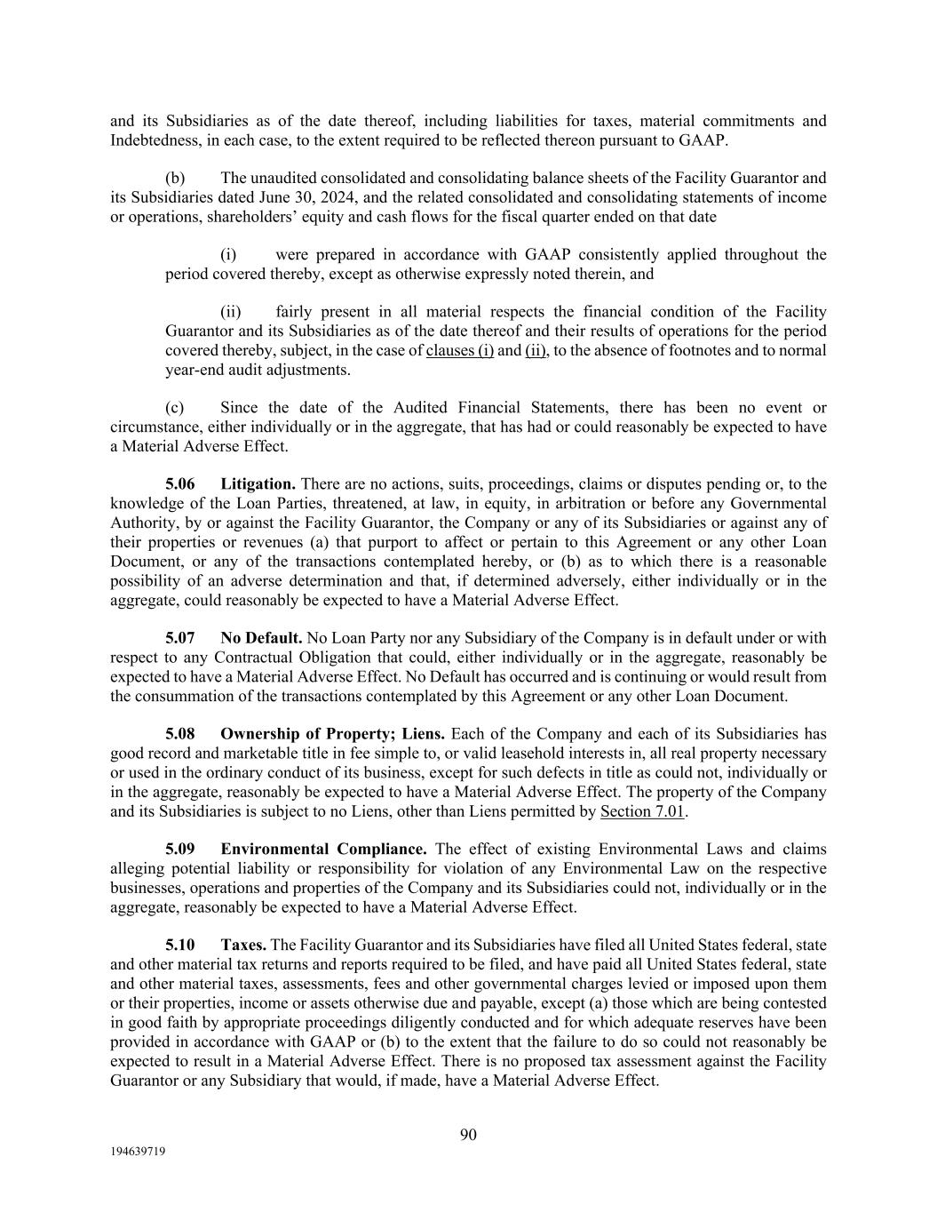 90 194639719 and its Subsidiaries as of the date thereof, including liabilities for taxes, material commitments and Indebtedness, in each case, to the extent required to be reflected thereon pursuant to GAAP. (b) The unaudited consolidated and consolidating balance sheets of the Facility Guarantor and its Subsidiaries dated June 30, 2024, and the related consolidated and consolidating statements of income or operations, shareholders’ equity and cash flows for the fiscal quarter ended on that date (i) were prepared in accordance with GAAP consistently applied throughout the period covered thereby, except as otherwise expressly noted therein, and (ii) fairly present in all material respects the financial condition of the Facility Guarantor and its Subsidiaries as of the date thereof and their results of operations for the period covered thereby, subject, in the case of clauses (i) and (ii), to the absence of footnotes and to normal year-end audit adjustments. (c) Since the date of the Audited Financial Statements, there has been no event or circumstance, either individually or in the aggregate, that has had or could reasonably be expected to have a Material Adverse Effect. 5.06 Litigation. There are no actions, suits, proceedings, claims or disputes pending or, to the knowledge of the Loan Parties, threatened, at law, in equity, in arbitration or before any Governmental Authority, by or against the Facility Guarantor, the Company or any of its Subsidiaries or against any of their properties or revenues (a) that purport to affect or pertain to this Agreement or any other Loan Document, or any of the transactions contemplated hereby, or (b) as to which there is a reasonable possibility of an adverse determination and that, if determined adversely, either individually or in the aggregate, could reasonably be expected to have a Material Adverse Effect. 5.07 No Default. No Loan Party nor any Subsidiary of the Company is in default under or with respect to any Contractual Obligation that could, either individually or in the aggregate, reasonably be expected to have a Material Adverse Effect. No Default has occurred and is continuing or would result from the consummation of the transactions contemplated by this Agreement or any other Loan Document. 5.08 Ownership of Property; Liens. Each of the Company and each of its Subsidiaries has good record and marketable title in fee simple to, or valid leasehold interests in, all real property necessary or used in the ordinary conduct of its business, except for such defects in title as could not, individually or in the aggregate, reasonably be expected to have a Material Adverse Effect. The property of the Company and its Subsidiaries is subject to no Liens, other than Liens permitted by Section 7.01. 5.09 Environmental Compliance. The effect of existing Environmental Laws and claims alleging potential liability or responsibility for violation of any Environmental Law on the respective businesses, operations and properties of the Company and its Subsidiaries could not, individually or in the aggregate, reasonably be expected to have a Material Adverse Effect. 5.10 Taxes. The Facility Guarantor and its Subsidiaries have filed all United States federal, state and other material tax returns and reports required to be filed, and have paid all United States federal, state and other material taxes, assessments, fees and other governmental charges levied or imposed upon them or their properties, income or assets otherwise due and payable, except (a) those which are being contested in good faith by appropriate proceedings diligently conducted and for which adequate reserves have been provided in accordance with GAAP or (b) to the extent that the failure to do so could not reasonably be expected to result in a Material Adverse Effect. There is no proposed tax assessment against the Facility Guarantor or any Subsidiary that would, if made, have a Material Adverse Effect.