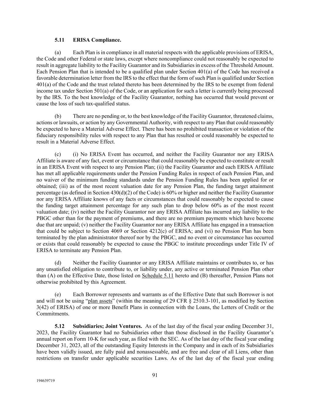 91 194639719 5.11 ERISA Compliance. (a) Each Plan is in compliance in all material respects with the applicable provisions of ERISA, the Code and other Federal or state laws, except where noncompliance could not reasonably be expected to result in aggregate liability to the Facility Guarantor and its Subsidiaries in excess of the Threshold Amount. Each Pension Plan that is intended to be a qualified plan under Section 401(a) of the Code has received a favorable determination letter from the IRS to the effect that the form of such Plan is qualified under Section 401(a) of the Code and the trust related thereto has been determined by the IRS to be exempt from federal income tax under Section 501(a) of the Code, or an application for such a letter is currently being processed by the IRS. To the best knowledge of the Facility Guarantor, nothing has occurred that would prevent or cause the loss of such tax-qualified status. (b) There are no pending or, to the best knowledge of the Facility Guarantor, threatened claims, actions or lawsuits, or action by any Governmental Authority, with respect to any Plan that could reasonably be expected to have a Material Adverse Effect. There has been no prohibited transaction or violation of the fiduciary responsibility rules with respect to any Plan that has resulted or could reasonably be expected to result in a Material Adverse Effect. (c) (i) No ERISA Event has occurred, and neither the Facility Guarantor nor any ERISA Affiliate is aware of any fact, event or circumstance that could reasonably be expected to constitute or result in an ERISA Event with respect to any Pension Plan; (ii) the Facility Guarantor and each ERISA Affiliate has met all applicable requirements under the Pension Funding Rules in respect of each Pension Plan, and no waiver of the minimum funding standards under the Pension Funding Rules has been applied for or obtained; (iii) as of the most recent valuation date for any Pension Plan, the funding target attainment percentage (as defined in Section 430(d)(2) of the Code) is 60% or higher and neither the Facility Guarantor nor any ERISA Affiliate knows of any facts or circumstances that could reasonably be expected to cause the funding target attainment percentage for any such plan to drop below 60% as of the most recent valuation date; (iv) neither the Facility Guarantor nor any ERISA Affiliate has incurred any liability to the PBGC other than for the payment of premiums, and there are no premium payments which have become due that are unpaid; (v) neither the Facility Guarantor nor any ERISA Affiliate has engaged in a transaction that could be subject to Section 4069 or Section 4212(c) of ERISA; and (vi) no Pension Plan has been terminated by the plan administrator thereof nor by the PBGC, and no event or circumstance has occurred or exists that could reasonably be expected to cause the PBGC to institute proceedings under Title IV of ERISA to terminate any Pension Plan. (d) Neither the Facility Guarantor or any ERISA Affiliate maintains or contributes to, or has any unsatisfied obligation to contribute to, or liability under, any active or terminated Pension Plan other than (A) on the Effective Date, those listed on Schedule 5.11 hereto and (B) thereafter, Pension Plans not otherwise prohibited by this Agreement. (e) Each Borrower represents and warrants as of the Effective Date that such Borrower is not and will not be using “plan assets” (within the meaning of 29 CFR § 2510.3-101, as modified by Section 3(42) of ERISA) of one or more Benefit Plans in connection with the Loans, the Letters of Credit or the Commitments. 5.12 Subsidiaries; Joint Ventures. As of the last day of the fiscal year ending December 31, 2023, the Facility Guarantor had no Subsidiaries other than those disclosed in the Facility Guarantor’s annual report on Form 10-K for such year, as filed with the SEC. As of the last day of the fiscal year ending December 31, 2023, all of the outstanding Equity Interests in the Company and in each of its Subsidiaries have been validly issued, are fully paid and nonassessable, and are free and clear of all Liens, other than restrictions on transfer under applicable securities Laws. As of the last day of the fiscal year ending