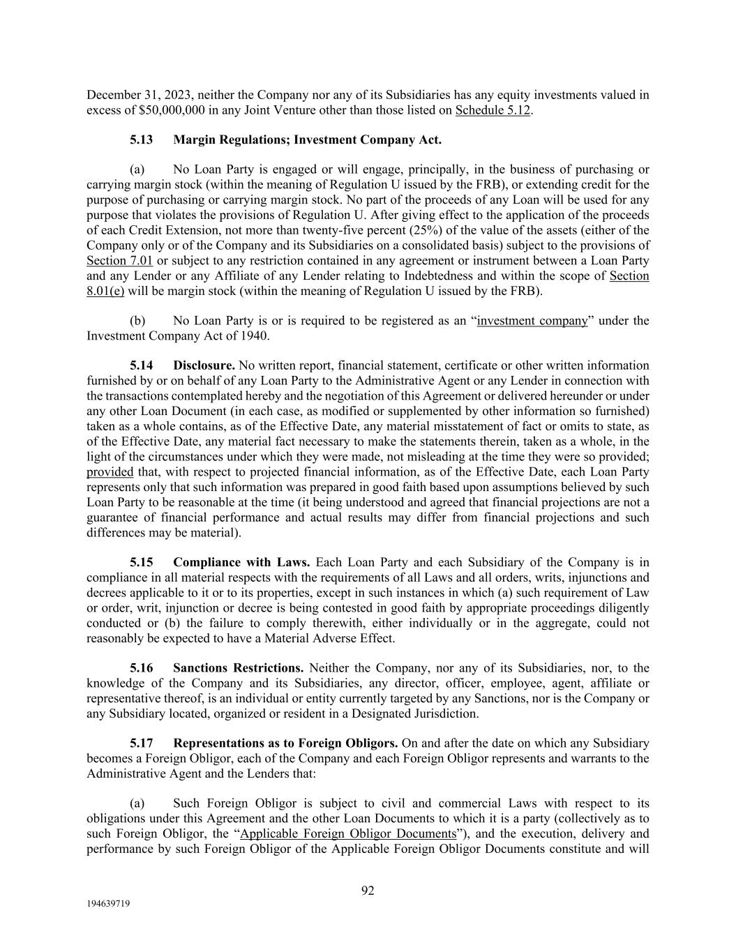 92 194639719 December 31, 2023, neither the Company nor any of its Subsidiaries has any equity investments valued in excess of $50,000,000 in any Joint Venture other than those listed on Schedule 5.12. 5.13 Margin Regulations; Investment Company Act. (a) No Loan Party is engaged or will engage, principally, in the business of purchasing or carrying margin stock (within the meaning of Regulation U issued by the FRB), or extending credit for the purpose of purchasing or carrying margin stock. No part of the proceeds of any Loan will be used for any purpose that violates the provisions of Regulation U. After giving effect to the application of the proceeds of each Credit Extension, not more than twenty-five percent (25%) of the value of the assets (either of the Company only or of the Company and its Subsidiaries on a consolidated basis) subject to the provisions of Section 7.01 or subject to any restriction contained in any agreement or instrument between a Loan Party and any Lender or any Affiliate of any Lender relating to Indebtedness and within the scope of Section 8.01(e) will be margin stock (within the meaning of Regulation U issued by the FRB). (b) No Loan Party is or is required to be registered as an “investment company” under the Investment Company Act of 1940. 5.14 Disclosure. No written report, financial statement, certificate or other written information furnished by or on behalf of any Loan Party to the Administrative Agent or any Lender in connection with the transactions contemplated hereby and the negotiation of this Agreement or delivered hereunder or under any other Loan Document (in each case, as modified or supplemented by other information so furnished) taken as a whole contains, as of the Effective Date, any material misstatement of fact or omits to state, as of the Effective Date, any material fact necessary to make the statements therein, taken as a whole, in the light of the circumstances under which they were made, not misleading at the time they were so provided; provided that, with respect to projected financial information, as of the Effective Date, each Loan Party represents only that such information was prepared in good faith based upon assumptions believed by such Loan Party to be reasonable at the time (it being understood and agreed that financial projections are not a guarantee of financial performance and actual results may differ from financial projections and such differences may be material). 5.15 Compliance with Laws. Each Loan Party and each Subsidiary of the Company is in compliance in all material respects with the requirements of all Laws and all orders, writs, injunctions and decrees applicable to it or to its properties, except in such instances in which (a) such requirement of Law or order, writ, injunction or decree is being contested in good faith by appropriate proceedings diligently conducted or (b) the failure to comply therewith, either individually or in the aggregate, could not reasonably be expected to have a Material Adverse Effect. 5.16 Sanctions Restrictions. Neither the Company, nor any of its Subsidiaries, nor, to the knowledge of the Company and its Subsidiaries, any director, officer, employee, agent, affiliate or representative thereof, is an individual or entity currently targeted by any Sanctions, nor is the Company or any Subsidiary located, organized or resident in a Designated Jurisdiction. 5.17 Representations as to Foreign Obligors. On and after the date on which any Subsidiary becomes a Foreign Obligor, each of the Company and each Foreign Obligor represents and warrants to the Administrative Agent and the Lenders that: (a) Such Foreign Obligor is subject to civil and commercial Laws with respect to its obligations under this Agreement and the other Loan Documents to which it is a party (collectively as to such Foreign Obligor, the “Applicable Foreign Obligor Documents”), and the execution, delivery and performance by such Foreign Obligor of the Applicable Foreign Obligor Documents constitute and will