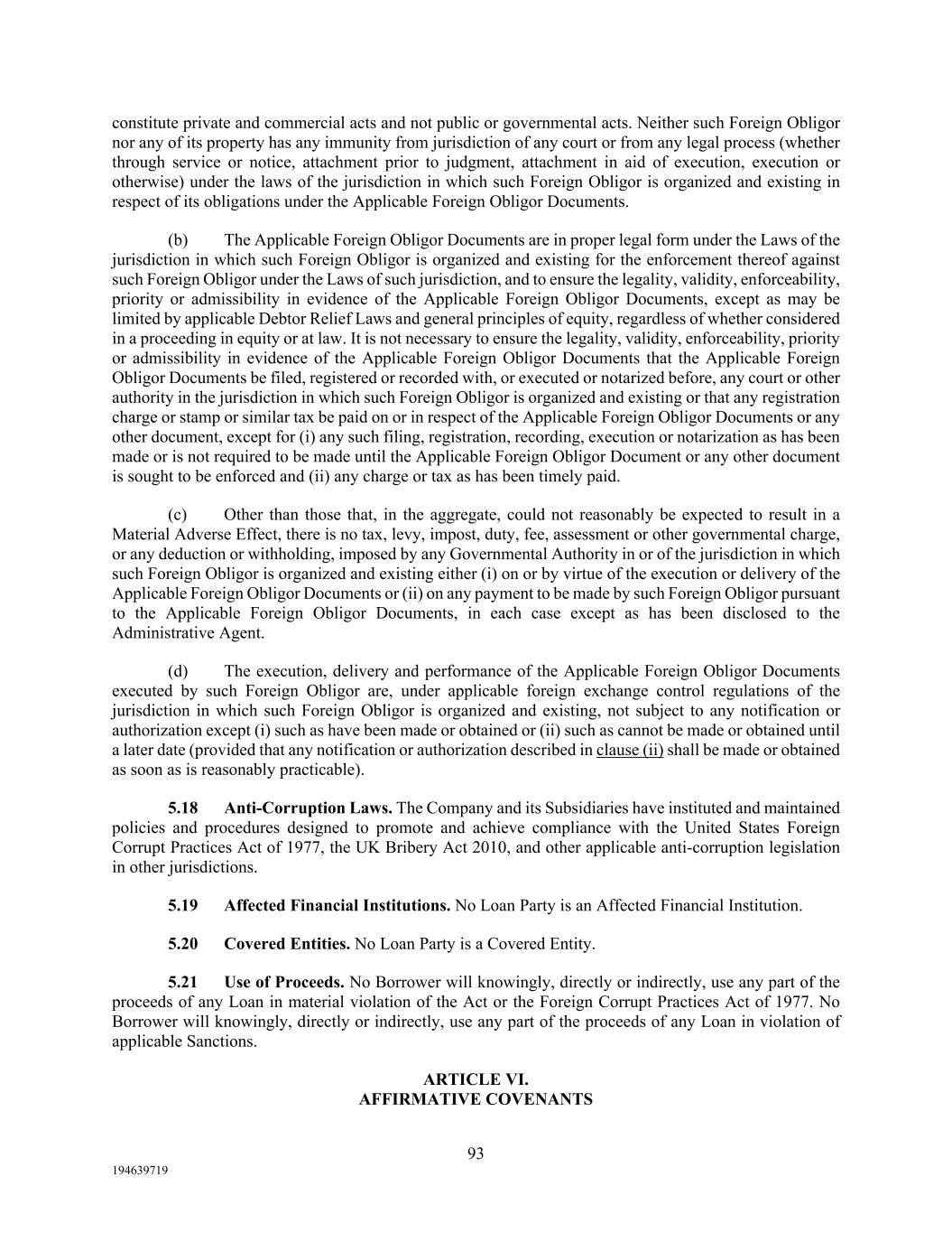 93 194639719 constitute private and commercial acts and not public or governmental acts. Neither such Foreign Obligor nor any of its property has any immunity from jurisdiction of any court or from any legal process (whether through service or notice, attachment prior to judgment, attachment in aid of execution, execution or otherwise) under the laws of the jurisdiction in which such Foreign Obligor is organized and existing in respect of its obligations under the Applicable Foreign Obligor Documents. (b) The Applicable Foreign Obligor Documents are in proper legal form under the Laws of the jurisdiction in which such Foreign Obligor is organized and existing for the enforcement thereof against such Foreign Obligor under the Laws of such jurisdiction, and to ensure the legality, validity, enforceability, priority or admissibility in evidence of the Applicable Foreign Obligor Documents, except as may be limited by applicable Debtor Relief Laws and general principles of equity, regardless of whether considered in a proceeding in equity or at law. It is not necessary to ensure the legality, validity, enforceability, priority or admissibility in evidence of the Applicable Foreign Obligor Documents that the Applicable Foreign Obligor Documents be filed, registered or recorded with, or executed or notarized before, any court or other authority in the jurisdiction in which such Foreign Obligor is organized and existing or that any registration charge or stamp or similar tax be paid on or in respect of the Applicable Foreign Obligor Documents or any other document, except for (i) any such filing, registration, recording, execution or notarization as has been made or is not required to be made until the Applicable Foreign Obligor Document or any other document is sought to be enforced and (ii) any charge or tax as has been timely paid. (c) Other than those that, in the aggregate, could not reasonably be expected to result in a Material Adverse Effect, there is no tax, levy, impost, duty, fee, assessment or other governmental charge, or any deduction or withholding, imposed by any Governmental Authority in or of the jurisdiction in which such Foreign Obligor is organized and existing either (i) on or by virtue of the execution or delivery of the Applicable Foreign Obligor Documents or (ii) on any payment to be made by such Foreign Obligor pursuant to the Applicable Foreign Obligor Documents, in each case except as has been disclosed to the Administrative Agent. (d) The execution, delivery and performance of the Applicable Foreign Obligor Documents executed by such Foreign Obligor are, under applicable foreign exchange control regulations of the jurisdiction in which such Foreign Obligor is organized and existing, not subject to any notification or authorization except (i) such as have been made or obtained or (ii) such as cannot be made or obtained until a later date (provided that any notification or authorization described in clause (ii) shall be made or obtained as soon as is reasonably practicable). 5.18 Anti-Corruption Laws. The Company and its Subsidiaries have instituted and maintained policies and procedures designed to promote and achieve compliance with the United States Foreign Corrupt Practices Act of 1977, the UK Bribery Act 2010, and other applicable anti-corruption legislation in other jurisdictions. 5.19 Affected Financial Institutions. No Loan Party is an Affected Financial Institution. 5.20 Covered Entities. No Loan Party is a Covered Entity. 5.21 Use of Proceeds. No Borrower will knowingly, directly or indirectly, use any part of the proceeds of any Loan in material violation of the Act or the Foreign Corrupt Practices Act of 1977. No Borrower will knowingly, directly or indirectly, use any part of the proceeds of any Loan in violation of applicable Sanctions. ARTICLE VI. AFFIRMATIVE COVENANTS