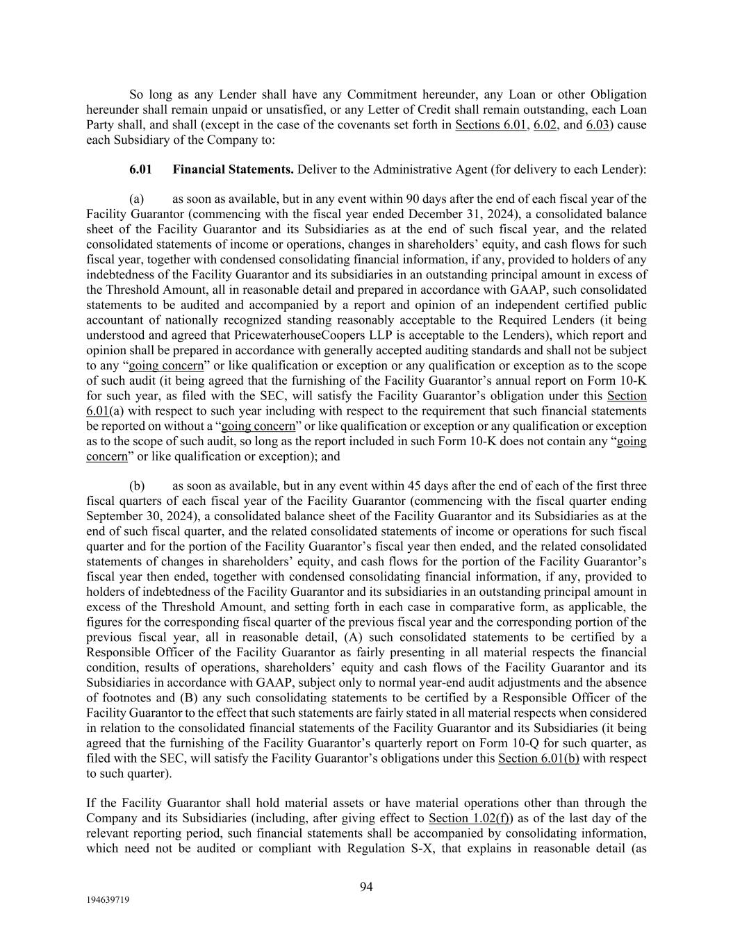 94 194639719 So long as any Lender shall have any Commitment hereunder, any Loan or other Obligation hereunder shall remain unpaid or unsatisfied, or any Letter of Credit shall remain outstanding, each Loan Party shall, and shall (except in the case of the covenants set forth in Sections 6.01, 6.02, and 6.03) cause each Subsidiary of the Company to: 6.01 Financial Statements. Deliver to the Administrative Agent (for delivery to each Lender): (a) as soon as available, but in any event within 90 days after the end of each fiscal year of the Facility Guarantor (commencing with the fiscal year ended December 31, 2024), a consolidated balance sheet of the Facility Guarantor and its Subsidiaries as at the end of such fiscal year, and the related consolidated statements of income or operations, changes in shareholders’ equity, and cash flows for such fiscal year, together with condensed consolidating financial information, if any, provided to holders of any indebtedness of the Facility Guarantor and its subsidiaries in an outstanding principal amount in excess of the Threshold Amount, all in reasonable detail and prepared in accordance with GAAP, such consolidated statements to be audited and accompanied by a report and opinion of an independent certified public accountant of nationally recognized standing reasonably acceptable to the Required Lenders (it being understood and agreed that PricewaterhouseCoopers LLP is acceptable to the Lenders), which report and opinion shall be prepared in accordance with generally accepted auditing standards and shall not be subject to any “going concern” or like qualification or exception or any qualification or exception as to the scope of such audit (it being agreed that the furnishing of the Facility Guarantor’s annual report on Form 10-K for such year, as filed with the SEC, will satisfy the Facility Guarantor’s obligation under this Section 6.01(a) with respect to such year including with respect to the requirement that such financial statements be reported on without a “going concern” or like qualification or exception or any qualification or exception as to the scope of such audit, so long as the report included in such Form 10-K does not contain any “going concern” or like qualification or exception); and (b) as soon as available, but in any event within 45 days after the end of each of the first three fiscal quarters of each fiscal year of the Facility Guarantor (commencing with the fiscal quarter ending September 30, 2024), a consolidated balance sheet of the Facility Guarantor and its Subsidiaries as at the end of such fiscal quarter, and the related consolidated statements of income or operations for such fiscal quarter and for the portion of the Facility Guarantor’s fiscal year then ended, and the related consolidated statements of changes in shareholders’ equity, and cash flows for the portion of the Facility Guarantor’s fiscal year then ended, together with condensed consolidating financial information, if any, provided to holders of indebtedness of the Facility Guarantor and its subsidiaries in an outstanding principal amount in excess of the Threshold Amount, and setting forth in each case in comparative form, as applicable, the figures for the corresponding fiscal quarter of the previous fiscal year and the corresponding portion of the previous fiscal year, all in reasonable detail, (A) such consolidated statements to be certified by a Responsible Officer of the Facility Guarantor as fairly presenting in all material respects the financial condition, results of operations, shareholders’ equity and cash flows of the Facility Guarantor and its Subsidiaries in accordance with GAAP, subject only to normal year-end audit adjustments and the absence of footnotes and (B) any such consolidating statements to be certified by a Responsible Officer of the Facility Guarantor to the effect that such statements are fairly stated in all material respects when considered in relation to the consolidated financial statements of the Facility Guarantor and its Subsidiaries (it being agreed that the furnishing of the Facility Guarantor’s quarterly report on Form 10-Q for such quarter, as filed with the SEC, will satisfy the Facility Guarantor’s obligations under this Section 6.01(b) with respect to such quarter). If the Facility Guarantor shall hold material assets or have material operations other than through the Company and its Subsidiaries (including, after giving effect to Section 1.02(f)) as of the last day of the relevant reporting period, such financial statements shall be accompanied by consolidating information, which need not be audited or compliant with Regulation S-X, that explains in reasonable detail (as