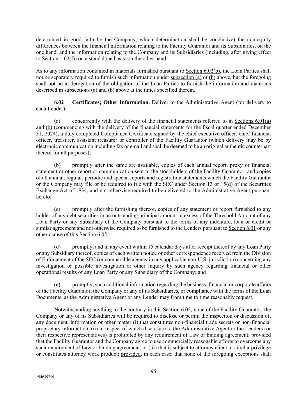 95 194639719 determined in good faith by the Company, which determination shall be conclusive) the non-equity differences between the financial information relating to the Facility Guarantor and its Subsidiaries, on the one hand, and the information relating to the Company and its Subsidiaries (including, after giving effect to Section 1.02(f)) on a standalone basis, on the other hand. As to any information contained in materials furnished pursuant to Section 6.02(b), the Loan Parties shall not be separately required to furnish such information under subsection (a) or (b) above, but the foregoing shall not be in derogation of the obligation of the Loan Parties to furnish the information and materials described in subsections (a) and (b) above at the times specified therein. 6.02 Certificates; Other Information. Deliver to the Administrative Agent (for delivery to each Lender): (a) concurrently with the delivery of the financial statements referred to in Sections 6.01(a) and (b) (commencing with the delivery of the financial statements for the fiscal quarter ended December 31, 2024), a duly completed Compliance Certificate signed by the chief executive officer, chief financial officer, treasurer, assistant treasurer or controller of the Facility Guarantor (which delivery may be by electronic communication including fax or email and shall be deemed to be an original authentic counterpart thereof for all purposes); (b) promptly after the same are available, copies of each annual report, proxy or financial statement or other report or communication sent to the stockholders of the Facility Guarantor, and copies of all annual, regular, periodic and special reports and registration statements which the Facility Guarantor or the Company may file or be required to file with the SEC under Section 13 or 15(d) of the Securities Exchange Act of 1934, and not otherwise required to be delivered to the Administrative Agent pursuant hereto; (c) promptly after the furnishing thereof, copies of any statement or report furnished to any holder of any debt securities in an outstanding principal amount in excess of the Threshold Amount of any Loan Party or any Subsidiary of the Company pursuant to the terms of any indenture, loan or credit or similar agreement and not otherwise required to be furnished to the Lenders pursuant to Section 6.01 or any other clause of this Section 6.02; (d) promptly, and in any event within 15 calendar days after receipt thereof by any Loan Party or any Subsidiary thereof, copies of each written notice or other correspondence received from the Division of Enforcement of the SEC (or comparable agency in any applicable non-U.S. jurisdiction) concerning any investigation or possible investigation or other inquiry by such agency regarding financial or other operational results of any Loan Party or any Subsidiary of the Company; and (e) promptly, such additional information regarding the business, financial or corporate affairs of the Facility Guarantor, the Company or any of its Subsidiaries, or compliance with the terms of the Loan Documents, as the Administrative Agent or any Lender may from time to time reasonably request. Notwithstanding anything to the contrary in this Section 6.02, none of the Facility Guarantor, the Company or any of its Subsidiaries will be required to disclose or permit the inspection or discussion of, any document, information or other matter (i) that constitutes non-financial trade secrets or non-financial proprietary information, (ii) in respect of which disclosure to the Administrative Agent or the Lenders (or their respective representatives) is prohibited by any requirement of Law or binding agreement; provided that the Facility Guarantor and the Company agree to use commercially reasonable efforts to overcome any such requirement of Law or binding agreement, or (iii) that is subject to attorney client or similar privilege or constitutes attorney work product; provided, in each case, that none of the foregoing exceptions shall
