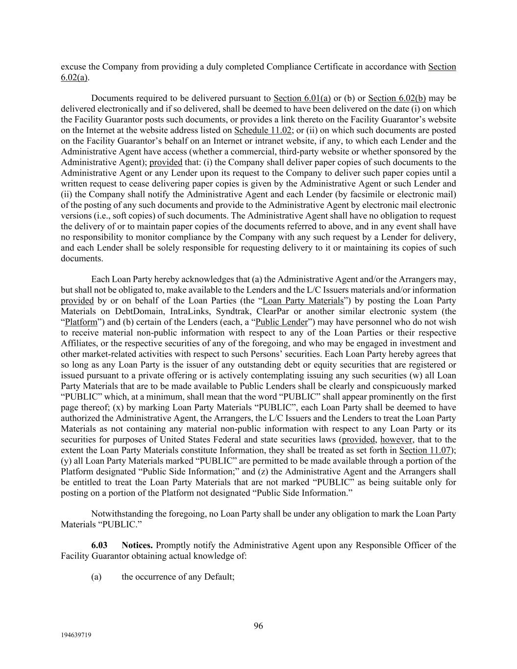 96 194639719 excuse the Company from providing a duly completed Compliance Certificate in accordance with Section 6.02(a). Documents required to be delivered pursuant to Section 6.01(a) or (b) or Section 6.02(b) may be delivered electronically and if so delivered, shall be deemed to have been delivered on the date (i) on which the Facility Guarantor posts such documents, or provides a link thereto on the Facility Guarantor’s website on the Internet at the website address listed on Schedule 11.02; or (ii) on which such documents are posted on the Facility Guarantor’s behalf on an Internet or intranet website, if any, to which each Lender and the Administrative Agent have access (whether a commercial, third-party website or whether sponsored by the Administrative Agent); provided that: (i) the Company shall deliver paper copies of such documents to the Administrative Agent or any Lender upon its request to the Company to deliver such paper copies until a written request to cease delivering paper copies is given by the Administrative Agent or such Lender and (ii) the Company shall notify the Administrative Agent and each Lender (by facsimile or electronic mail) of the posting of any such documents and provide to the Administrative Agent by electronic mail electronic versions (i.e., soft copies) of such documents. The Administrative Agent shall have no obligation to request the delivery of or to maintain paper copies of the documents referred to above, and in any event shall have no responsibility to monitor compliance by the Company with any such request by a Lender for delivery, and each Lender shall be solely responsible for requesting delivery to it or maintaining its copies of such documents. Each Loan Party hereby acknowledges that (a) the Administrative Agent and/or the Arrangers may, but shall not be obligated to, make available to the Lenders and the L/C Issuers materials and/or information provided by or on behalf of the Loan Parties (the “Loan Party Materials”) by posting the Loan Party Materials on DebtDomain, IntraLinks, Syndtrak, ClearPar or another similar electronic system (the “Platform”) and (b) certain of the Lenders (each, a “Public Lender”) may have personnel who do not wish to receive material non-public information with respect to any of the Loan Parties or their respective Affiliates, or the respective securities of any of the foregoing, and who may be engaged in investment and other market-related activities with respect to such Persons’ securities. Each Loan Party hereby agrees that so long as any Loan Party is the issuer of any outstanding debt or equity securities that are registered or issued pursuant to a private offering or is actively contemplating issuing any such securities (w) all Loan Party Materials that are to be made available to Public Lenders shall be clearly and conspicuously marked “PUBLIC” which, at a minimum, shall mean that the word “PUBLIC” shall appear prominently on the first page thereof; (x) by marking Loan Party Materials “PUBLIC”, each Loan Party shall be deemed to have authorized the Administrative Agent, the Arrangers, the L/C Issuers and the Lenders to treat the Loan Party Materials as not containing any material non-public information with respect to any Loan Party or its securities for purposes of United States Federal and state securities laws (provided, however, that to the extent the Loan Party Materials constitute Information, they shall be treated as set forth in Section 11.07); (y) all Loan Party Materials marked “PUBLIC” are permitted to be made available through a portion of the Platform designated “Public Side Information;” and (z) the Administrative Agent and the Arrangers shall be entitled to treat the Loan Party Materials that are not marked “PUBLIC” as being suitable only for posting on a portion of the Platform not designated “Public Side Information.” Notwithstanding the foregoing, no Loan Party shall be under any obligation to mark the Loan Party Materials “PUBLIC.” 6.03 Notices. Promptly notify the Administrative Agent upon any Responsible Officer of the Facility Guarantor obtaining actual knowledge of: (a) the occurrence of any Default;