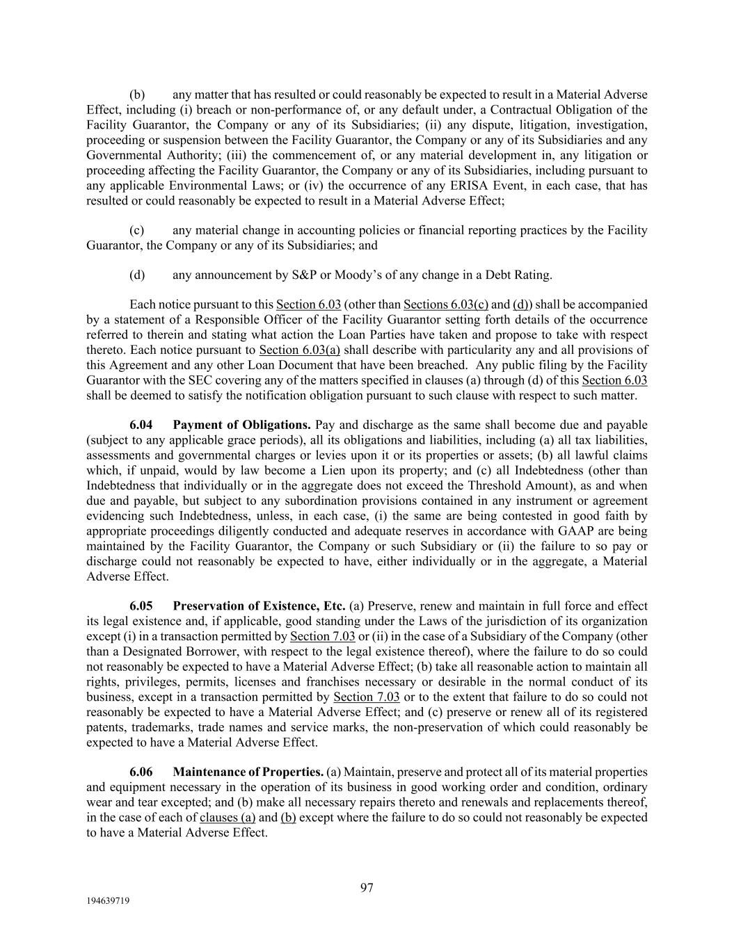 97 194639719 (b) any matter that has resulted or could reasonably be expected to result in a Material Adverse Effect, including (i) breach or non-performance of, or any default under, a Contractual Obligation of the Facility Guarantor, the Company or any of its Subsidiaries; (ii) any dispute, litigation, investigation, proceeding or suspension between the Facility Guarantor, the Company or any of its Subsidiaries and any Governmental Authority; (iii) the commencement of, or any material development in, any litigation or proceeding affecting the Facility Guarantor, the Company or any of its Subsidiaries, including pursuant to any applicable Environmental Laws; or (iv) the occurrence of any ERISA Event, in each case, that has resulted or could reasonably be expected to result in a Material Adverse Effect; (c) any material change in accounting policies or financial reporting practices by the Facility Guarantor, the Company or any of its Subsidiaries; and (d) any announcement by S&P or Moody’s of any change in a Debt Rating. Each notice pursuant to this Section 6.03 (other than Sections 6.03(c) and (d)) shall be accompanied by a statement of a Responsible Officer of the Facility Guarantor setting forth details of the occurrence referred to therein and stating what action the Loan Parties have taken and propose to take with respect thereto. Each notice pursuant to Section 6.03(a) shall describe with particularity any and all provisions of this Agreement and any other Loan Document that have been breached. Any public filing by the Facility Guarantor with the SEC covering any of the matters specified in clauses (a) through (d) of this Section 6.03 shall be deemed to satisfy the notification obligation pursuant to such clause with respect to such matter. 6.04 Payment of Obligations. Pay and discharge as the same shall become due and payable (subject to any applicable grace periods), all its obligations and liabilities, including (a) all tax liabilities, assessments and governmental charges or levies upon it or its properties or assets; (b) all lawful claims which, if unpaid, would by law become a Lien upon its property; and (c) all Indebtedness (other than Indebtedness that individually or in the aggregate does not exceed the Threshold Amount), as and when due and payable, but subject to any subordination provisions contained in any instrument or agreement evidencing such Indebtedness, unless, in each case, (i) the same are being contested in good faith by appropriate proceedings diligently conducted and adequate reserves in accordance with GAAP are being maintained by the Facility Guarantor, the Company or such Subsidiary or (ii) the failure to so pay or discharge could not reasonably be expected to have, either individually or in the aggregate, a Material Adverse Effect. 6.05 Preservation of Existence, Etc. (a) Preserve, renew and maintain in full force and effect its legal existence and, if applicable, good standing under the Laws of the jurisdiction of its organization except (i) in a transaction permitted by Section 7.03 or (ii) in the case of a Subsidiary of the Company (other than a Designated Borrower, with respect to the legal existence thereof), where the failure to do so could not reasonably be expected to have a Material Adverse Effect; (b) take all reasonable action to maintain all rights, privileges, permits, licenses and franchises necessary or desirable in the normal conduct of its business, except in a transaction permitted by Section 7.03 or to the extent that failure to do so could not reasonably be expected to have a Material Adverse Effect; and (c) preserve or renew all of its registered patents, trademarks, trade names and service marks, the non-preservation of which could reasonably be expected to have a Material Adverse Effect. 6.06 Maintenance of Properties. (a) Maintain, preserve and protect all of its material properties and equipment necessary in the operation of its business in good working order and condition, ordinary wear and tear excepted; and (b) make all necessary repairs thereto and renewals and replacements thereof, in the case of each of clauses (a) and (b) except where the failure to do so could not reasonably be expected to have a Material Adverse Effect.