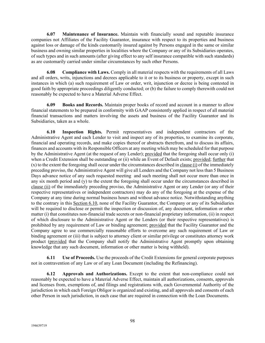 98 194639719 6.07 Maintenance of Insurance. Maintain with financially sound and reputable insurance companies not Affiliates of the Facility Guarantor, insurance with respect to its properties and business against loss or damage of the kinds customarily insured against by Persons engaged in the same or similar business and owning similar properties in localities where the Company or any of its Subsidiaries operates, of such types and in such amounts (after giving effect to any self insurance compatible with such standards) as are customarily carried under similar circumstances by such other Persons. 6.08 Compliance with Laws. Comply in all material respects with the requirements of all Laws and all orders, writs, injunctions and decrees applicable to it or to its business or property, except in such instances in which (a) such requirement of Law or order, writ, injunction or decree is being contested in good faith by appropriate proceedings diligently conducted; or (b) the failure to comply therewith could not reasonably be expected to have a Material Adverse Effect. 6.09 Books and Records. Maintain proper books of record and account in a manner to allow financial statements to be prepared in conformity with GAAP consistently applied in respect of all material financial transactions and matters involving the assets and business of the Facility Guarantor and its Subsidiaries, taken as a whole. 6.10 Inspection Rights. Permit representatives and independent contractors of the Administrative Agent and each Lender to visit and inspect any of its properties, to examine its corporate, financial and operating records, and make copies thereof or abstracts therefrom, and to discuss its affairs, finances and accounts with its Responsible Officers at any meeting which may be scheduled for that purpose by the Administrative Agent (at the request of any Lender); provided that the foregoing shall occur only (i) when a Credit Extension shall be outstanding or (ii) while an Event of Default exists; provided; further that (x) to the extent the foregoing shall occur under the circumstances described in clause (i) of the immediately preceding proviso, the Administrative Agent will give all Lenders and the Company not less than 5 Business Days advance notice of any such requested meeting and such meeting shall not occur more than once in any six month period and (y) to the extent the foregoing shall occur under the circumstances described in clause (ii) of the immediately preceding proviso, the Administrative Agent or any Lender (or any of their respective representatives or independent contractors) may do any of the foregoing at the expense of the Company at any time during normal business hours and without advance notice. Notwithstanding anything to the contrary in this Section 6.10, none of the Facility Guarantor, the Company or any of its Subsidiaries will be required to disclose or permit the inspection or discussion of, any document, information or other matter (i) that constitutes non-financial trade secrets or non-financial proprietary information, (ii) in respect of which disclosure to the Administrative Agent or the Lenders (or their respective representatives) is prohibited by any requirement of Law or binding agreement; provided that the Facility Guarantor and the Company agree to use commercially reasonable efforts to overcome any such requirement of Law or binding agreement or (iii) that is subject to attorney client or similar privilege or constitutes attorney work product (provided that the Company shall notify the Administrative Agent promptly upon obtaining knowledge that any such document, information or other matter is being withheld). 6.11 Use of Proceeds. Use the proceeds of the Credit Extensions for general corporate purposes not in contravention of any Law or of any Loan Document (including the Refinancing). 6.12 Approvals and Authorizations. Except to the extent that non-compliance could not reasonably be expected to have a Material Adverse Effect, maintain all authorizations, consents, approvals and licenses from, exemptions of, and filings and registrations with, each Governmental Authority of the jurisdiction in which each Foreign Obligor is organized and existing, and all approvals and consents of each other Person in such jurisdiction, in each case that are required in connection with the Loan Documents.