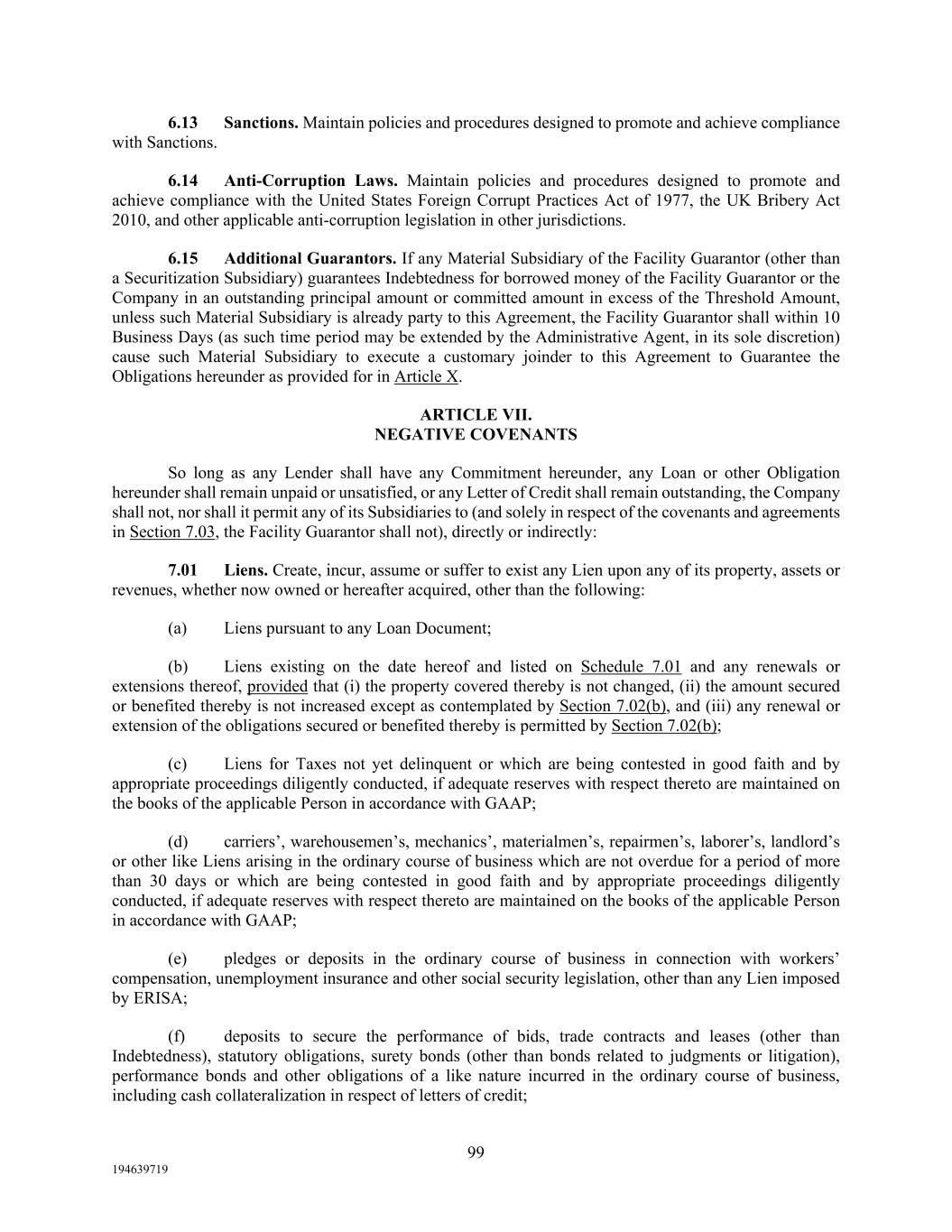 99 194639719 6.13 Sanctions. Maintain policies and procedures designed to promote and achieve compliance with Sanctions. 6.14 Anti-Corruption Laws. Maintain policies and procedures designed to promote and achieve compliance with the United States Foreign Corrupt Practices Act of 1977, the UK Bribery Act 2010, and other applicable anti-corruption legislation in other jurisdictions. 6.15 Additional Guarantors. If any Material Subsidiary of the Facility Guarantor (other than a Securitization Subsidiary) guarantees Indebtedness for borrowed money of the Facility Guarantor or the Company in an outstanding principal amount or committed amount in excess of the Threshold Amount, unless such Material Subsidiary is already party to this Agreement, the Facility Guarantor shall within 10 Business Days (as such time period may be extended by the Administrative Agent, in its sole discretion) cause such Material Subsidiary to execute a customary joinder to this Agreement to Guarantee the Obligations hereunder as provided for in Article X. ARTICLE VII. NEGATIVE COVENANTS So long as any Lender shall have any Commitment hereunder, any Loan or other Obligation hereunder shall remain unpaid or unsatisfied, or any Letter of Credit shall remain outstanding, the Company shall not, nor shall it permit any of its Subsidiaries to (and solely in respect of the covenants and agreements in Section 7.03, the Facility Guarantor shall not), directly or indirectly: 7.01 Liens. Create, incur, assume or suffer to exist any Lien upon any of its property, assets or revenues, whether now owned or hereafter acquired, other than the following: (a) Liens pursuant to any Loan Document; (b) Liens existing on the date hereof and listed on Schedule 7.01 and any renewals or extensions thereof, provided that (i) the property covered thereby is not changed, (ii) the amount secured or benefited thereby is not increased except as contemplated by Section 7.02(b), and (iii) any renewal or extension of the obligations secured or benefited thereby is permitted by Section 7.02(b); (c) Liens for Taxes not yet delinquent or which are being contested in good faith and by appropriate proceedings diligently conducted, if adequate reserves with respect thereto are maintained on the books of the applicable Person in accordance with GAAP; (d) carriers’, warehousemen’s, mechanics’, materialmen’s, repairmen’s, laborer’s, landlord’s or other like Liens arising in the ordinary course of business which are not overdue for a period of more than 30 days or which are being contested in good faith and by appropriate proceedings diligently conducted, if adequate reserves with respect thereto are maintained on the books of the applicable Person in accordance with GAAP; (e) pledges or deposits in the ordinary course of business in connection with workers’ compensation, unemployment insurance and other social security legislation, other than any Lien imposed by ERISA; (f) deposits to secure the performance of bids, trade contracts and leases (other than Indebtedness), statutory obligations, surety bonds (other than bonds related to judgments or litigation), performance bonds and other obligations of a like nature incurred in the ordinary course of business, including cash collateralization in respect of letters of credit;