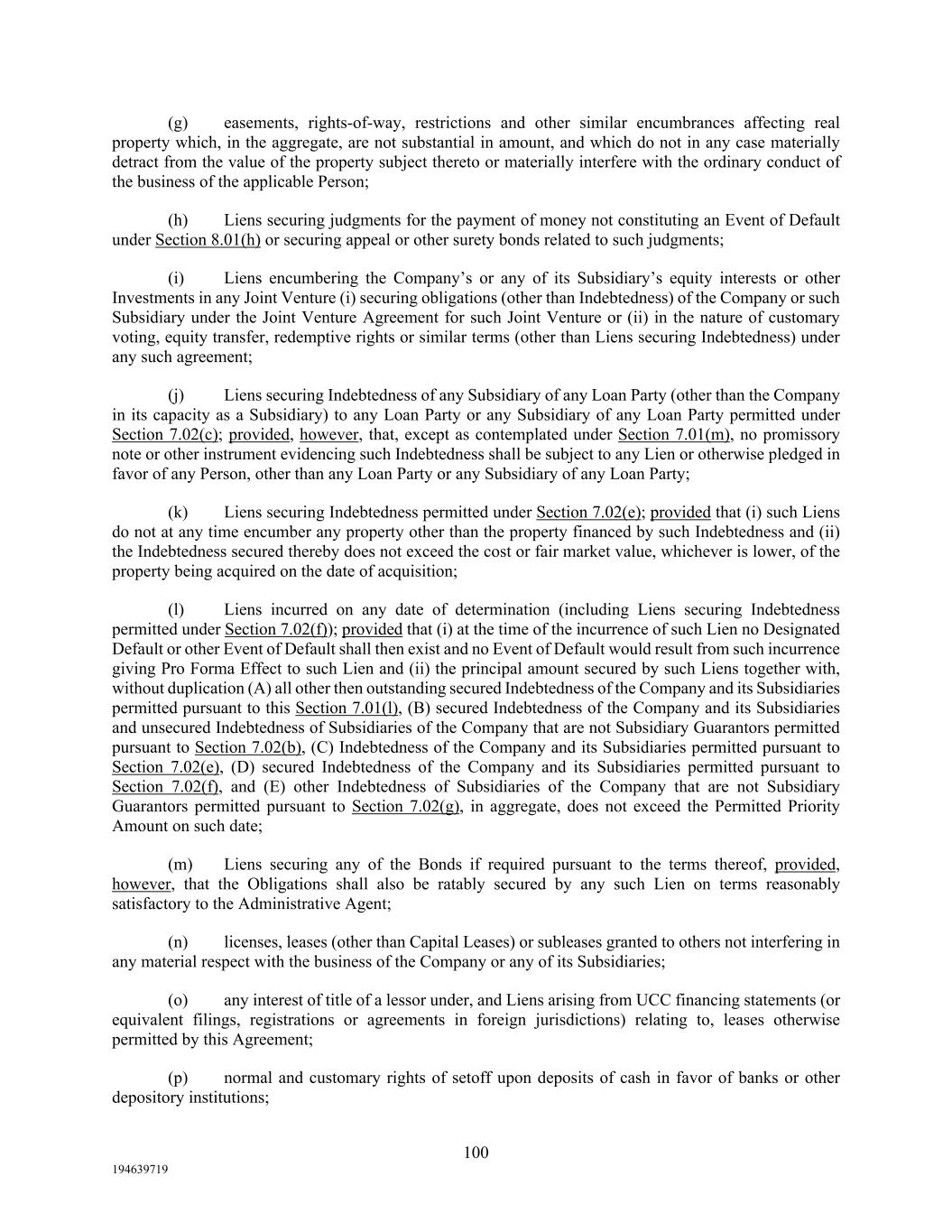 100 194639719 (g) easements, rights-of-way, restrictions and other similar encumbrances affecting real property which, in the aggregate, are not substantial in amount, and which do not in any case materially detract from the value of the property subject thereto or materially interfere with the ordinary conduct of the business of the applicable Person; (h) Liens securing judgments for the payment of money not constituting an Event of Default under Section 8.01(h) or securing appeal or other surety bonds related to such judgments; (i) Liens encumbering the Company’s or any of its Subsidiary’s equity interests or other Investments in any Joint Venture (i) securing obligations (other than Indebtedness) of the Company or such Subsidiary under the Joint Venture Agreement for such Joint Venture or (ii) in the nature of customary voting, equity transfer, redemptive rights or similar terms (other than Liens securing Indebtedness) under any such agreement; (j) Liens securing Indebtedness of any Subsidiary of any Loan Party (other than the Company in its capacity as a Subsidiary) to any Loan Party or any Subsidiary of any Loan Party permitted under Section 7.02(c); provided, however, that, except as contemplated under Section 7.01(m), no promissory note or other instrument evidencing such Indebtedness shall be subject to any Lien or otherwise pledged in favor of any Person, other than any Loan Party or any Subsidiary of any Loan Party; (k) Liens securing Indebtedness permitted under Section 7.02(e); provided that (i) such Liens do not at any time encumber any property other than the property financed by such Indebtedness and (ii) the Indebtedness secured thereby does not exceed the cost or fair market value, whichever is lower, of the property being acquired on the date of acquisition; (l) Liens incurred on any date of determination (including Liens securing Indebtedness permitted under Section 7.02(f)); provided that (i) at the time of the incurrence of such Lien no Designated Default or other Event of Default shall then exist and no Event of Default would result from such incurrence giving Pro Forma Effect to such Lien and (ii) the principal amount secured by such Liens together with, without duplication (A) all other then outstanding secured Indebtedness of the Company and its Subsidiaries permitted pursuant to this Section 7.01(l), (B) secured Indebtedness of the Company and its Subsidiaries and unsecured Indebtedness of Subsidiaries of the Company that are not Subsidiary Guarantors permitted pursuant to Section 7.02(b), (C) Indebtedness of the Company and its Subsidiaries permitted pursuant to Section 7.02(e), (D) secured Indebtedness of the Company and its Subsidiaries permitted pursuant to Section 7.02(f), and (E) other Indebtedness of Subsidiaries of the Company that are not Subsidiary Guarantors permitted pursuant to Section 7.02(g), in aggregate, does not exceed the Permitted Priority Amount on such date; (m) Liens securing any of the Bonds if required pursuant to the terms thereof, provided, however, that the Obligations shall also be ratably secured by any such Lien on terms reasonably satisfactory to the Administrative Agent; (n) licenses, leases (other than Capital Leases) or subleases granted to others not interfering in any material respect with the business of the Company or any of its Subsidiaries; (o) any interest of title of a lessor under, and Liens arising from UCC financing statements (or equivalent filings, registrations or agreements in foreign jurisdictions) relating to, leases otherwise permitted by this Agreement; (p) normal and customary rights of setoff upon deposits of cash in favor of banks or other depository institutions;