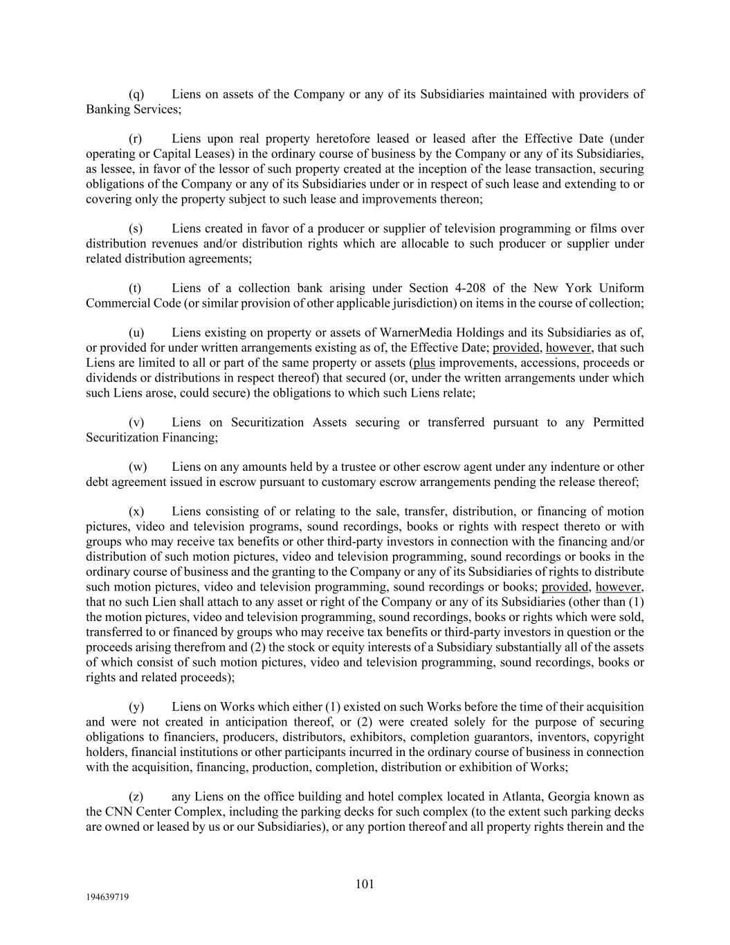 101 194639719 (q) Liens on assets of the Company or any of its Subsidiaries maintained with providers of Banking Services; (r) Liens upon real property heretofore leased or leased after the Effective Date (under operating or Capital Leases) in the ordinary course of business by the Company or any of its Subsidiaries, as lessee, in favor of the lessor of such property created at the inception of the lease transaction, securing obligations of the Company or any of its Subsidiaries under or in respect of such lease and extending to or covering only the property subject to such lease and improvements thereon; (s) Liens created in favor of a producer or supplier of television programming or films over distribution revenues and/or distribution rights which are allocable to such producer or supplier under related distribution agreements; (t) Liens of a collection bank arising under Section 4-208 of the New York Uniform Commercial Code (or similar provision of other applicable jurisdiction) on items in the course of collection; (u) Liens existing on property or assets of WarnerMedia Holdings and its Subsidiaries as of, or provided for under written arrangements existing as of, the Effective Date; provided, however, that such Liens are limited to all or part of the same property or assets (plus improvements, accessions, proceeds or dividends or distributions in respect thereof) that secured (or, under the written arrangements under which such Liens arose, could secure) the obligations to which such Liens relate; (v) Liens on Securitization Assets securing or transferred pursuant to any Permitted Securitization Financing; (w) Liens on any amounts held by a trustee or other escrow agent under any indenture or other debt agreement issued in escrow pursuant to customary escrow arrangements pending the release thereof; (x) Liens consisting of or relating to the sale, transfer, distribution, or financing of motion pictures, video and television programs, sound recordings, books or rights with respect thereto or with groups who may receive tax benefits or other third-party investors in connection with the financing and/or distribution of such motion pictures, video and television programming, sound recordings or books in the ordinary course of business and the granting to the Company or any of its Subsidiaries of rights to distribute such motion pictures, video and television programming, sound recordings or books; provided, however, that no such Lien shall attach to any asset or right of the Company or any of its Subsidiaries (other than (1) the motion pictures, video and television programming, sound recordings, books or rights which were sold, transferred to or financed by groups who may receive tax benefits or third-party investors in question or the proceeds arising therefrom and (2) the stock or equity interests of a Subsidiary substantially all of the assets of which consist of such motion pictures, video and television programming, sound recordings, books or rights and related proceeds); (y) Liens on Works which either (1) existed on such Works before the time of their acquisition and were not created in anticipation thereof, or (2) were created solely for the purpose of securing obligations to financiers, producers, distributors, exhibitors, completion guarantors, inventors, copyright holders, financial institutions or other participants incurred in the ordinary course of business in connection with the acquisition, financing, production, completion, distribution or exhibition of Works; (z) any Liens on the office building and hotel complex located in Atlanta, Georgia known as the CNN Center Complex, including the parking decks for such complex (to the extent such parking decks are owned or leased by us or our Subsidiaries), or any portion thereof and all property rights therein and the
