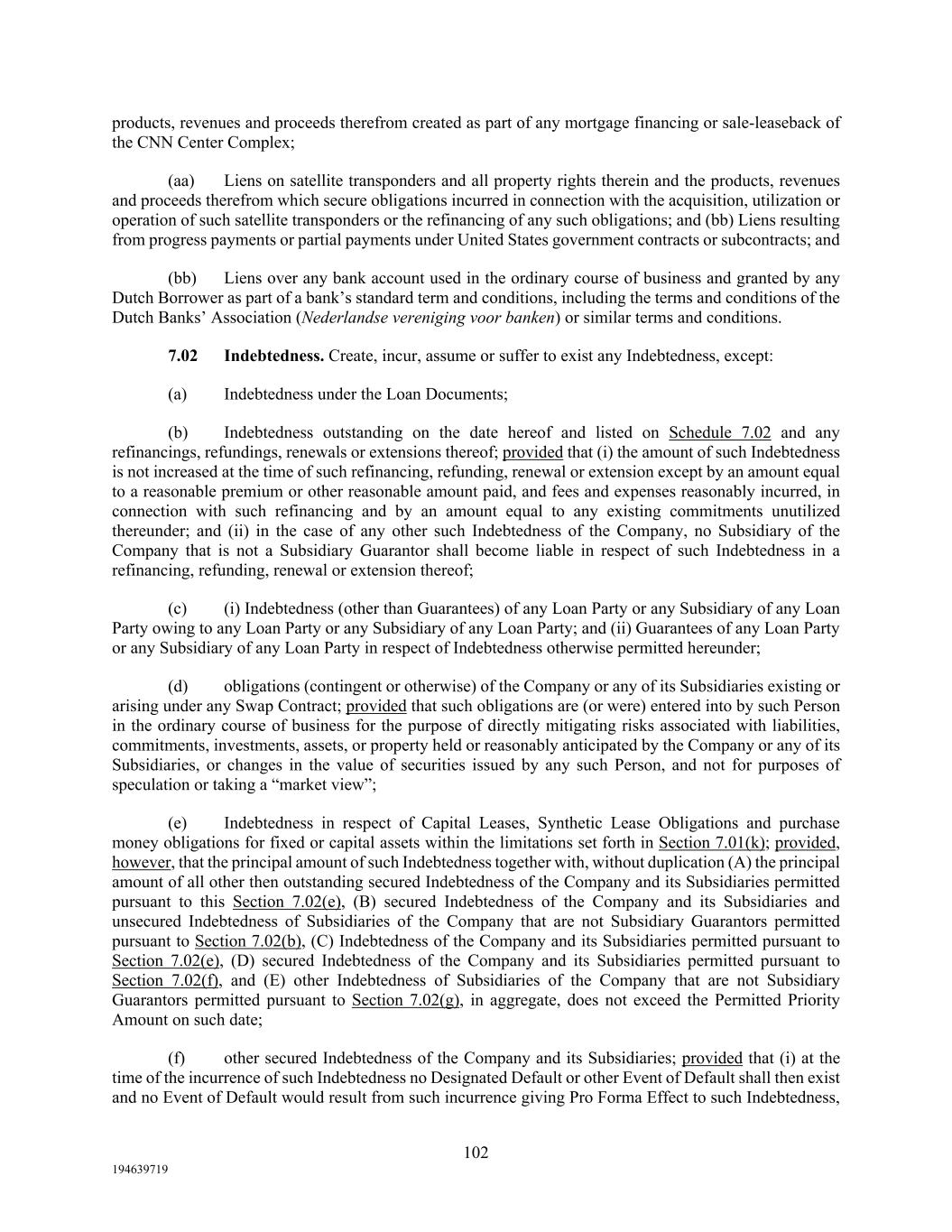 102 194639719 products, revenues and proceeds therefrom created as part of any mortgage financing or sale-leaseback of the CNN Center Complex; (aa) Liens on satellite transponders and all property rights therein and the products, revenues and proceeds therefrom which secure obligations incurred in connection with the acquisition, utilization or operation of such satellite transponders or the refinancing of any such obligations; and (bb) Liens resulting from progress payments or partial payments under United States government contracts or subcontracts; and (bb) Liens over any bank account used in the ordinary course of business and granted by any Dutch Borrower as part of a bank’s standard term and conditions, including the terms and conditions of the Dutch Banks’ Association (Nederlandse vereniging voor banken) or similar terms and conditions. 7.02 Indebtedness. Create, incur, assume or suffer to exist any Indebtedness, except: (a) Indebtedness under the Loan Documents; (b) Indebtedness outstanding on the date hereof and listed on Schedule 7.02 and any refinancings, refundings, renewals or extensions thereof; provided that (i) the amount of such Indebtedness is not increased at the time of such refinancing, refunding, renewal or extension except by an amount equal to a reasonable premium or other reasonable amount paid, and fees and expenses reasonably incurred, in connection with such refinancing and by an amount equal to any existing commitments unutilized thereunder; and (ii) in the case of any other such Indebtedness of the Company, no Subsidiary of the Company that is not a Subsidiary Guarantor shall become liable in respect of such Indebtedness in a refinancing, refunding, renewal or extension thereof; (c) (i) Indebtedness (other than Guarantees) of any Loan Party or any Subsidiary of any Loan Party owing to any Loan Party or any Subsidiary of any Loan Party; and (ii) Guarantees of any Loan Party or any Subsidiary of any Loan Party in respect of Indebtedness otherwise permitted hereunder; (d) obligations (contingent or otherwise) of the Company or any of its Subsidiaries existing or arising under any Swap Contract; provided that such obligations are (or were) entered into by such Person in the ordinary course of business for the purpose of directly mitigating risks associated with liabilities, commitments, investments, assets, or property held or reasonably anticipated by the Company or any of its Subsidiaries, or changes in the value of securities issued by any such Person, and not for purposes of speculation or taking a “market view”; (e) Indebtedness in respect of Capital Leases, Synthetic Lease Obligations and purchase money obligations for fixed or capital assets within the limitations set forth in Section 7.01(k); provided, however, that the principal amount of such Indebtedness together with, without duplication (A) the principal amount of all other then outstanding secured Indebtedness of the Company and its Subsidiaries permitted pursuant to this Section 7.02(e), (B) secured Indebtedness of the Company and its Subsidiaries and unsecured Indebtedness of Subsidiaries of the Company that are not Subsidiary Guarantors permitted pursuant to Section 7.02(b), (C) Indebtedness of the Company and its Subsidiaries permitted pursuant to Section 7.02(e), (D) secured Indebtedness of the Company and its Subsidiaries permitted pursuant to Section 7.02(f), and (E) other Indebtedness of Subsidiaries of the Company that are not Subsidiary Guarantors permitted pursuant to Section 7.02(g), in aggregate, does not exceed the Permitted Priority Amount on such date; (f) other secured Indebtedness of the Company and its Subsidiaries; provided that (i) at the time of the incurrence of such Indebtedness no Designated Default or other Event of Default shall then exist and no Event of Default would result from such incurrence giving Pro Forma Effect to such Indebtedness,