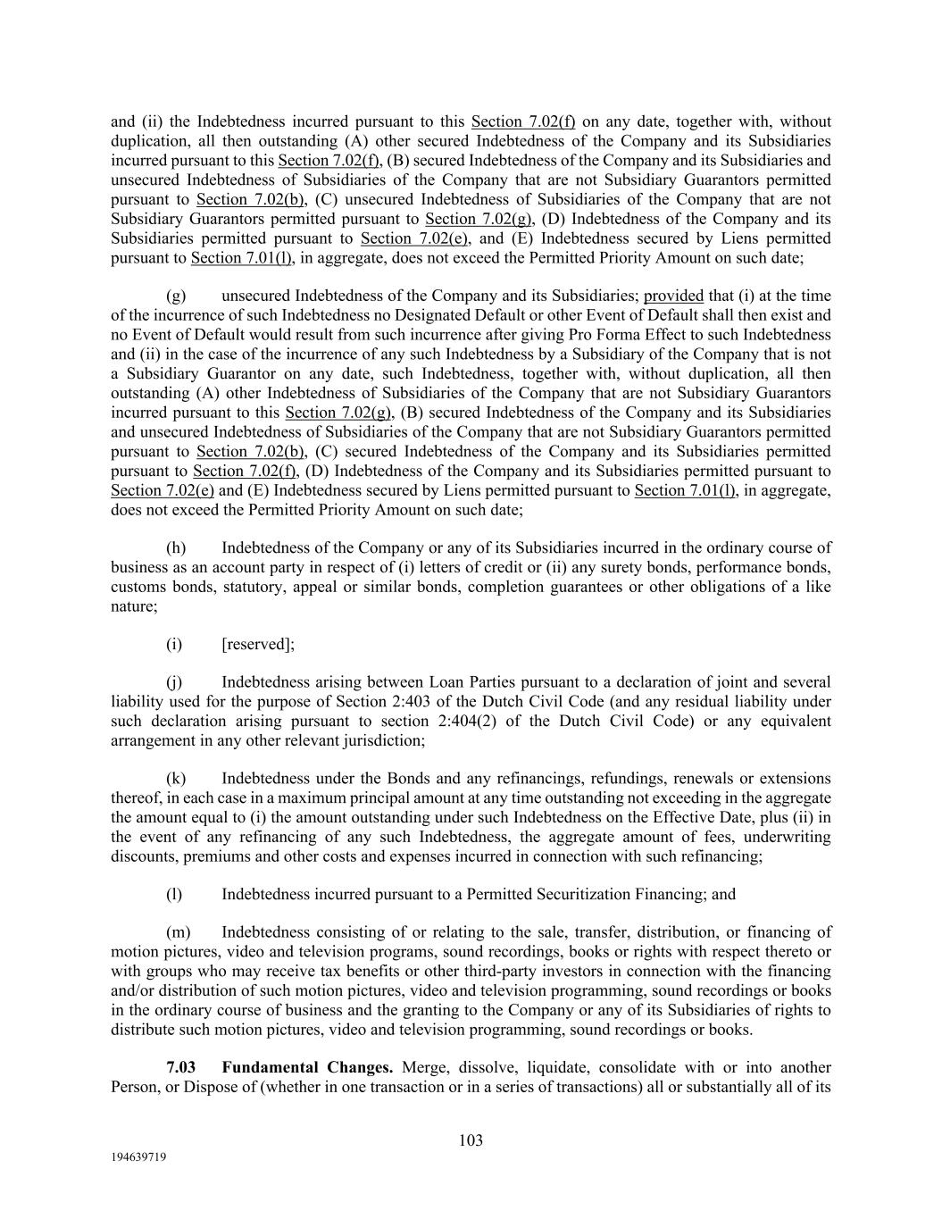 103 194639719 and (ii) the Indebtedness incurred pursuant to this Section 7.02(f) on any date, together with, without duplication, all then outstanding (A) other secured Indebtedness of the Company and its Subsidiaries incurred pursuant to this Section 7.02(f), (B) secured Indebtedness of the Company and its Subsidiaries and unsecured Indebtedness of Subsidiaries of the Company that are not Subsidiary Guarantors permitted pursuant to Section 7.02(b), (C) unsecured Indebtedness of Subsidiaries of the Company that are not Subsidiary Guarantors permitted pursuant to Section 7.02(g), (D) Indebtedness of the Company and its Subsidiaries permitted pursuant to Section 7.02(e), and (E) Indebtedness secured by Liens permitted pursuant to Section 7.01(l), in aggregate, does not exceed the Permitted Priority Amount on such date; (g) unsecured Indebtedness of the Company and its Subsidiaries; provided that (i) at the time of the incurrence of such Indebtedness no Designated Default or other Event of Default shall then exist and no Event of Default would result from such incurrence after giving Pro Forma Effect to such Indebtedness and (ii) in the case of the incurrence of any such Indebtedness by a Subsidiary of the Company that is not a Subsidiary Guarantor on any date, such Indebtedness, together with, without duplication, all then outstanding (A) other Indebtedness of Subsidiaries of the Company that are not Subsidiary Guarantors incurred pursuant to this Section 7.02(g), (B) secured Indebtedness of the Company and its Subsidiaries and unsecured Indebtedness of Subsidiaries of the Company that are not Subsidiary Guarantors permitted pursuant to Section 7.02(b), (C) secured Indebtedness of the Company and its Subsidiaries permitted pursuant to Section 7.02(f), (D) Indebtedness of the Company and its Subsidiaries permitted pursuant to Section 7.02(e) and (E) Indebtedness secured by Liens permitted pursuant to Section 7.01(l), in aggregate, does not exceed the Permitted Priority Amount on such date; (h) Indebtedness of the Company or any of its Subsidiaries incurred in the ordinary course of business as an account party in respect of (i) letters of credit or (ii) any surety bonds, performance bonds, customs bonds, statutory, appeal or similar bonds, completion guarantees or other obligations of a like nature; (i) [reserved]; (j) Indebtedness arising between Loan Parties pursuant to a declaration of joint and several liability used for the purpose of Section 2:403 of the Dutch Civil Code (and any residual liability under such declaration arising pursuant to section 2:404(2) of the Dutch Civil Code) or any equivalent arrangement in any other relevant jurisdiction; (k) Indebtedness under the Bonds and any refinancings, refundings, renewals or extensions thereof, in each case in a maximum principal amount at any time outstanding not exceeding in the aggregate the amount equal to (i) the amount outstanding under such Indebtedness on the Effective Date, plus (ii) in the event of any refinancing of any such Indebtedness, the aggregate amount of fees, underwriting discounts, premiums and other costs and expenses incurred in connection with such refinancing; (l) Indebtedness incurred pursuant to a Permitted Securitization Financing; and (m) Indebtedness consisting of or relating to the sale, transfer, distribution, or financing of motion pictures, video and television programs, sound recordings, books or rights with respect thereto or with groups who may receive tax benefits or other third-party investors in connection with the financing and/or distribution of such motion pictures, video and television programming, sound recordings or books in the ordinary course of business and the granting to the Company or any of its Subsidiaries of rights to distribute such motion pictures, video and television programming, sound recordings or books. 7.03 Fundamental Changes. Merge, dissolve, liquidate, consolidate with or into another Person, or Dispose of (whether in one transaction or in a series of transactions) all or substantially all of its
