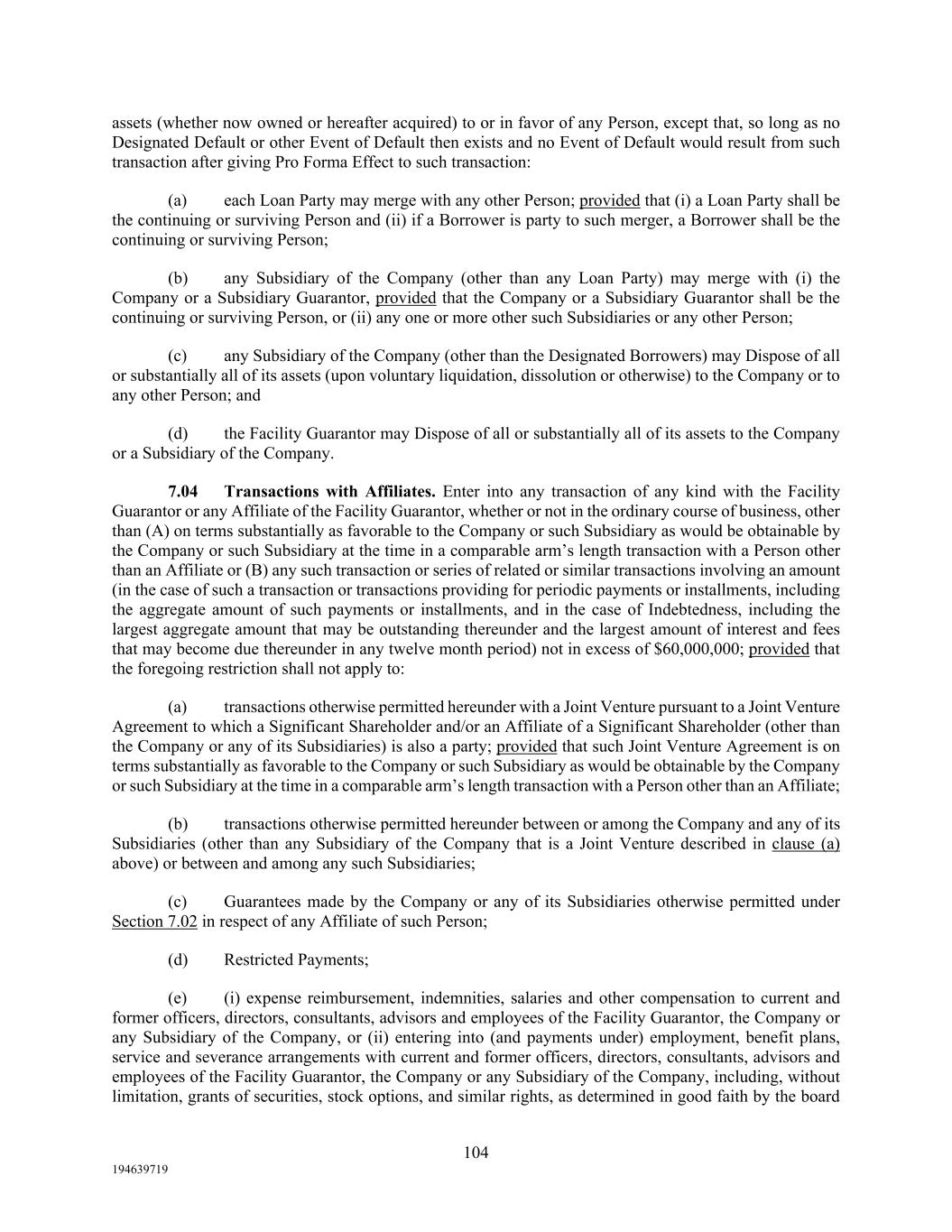 104 194639719 assets (whether now owned or hereafter acquired) to or in favor of any Person, except that, so long as no Designated Default or other Event of Default then exists and no Event of Default would result from such transaction after giving Pro Forma Effect to such transaction: (a) each Loan Party may merge with any other Person; provided that (i) a Loan Party shall be the continuing or surviving Person and (ii) if a Borrower is party to such merger, a Borrower shall be the continuing or surviving Person; (b) any Subsidiary of the Company (other than any Loan Party) may merge with (i) the Company or a Subsidiary Guarantor, provided that the Company or a Subsidiary Guarantor shall be the continuing or surviving Person, or (ii) any one or more other such Subsidiaries or any other Person; (c) any Subsidiary of the Company (other than the Designated Borrowers) may Dispose of all or substantially all of its assets (upon voluntary liquidation, dissolution or otherwise) to the Company or to any other Person; and (d) the Facility Guarantor may Dispose of all or substantially all of its assets to the Company or a Subsidiary of the Company. 7.04 Transactions with Affiliates. Enter into any transaction of any kind with the Facility Guarantor or any Affiliate of the Facility Guarantor, whether or not in the ordinary course of business, other than (A) on terms substantially as favorable to the Company or such Subsidiary as would be obtainable by the Company or such Subsidiary at the time in a comparable arm’s length transaction with a Person other than an Affiliate or (B) any such transaction or series of related or similar transactions involving an amount (in the case of such a transaction or transactions providing for periodic payments or installments, including the aggregate amount of such payments or installments, and in the case of Indebtedness, including the largest aggregate amount that may be outstanding thereunder and the largest amount of interest and fees that may become due thereunder in any twelve month period) not in excess of $60,000,000; provided that the foregoing restriction shall not apply to: (a) transactions otherwise permitted hereunder with a Joint Venture pursuant to a Joint Venture Agreement to which a Significant Shareholder and/or an Affiliate of a Significant Shareholder (other than the Company or any of its Subsidiaries) is also a party; provided that such Joint Venture Agreement is on terms substantially as favorable to the Company or such Subsidiary as would be obtainable by the Company or such Subsidiary at the time in a comparable arm’s length transaction with a Person other than an Affiliate; (b) transactions otherwise permitted hereunder between or among the Company and any of its Subsidiaries (other than any Subsidiary of the Company that is a Joint Venture described in clause (a) above) or between and among any such Subsidiaries; (c) Guarantees made by the Company or any of its Subsidiaries otherwise permitted under Section 7.02 in respect of any Affiliate of such Person; (d) Restricted Payments; (e) (i) expense reimbursement, indemnities, salaries and other compensation to current and former officers, directors, consultants, advisors and employees of the Facility Guarantor, the Company or any Subsidiary of the Company, or (ii) entering into (and payments under) employment, benefit plans, service and severance arrangements with current and former officers, directors, consultants, advisors and employees of the Facility Guarantor, the Company or any Subsidiary of the Company, including, without limitation, grants of securities, stock options, and similar rights, as determined in good faith by the board
