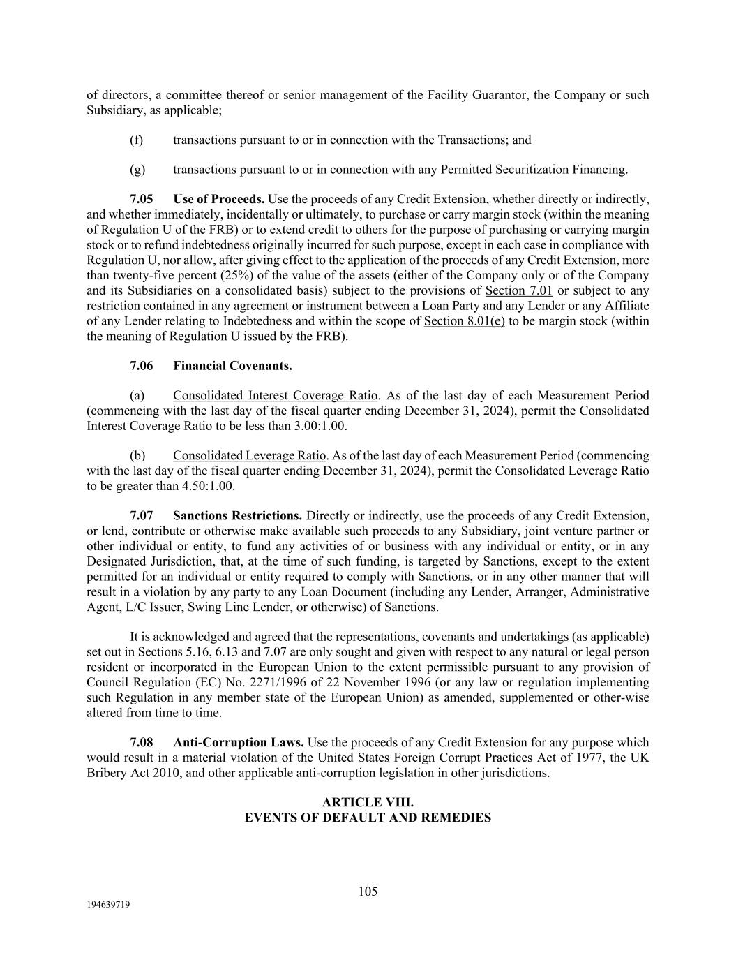 105 194639719 of directors, a committee thereof or senior management of the Facility Guarantor, the Company or such Subsidiary, as applicable; (f) transactions pursuant to or in connection with the Transactions; and (g) transactions pursuant to or in connection with any Permitted Securitization Financing. 7.05 Use of Proceeds. Use the proceeds of any Credit Extension, whether directly or indirectly, and whether immediately, incidentally or ultimately, to purchase or carry margin stock (within the meaning of Regulation U of the FRB) or to extend credit to others for the purpose of purchasing or carrying margin stock or to refund indebtedness originally incurred for such purpose, except in each case in compliance with Regulation U, nor allow, after giving effect to the application of the proceeds of any Credit Extension, more than twenty-five percent (25%) of the value of the assets (either of the Company only or of the Company and its Subsidiaries on a consolidated basis) subject to the provisions of Section 7.01 or subject to any restriction contained in any agreement or instrument between a Loan Party and any Lender or any Affiliate of any Lender relating to Indebtedness and within the scope of Section 8.01(e) to be margin stock (within the meaning of Regulation U issued by the FRB). 7.06 Financial Covenants. (a) Consolidated Interest Coverage Ratio. As of the last day of each Measurement Period (commencing with the last day of the fiscal quarter ending December 31, 2024), permit the Consolidated Interest Coverage Ratio to be less than 3.00:1.00. (b) Consolidated Leverage Ratio. As of the last day of each Measurement Period (commencing with the last day of the fiscal quarter ending December 31, 2024), permit the Consolidated Leverage Ratio to be greater than 4.50:1.00. 7.07 Sanctions Restrictions. Directly or indirectly, use the proceeds of any Credit Extension, or lend, contribute or otherwise make available such proceeds to any Subsidiary, joint venture partner or other individual or entity, to fund any activities of or business with any individual or entity, or in any Designated Jurisdiction, that, at the time of such funding, is targeted by Sanctions, except to the extent permitted for an individual or entity required to comply with Sanctions, or in any other manner that will result in a violation by any party to any Loan Document (including any Lender, Arranger, Administrative Agent, L/C Issuer, Swing Line Lender, or otherwise) of Sanctions. It is acknowledged and agreed that the representations, covenants and undertakings (as applicable) set out in Sections 5.16, 6.13 and 7.07 are only sought and given with respect to any natural or legal person resident or incorporated in the European Union to the extent permissible pursuant to any provision of Council Regulation (EC) No. 2271/1996 of 22 November 1996 (or any law or regulation implementing such Regulation in any member state of the European Union) as amended, supplemented or other-wise altered from time to time. 7.08 Anti-Corruption Laws. Use the proceeds of any Credit Extension for any purpose which would result in a material violation of the United States Foreign Corrupt Practices Act of 1977, the UK Bribery Act 2010, and other applicable anti-corruption legislation in other jurisdictions. ARTICLE VIII. EVENTS OF DEFAULT AND REMEDIES