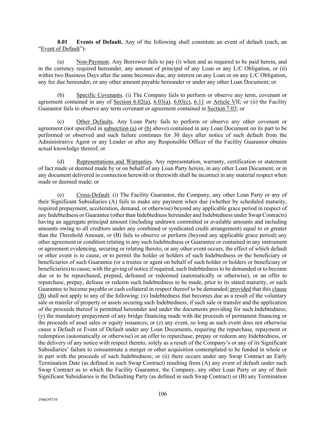 106 194639719 8.01 Events of Default. Any of the following shall constitute an event of default (each, an “Event of Default”): (a) Non-Payment. Any Borrower fails to pay (i) when and as required to be paid herein, and in the currency required hereunder, any amount of principal of any Loan or any L/C Obligation, or (ii) within two Business Days after the same becomes due, any interest on any Loan or on any L/C Obligation, any fee due hereunder, or any other amount payable hereunder or under any other Loan Document; or (b) Specific Covenants. (i) The Company fails to perform or observe any term, covenant or agreement contained in any of Section 6.02(a), 6.03(a), 6.03(c), 6.11 or Article VII; or (ii) the Facility Guarantor fails to observe any term covenant or agreement contained in Section 7.03; or (c) Other Defaults. Any Loan Party fails to perform or observe any other covenant or agreement (not specified in subsection (a) or (b) above) contained in any Loan Document on its part to be performed or observed and such failure continues for 30 days after notice of such default from the Administrative Agent or any Lender or after any Responsible Officer of the Facility Guarantor obtains actual knowledge thereof; or (d) Representations and Warranties. Any representation, warranty, certification or statement of fact made or deemed made by or on behalf of any Loan Party herein, in any other Loan Document, or in any document delivered in connection herewith or therewith shall be incorrect in any material respect when made or deemed made; or (e) Cross-Default. (i) The Facility Guarantor, the Company, any other Loan Party or any of their Significant Subsidiaries (A) fails to make any payment when due (whether by scheduled maturity, required prepayment, acceleration, demand, or otherwise) beyond any applicable grace period in respect of any Indebtedness or Guarantee (other than Indebtedness hereunder and Indebtedness under Swap Contracts) having an aggregate principal amount (including undrawn committed or available amounts and including amounts owing to all creditors under any combined or syndicated credit arrangement) equal to or greater than the Threshold Amount, or (B) fails to observe or perform (beyond any applicable grace period) any other agreement or condition relating to any such Indebtedness or Guarantee or contained in any instrument or agreement evidencing, securing or relating thereto, or any other event occurs, the effect of which default or other event is to cause, or to permit the holder or holders of such Indebtedness or the beneficiary or beneficiaries of such Guarantee (or a trustee or agent on behalf of such holder or holders or beneficiary or beneficiaries) to cause, with the giving of notice if required, such Indebtedness to be demanded or to become due or to be repurchased, prepaid, defeased or redeemed (automatically or otherwise), or an offer to repurchase, prepay, defease or redeem such Indebtedness to be made, prior to its stated maturity, or such Guarantee to become payable or cash collateral in respect thereof to be demanded; provided that this clause (B) shall not apply to any of the following: (x) Indebtedness that becomes due as a result of the voluntary sale or transfer of property or assets securing such Indebtedness, if such sale or transfer and the application of the proceeds thereof is permitted hereunder and under the documents providing for such Indebtedness; (y) the mandatory prepayment of any bridge financing made with the proceeds of permanent financing or the proceeds of asset sales or equity issuances; or (z) any event, so long as such event does not otherwise cause a Default or Event of Default under any Loan Documents, requiring the repurchase, repayment or redemption (automatically or otherwise) or an offer to repurchase, prepay or redeem any Indebtedness, or the delivery of any notice with respect thereto, solely as a result of the Company’s or any of its Significant Subsidiaries’ failure to consummate a merger or other acquisition contemplated to be funded in whole or in part with the proceeds of such Indebtedness; or (ii) there occurs under any Swap Contract an Early Termination Date (as defined in such Swap Contract) resulting from (A) any event of default under such Swap Contract as to which the Facility Guarantor, the Company, any other Loan Party or any of their Significant Subsidiaries is the Defaulting Party (as defined in such Swap Contract) or (B) any Termination