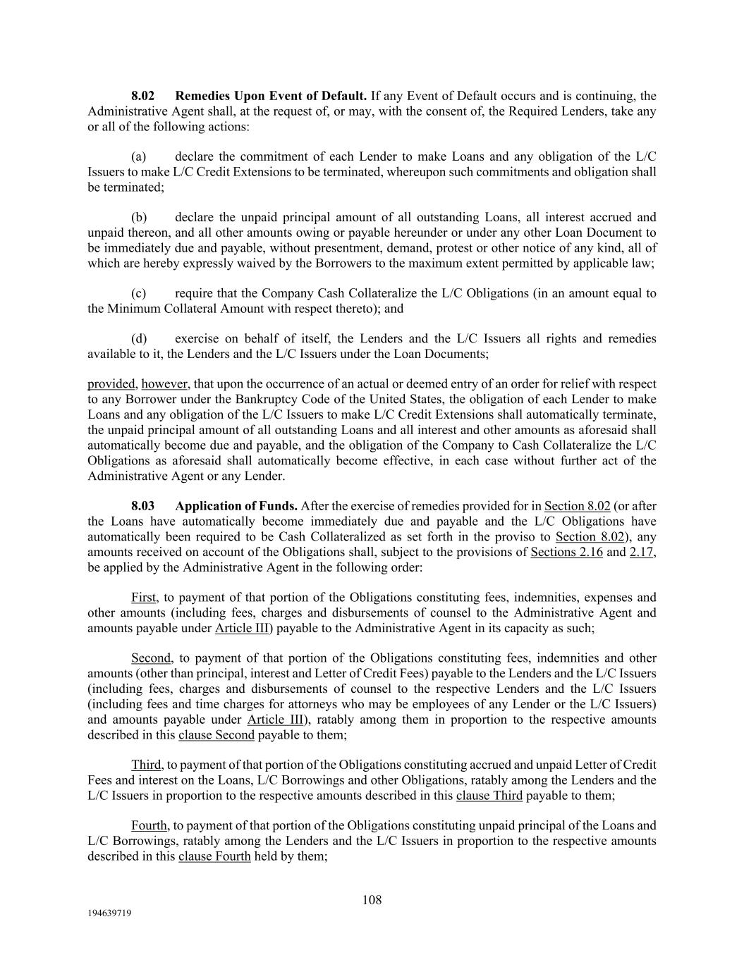 108 194639719 8.02 Remedies Upon Event of Default. If any Event of Default occurs and is continuing, the Administrative Agent shall, at the request of, or may, with the consent of, the Required Lenders, take any or all of the following actions: (a) declare the commitment of each Lender to make Loans and any obligation of the L/C Issuers to make L/C Credit Extensions to be terminated, whereupon such commitments and obligation shall be terminated; (b) declare the unpaid principal amount of all outstanding Loans, all interest accrued and unpaid thereon, and all other amounts owing or payable hereunder or under any other Loan Document to be immediately due and payable, without presentment, demand, protest or other notice of any kind, all of which are hereby expressly waived by the Borrowers to the maximum extent permitted by applicable law; (c) require that the Company Cash Collateralize the L/C Obligations (in an amount equal to the Minimum Collateral Amount with respect thereto); and (d) exercise on behalf of itself, the Lenders and the L/C Issuers all rights and remedies available to it, the Lenders and the L/C Issuers under the Loan Documents; provided, however, that upon the occurrence of an actual or deemed entry of an order for relief with respect to any Borrower under the Bankruptcy Code of the United States, the obligation of each Lender to make Loans and any obligation of the L/C Issuers to make L/C Credit Extensions shall automatically terminate, the unpaid principal amount of all outstanding Loans and all interest and other amounts as aforesaid shall automatically become due and payable, and the obligation of the Company to Cash Collateralize the L/C Obligations as aforesaid shall automatically become effective, in each case without further act of the Administrative Agent or any Lender. 8.03 Application of Funds. After the exercise of remedies provided for in Section 8.02 (or after the Loans have automatically become immediately due and payable and the L/C Obligations have automatically been required to be Cash Collateralized as set forth in the proviso to Section 8.02), any amounts received on account of the Obligations shall, subject to the provisions of Sections 2.16 and 2.17, be applied by the Administrative Agent in the following order: First, to payment of that portion of the Obligations constituting fees, indemnities, expenses and other amounts (including fees, charges and disbursements of counsel to the Administrative Agent and amounts payable under Article III) payable to the Administrative Agent in its capacity as such; Second, to payment of that portion of the Obligations constituting fees, indemnities and other amounts (other than principal, interest and Letter of Credit Fees) payable to the Lenders and the L/C Issuers (including fees, charges and disbursements of counsel to the respective Lenders and the L/C Issuers (including fees and time charges for attorneys who may be employees of any Lender or the L/C Issuers) and amounts payable under Article III), ratably among them in proportion to the respective amounts described in this clause Second payable to them; Third, to payment of that portion of the Obligations constituting accrued and unpaid Letter of Credit Fees and interest on the Loans, L/C Borrowings and other Obligations, ratably among the Lenders and the L/C Issuers in proportion to the respective amounts described in this clause Third payable to them; Fourth, to payment of that portion of the Obligations constituting unpaid principal of the Loans and L/C Borrowings, ratably among the Lenders and the L/C Issuers in proportion to the respective amounts described in this clause Fourth held by them;