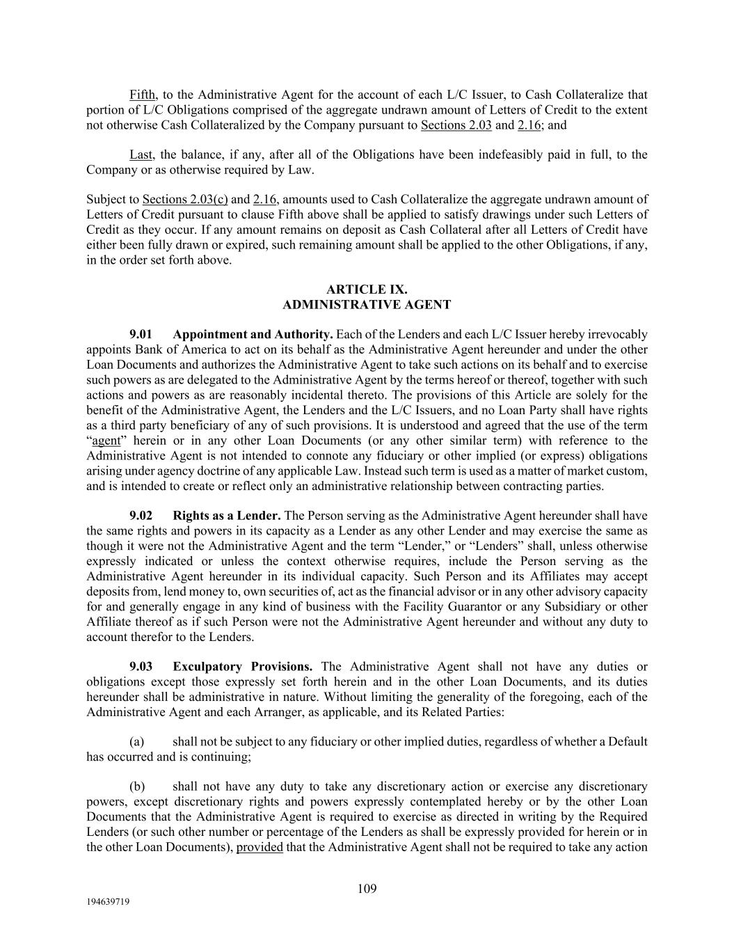 109 194639719 Fifth, to the Administrative Agent for the account of each L/C Issuer, to Cash Collateralize that portion of L/C Obligations comprised of the aggregate undrawn amount of Letters of Credit to the extent not otherwise Cash Collateralized by the Company pursuant to Sections 2.03 and 2.16; and Last, the balance, if any, after all of the Obligations have been indefeasibly paid in full, to the Company or as otherwise required by Law. Subject to Sections 2.03(c) and 2.16, amounts used to Cash Collateralize the aggregate undrawn amount of Letters of Credit pursuant to clause Fifth above shall be applied to satisfy drawings under such Letters of Credit as they occur. If any amount remains on deposit as Cash Collateral after all Letters of Credit have either been fully drawn or expired, such remaining amount shall be applied to the other Obligations, if any, in the order set forth above. ARTICLE IX. ADMINISTRATIVE AGENT 9.01 Appointment and Authority. Each of the Lenders and each L/C Issuer hereby irrevocably appoints Bank of America to act on its behalf as the Administrative Agent hereunder and under the other Loan Documents and authorizes the Administrative Agent to take such actions on its behalf and to exercise such powers as are delegated to the Administrative Agent by the terms hereof or thereof, together with such actions and powers as are reasonably incidental thereto. The provisions of this Article are solely for the benefit of the Administrative Agent, the Lenders and the L/C Issuers, and no Loan Party shall have rights as a third party beneficiary of any of such provisions. It is understood and agreed that the use of the term “agent” herein or in any other Loan Documents (or any other similar term) with reference to the Administrative Agent is not intended to connote any fiduciary or other implied (or express) obligations arising under agency doctrine of any applicable Law. Instead such term is used as a matter of market custom, and is intended to create or reflect only an administrative relationship between contracting parties. 9.02 Rights as a Lender. The Person serving as the Administrative Agent hereunder shall have the same rights and powers in its capacity as a Lender as any other Lender and may exercise the same as though it were not the Administrative Agent and the term “Lender,” or “Lenders” shall, unless otherwise expressly indicated or unless the context otherwise requires, include the Person serving as the Administrative Agent hereunder in its individual capacity. Such Person and its Affiliates may accept deposits from, lend money to, own securities of, act as the financial advisor or in any other advisory capacity for and generally engage in any kind of business with the Facility Guarantor or any Subsidiary or other Affiliate thereof as if such Person were not the Administrative Agent hereunder and without any duty to account therefor to the Lenders. 9.03 Exculpatory Provisions. The Administrative Agent shall not have any duties or obligations except those expressly set forth herein and in the other Loan Documents, and its duties hereunder shall be administrative in nature. Without limiting the generality of the foregoing, each of the Administrative Agent and each Arranger, as applicable, and its Related Parties: (a) shall not be subject to any fiduciary or other implied duties, regardless of whether a Default has occurred and is continuing; (b) shall not have any duty to take any discretionary action or exercise any discretionary powers, except discretionary rights and powers expressly contemplated hereby or by the other Loan Documents that the Administrative Agent is required to exercise as directed in writing by the Required Lenders (or such other number or percentage of the Lenders as shall be expressly provided for herein or in the other Loan Documents), provided that the Administrative Agent shall not be required to take any action