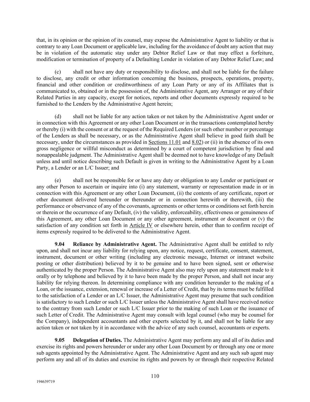 110 194639719 that, in its opinion or the opinion of its counsel, may expose the Administrative Agent to liability or that is contrary to any Loan Document or applicable law, including for the avoidance of doubt any action that may be in violation of the automatic stay under any Debtor Relief Law or that may effect a forfeiture, modification or termination of property of a Defaulting Lender in violation of any Debtor Relief Law; and (c) shall not have any duty or responsibility to disclose, and shall not be liable for the failure to disclose, any credit or other information concerning the business, prospects, operations, property, financial and other condition or creditworthiness of any Loan Party or any of its Affiliates that is communicated to, obtained or in the possession of, the Administrative Agent, any Arranger or any of their Related Parties in any capacity, except for notices, reports and other documents expressly required to be furnished to the Lenders by the Administrative Agent herein; (d) shall not be liable for any action taken or not taken by the Administrative Agent under or in connection with this Agreement or any other Loan Document or in the transactions contemplated hereby or thereby (i) with the consent or at the request of the Required Lenders (or such other number or percentage of the Lenders as shall be necessary, or as the Administrative Agent shall believe in good faith shall be necessary, under the circumstances as provided in Sections 11.01 and 8.02) or (ii) in the absence of its own gross negligence or willful misconduct as determined by a court of competent jurisdiction by final and nonappealable judgment. The Administrative Agent shall be deemed not to have knowledge of any Default unless and until notice describing such Default is given in writing to the Administrative Agent by a Loan Party, a Lender or an L/C Issuer; and (e) shall not be responsible for or have any duty or obligation to any Lender or participant or any other Person to ascertain or inquire into (i) any statement, warranty or representation made in or in connection with this Agreement or any other Loan Document, (ii) the contents of any certificate, report or other document delivered hereunder or thereunder or in connection herewith or therewith, (iii) the performance or observance of any of the covenants, agreements or other terms or conditions set forth herein or therein or the occurrence of any Default, (iv) the validity, enforceability, effectiveness or genuineness of this Agreement, any other Loan Document or any other agreement, instrument or document or (v) the satisfaction of any condition set forth in Article IV or elsewhere herein, other than to confirm receipt of items expressly required to be delivered to the Administrative Agent. 9.04 Reliance by Administrative Agent. The Administrative Agent shall be entitled to rely upon, and shall not incur any liability for relying upon, any notice, request, certificate, consent, statement, instrument, document or other writing (including any electronic message, Internet or intranet website posting or other distribution) believed by it to be genuine and to have been signed, sent or otherwise authenticated by the proper Person. The Administrative Agent also may rely upon any statement made to it orally or by telephone and believed by it to have been made by the proper Person, and shall not incur any liability for relying thereon. In determining compliance with any condition hereunder to the making of a Loan, or the issuance, extension, renewal or increase of a Letter of Credit, that by its terms must be fulfilled to the satisfaction of a Lender or an L/C Issuer, the Administrative Agent may presume that such condition is satisfactory to such Lender or such L/C Issuer unless the Administrative Agent shall have received notice to the contrary from such Lender or such L/C Issuer prior to the making of such Loan or the issuance of such Letter of Credit. The Administrative Agent may consult with legal counsel (who may be counsel for the Company), independent accountants and other experts selected by it, and shall not be liable for any action taken or not taken by it in accordance with the advice of any such counsel, accountants or experts. 9.05 Delegation of Duties. The Administrative Agent may perform any and all of its duties and exercise its rights and powers hereunder or under any other Loan Document by or through any one or more sub agents appointed by the Administrative Agent. The Administrative Agent and any such sub agent may perform any and all of its duties and exercise its rights and powers by or through their respective Related