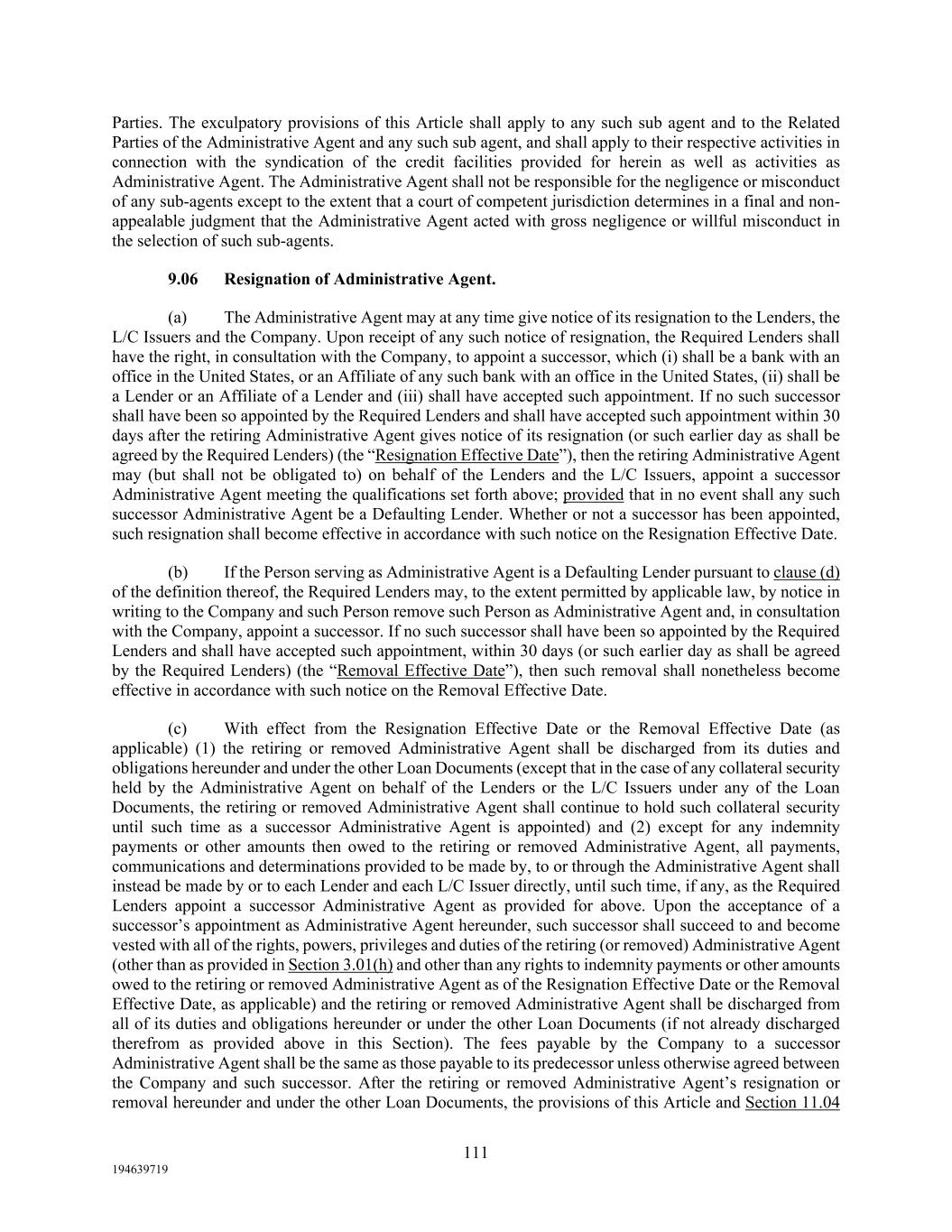 111 194639719 Parties. The exculpatory provisions of this Article shall apply to any such sub agent and to the Related Parties of the Administrative Agent and any such sub agent, and shall apply to their respective activities in connection with the syndication of the credit facilities provided for herein as well as activities as Administrative Agent. The Administrative Agent shall not be responsible for the negligence or misconduct of any sub-agents except to the extent that a court of competent jurisdiction determines in a final and non- appealable judgment that the Administrative Agent acted with gross negligence or willful misconduct in the selection of such sub-agents. 9.06 Resignation of Administrative Agent. (a) The Administrative Agent may at any time give notice of its resignation to the Lenders, the L/C Issuers and the Company. Upon receipt of any such notice of resignation, the Required Lenders shall have the right, in consultation with the Company, to appoint a successor, which (i) shall be a bank with an office in the United States, or an Affiliate of any such bank with an office in the United States, (ii) shall be a Lender or an Affiliate of a Lender and (iii) shall have accepted such appointment. If no such successor shall have been so appointed by the Required Lenders and shall have accepted such appointment within 30 days after the retiring Administrative Agent gives notice of its resignation (or such earlier day as shall be agreed by the Required Lenders) (the “Resignation Effective Date”), then the retiring Administrative Agent may (but shall not be obligated to) on behalf of the Lenders and the L/C Issuers, appoint a successor Administrative Agent meeting the qualifications set forth above; provided that in no event shall any such successor Administrative Agent be a Defaulting Lender. Whether or not a successor has been appointed, such resignation shall become effective in accordance with such notice on the Resignation Effective Date. (b) If the Person serving as Administrative Agent is a Defaulting Lender pursuant to clause (d) of the definition thereof, the Required Lenders may, to the extent permitted by applicable law, by notice in writing to the Company and such Person remove such Person as Administrative Agent and, in consultation with the Company, appoint a successor. If no such successor shall have been so appointed by the Required Lenders and shall have accepted such appointment, within 30 days (or such earlier day as shall be agreed by the Required Lenders) (the “Removal Effective Date”), then such removal shall nonetheless become effective in accordance with such notice on the Removal Effective Date. (c) With effect from the Resignation Effective Date or the Removal Effective Date (as applicable) (1) the retiring or removed Administrative Agent shall be discharged from its duties and obligations hereunder and under the other Loan Documents (except that in the case of any collateral security held by the Administrative Agent on behalf of the Lenders or the L/C Issuers under any of the Loan Documents, the retiring or removed Administrative Agent shall continue to hold such collateral security until such time as a successor Administrative Agent is appointed) and (2) except for any indemnity payments or other amounts then owed to the retiring or removed Administrative Agent, all payments, communications and determinations provided to be made by, to or through the Administrative Agent shall instead be made by or to each Lender and each L/C Issuer directly, until such time, if any, as the Required Lenders appoint a successor Administrative Agent as provided for above. Upon the acceptance of a successor’s appointment as Administrative Agent hereunder, such successor shall succeed to and become vested with all of the rights, powers, privileges and duties of the retiring (or removed) Administrative Agent (other than as provided in Section 3.01(h) and other than any rights to indemnity payments or other amounts owed to the retiring or removed Administrative Agent as of the Resignation Effective Date or the Removal Effective Date, as applicable) and the retiring or removed Administrative Agent shall be discharged from all of its duties and obligations hereunder or under the other Loan Documents (if not already discharged therefrom as provided above in this Section). The fees payable by the Company to a successor Administrative Agent shall be the same as those payable to its predecessor unless otherwise agreed between the Company and such successor. After the retiring or removed Administrative Agent’s resignation or removal hereunder and under the other Loan Documents, the provisions of this Article and Section 11.04