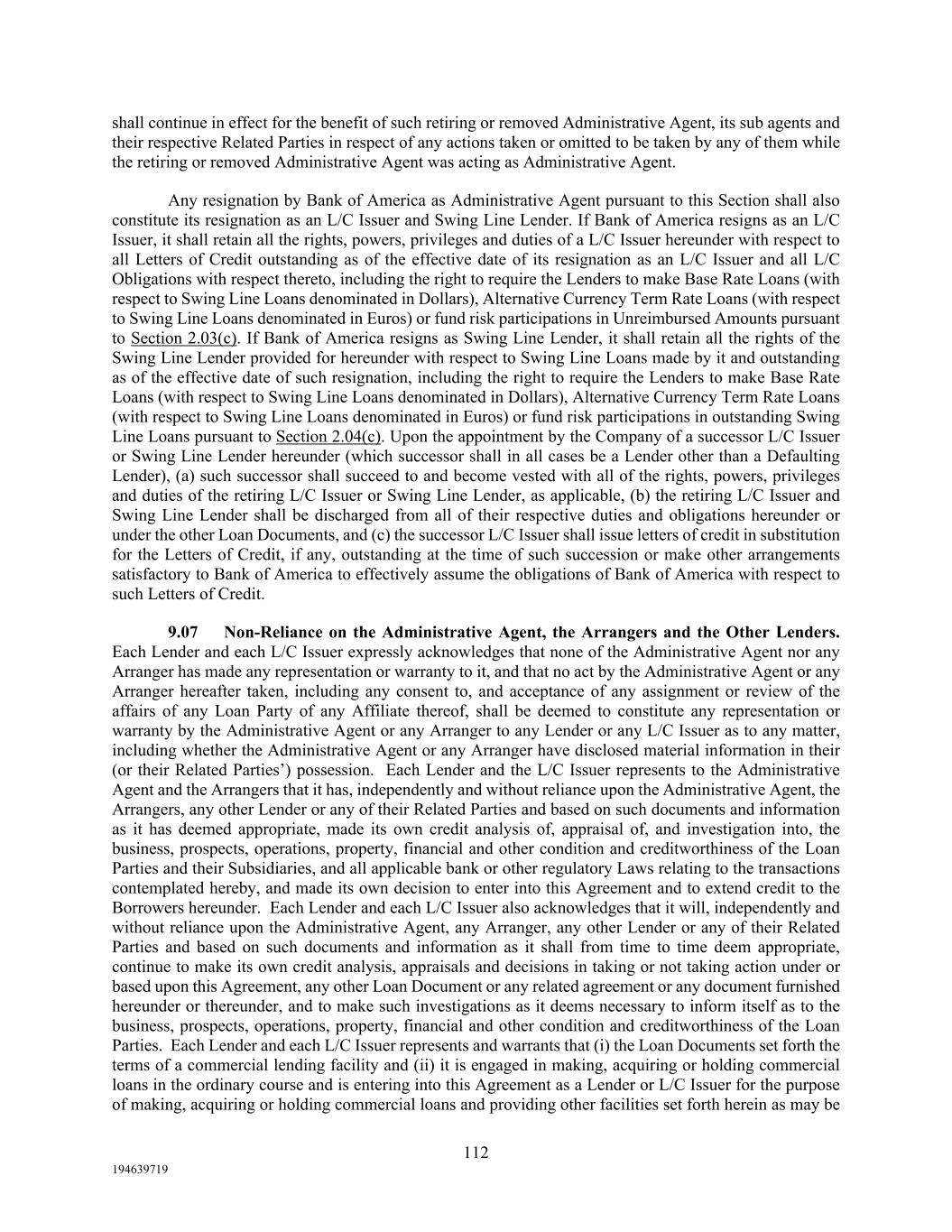 112 194639719 shall continue in effect for the benefit of such retiring or removed Administrative Agent, its sub agents and their respective Related Parties in respect of any actions taken or omitted to be taken by any of them while the retiring or removed Administrative Agent was acting as Administrative Agent. Any resignation by Bank of America as Administrative Agent pursuant to this Section shall also constitute its resignation as an L/C Issuer and Swing Line Lender. If Bank of America resigns as an L/C Issuer, it shall retain all the rights, powers, privileges and duties of a L/C Issuer hereunder with respect to all Letters of Credit outstanding as of the effective date of its resignation as an L/C Issuer and all L/C Obligations with respect thereto, including the right to require the Lenders to make Base Rate Loans (with respect to Swing Line Loans denominated in Dollars), Alternative Currency Term Rate Loans (with respect to Swing Line Loans denominated in Euros) or fund risk participations in Unreimbursed Amounts pursuant to Section 2.03(c). If Bank of America resigns as Swing Line Lender, it shall retain all the rights of the Swing Line Lender provided for hereunder with respect to Swing Line Loans made by it and outstanding as of the effective date of such resignation, including the right to require the Lenders to make Base Rate Loans (with respect to Swing Line Loans denominated in Dollars), Alternative Currency Term Rate Loans (with respect to Swing Line Loans denominated in Euros) or fund risk participations in outstanding Swing Line Loans pursuant to Section 2.04(c). Upon the appointment by the Company of a successor L/C Issuer or Swing Line Lender hereunder (which successor shall in all cases be a Lender other than a Defaulting Lender), (a) such successor shall succeed to and become vested with all of the rights, powers, privileges and duties of the retiring L/C Issuer or Swing Line Lender, as applicable, (b) the retiring L/C Issuer and Swing Line Lender shall be discharged from all of their respective duties and obligations hereunder or under the other Loan Documents, and (c) the successor L/C Issuer shall issue letters of credit in substitution for the Letters of Credit, if any, outstanding at the time of such succession or make other arrangements satisfactory to Bank of America to effectively assume the obligations of Bank of America with respect to such Letters of Credit. 9.07 Non-Reliance on the Administrative Agent, the Arrangers and the Other Lenders. Each Lender and each L/C Issuer expressly acknowledges that none of the Administrative Agent nor any Arranger has made any representation or warranty to it, and that no act by the Administrative Agent or any Arranger hereafter taken, including any consent to, and acceptance of any assignment or review of the affairs of any Loan Party of any Affiliate thereof, shall be deemed to constitute any representation or warranty by the Administrative Agent or any Arranger to any Lender or any L/C Issuer as to any matter, including whether the Administrative Agent or any Arranger have disclosed material information in their (or their Related Parties’) possession. Each Lender and the L/C Issuer represents to the Administrative Agent and the Arrangers that it has, independently and without reliance upon the Administrative Agent, the Arrangers, any other Lender or any of their Related Parties and based on such documents and information as it has deemed appropriate, made its own credit analysis of, appraisal of, and investigation into, the business, prospects, operations, property, financial and other condition and creditworthiness of the Loan Parties and their Subsidiaries, and all applicable bank or other regulatory Laws relating to the transactions contemplated hereby, and made its own decision to enter into this Agreement and to extend credit to the Borrowers hereunder. Each Lender and each L/C Issuer also acknowledges that it will, independently and without reliance upon the Administrative Agent, any Arranger, any other Lender or any of their Related Parties and based on such documents and information as it shall from time to time deem appropriate, continue to make its own credit analysis, appraisals and decisions in taking or not taking action under or based upon this Agreement, any other Loan Document or any related agreement or any document furnished hereunder or thereunder, and to make such investigations as it deems necessary to inform itself as to the business, prospects, operations, property, financial and other condition and creditworthiness of the Loan Parties. Each Lender and each L/C Issuer represents and warrants that (i) the Loan Documents set forth the terms of a commercial lending facility and (ii) it is engaged in making, acquiring or holding commercial loans in the ordinary course and is entering into this Agreement as a Lender or L/C Issuer for the purpose of making, acquiring or holding commercial loans and providing other facilities set forth herein as may be
