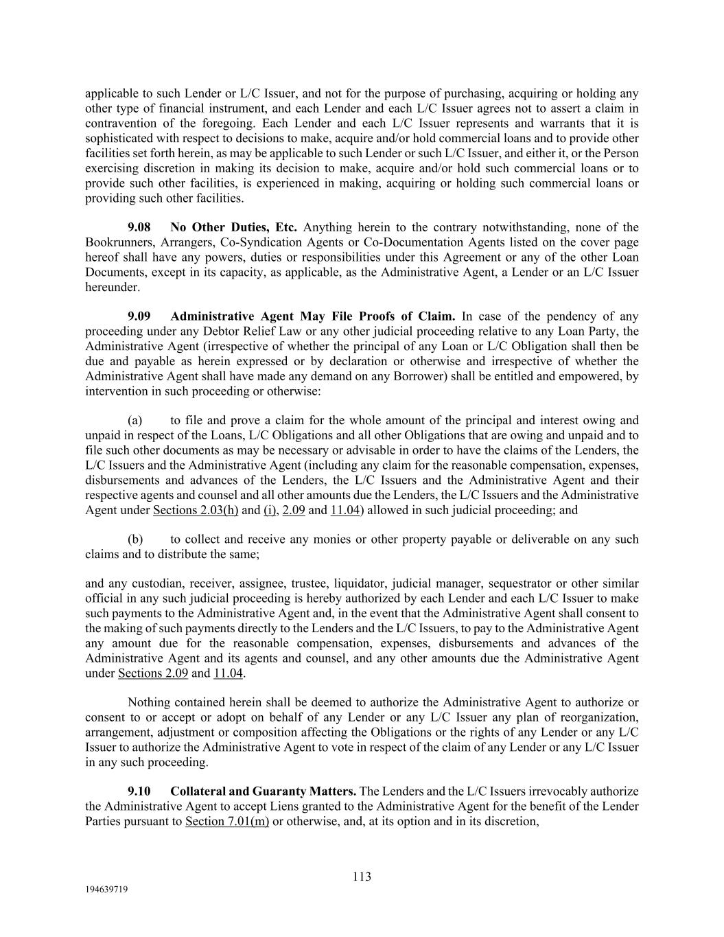 113 194639719 applicable to such Lender or L/C Issuer, and not for the purpose of purchasing, acquiring or holding any other type of financial instrument, and each Lender and each L/C Issuer agrees not to assert a claim in contravention of the foregoing. Each Lender and each L/C Issuer represents and warrants that it is sophisticated with respect to decisions to make, acquire and/or hold commercial loans and to provide other facilities set forth herein, as may be applicable to such Lender or such L/C Issuer, and either it, or the Person exercising discretion in making its decision to make, acquire and/or hold such commercial loans or to provide such other facilities, is experienced in making, acquiring or holding such commercial loans or providing such other facilities. 9.08 No Other Duties, Etc. Anything herein to the contrary notwithstanding, none of the Bookrunners, Arrangers, Co-Syndication Agents or Co-Documentation Agents listed on the cover page hereof shall have any powers, duties or responsibilities under this Agreement or any of the other Loan Documents, except in its capacity, as applicable, as the Administrative Agent, a Lender or an L/C Issuer hereunder. 9.09 Administrative Agent May File Proofs of Claim. In case of the pendency of any proceeding under any Debtor Relief Law or any other judicial proceeding relative to any Loan Party, the Administrative Agent (irrespective of whether the principal of any Loan or L/C Obligation shall then be due and payable as herein expressed or by declaration or otherwise and irrespective of whether the Administrative Agent shall have made any demand on any Borrower) shall be entitled and empowered, by intervention in such proceeding or otherwise: (a) to file and prove a claim for the whole amount of the principal and interest owing and unpaid in respect of the Loans, L/C Obligations and all other Obligations that are owing and unpaid and to file such other documents as may be necessary or advisable in order to have the claims of the Lenders, the L/C Issuers and the Administrative Agent (including any claim for the reasonable compensation, expenses, disbursements and advances of the Lenders, the L/C Issuers and the Administrative Agent and their respective agents and counsel and all other amounts due the Lenders, the L/C Issuers and the Administrative Agent under Sections 2.03(h) and (i), 2.09 and 11.04) allowed in such judicial proceeding; and (b) to collect and receive any monies or other property payable or deliverable on any such claims and to distribute the same; and any custodian, receiver, assignee, trustee, liquidator, judicial manager, sequestrator or other similar official in any such judicial proceeding is hereby authorized by each Lender and each L/C Issuer to make such payments to the Administrative Agent and, in the event that the Administrative Agent shall consent to the making of such payments directly to the Lenders and the L/C Issuers, to pay to the Administrative Agent any amount due for the reasonable compensation, expenses, disbursements and advances of the Administrative Agent and its agents and counsel, and any other amounts due the Administrative Agent under Sections 2.09 and 11.04. Nothing contained herein shall be deemed to authorize the Administrative Agent to authorize or consent to or accept or adopt on behalf of any Lender or any L/C Issuer any plan of reorganization, arrangement, adjustment or composition affecting the Obligations or the rights of any Lender or any L/C Issuer to authorize the Administrative Agent to vote in respect of the claim of any Lender or any L/C Issuer in any such proceeding. 9.10 Collateral and Guaranty Matters. The Lenders and the L/C Issuers irrevocably authorize the Administrative Agent to accept Liens granted to the Administrative Agent for the benefit of the Lender Parties pursuant to Section 7.01(m) or otherwise, and, at its option and in its discretion,