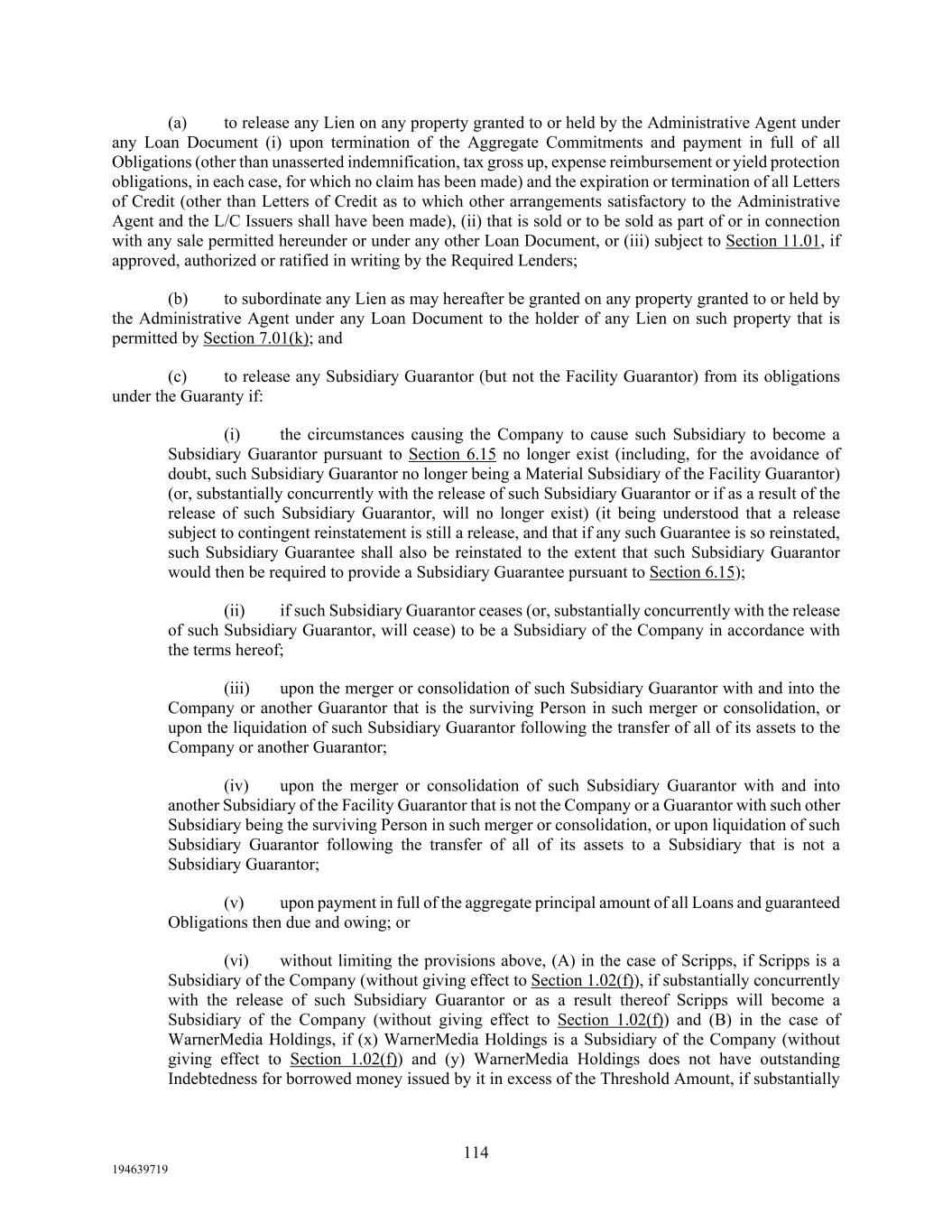 114 194639719 (a) to release any Lien on any property granted to or held by the Administrative Agent under any Loan Document (i) upon termination of the Aggregate Commitments and payment in full of all Obligations (other than unasserted indemnification, tax gross up, expense reimbursement or yield protection obligations, in each case, for which no claim has been made) and the expiration or termination of all Letters of Credit (other than Letters of Credit as to which other arrangements satisfactory to the Administrative Agent and the L/C Issuers shall have been made), (ii) that is sold or to be sold as part of or in connection with any sale permitted hereunder or under any other Loan Document, or (iii) subject to Section 11.01, if approved, authorized or ratified in writing by the Required Lenders; (b) to subordinate any Lien as may hereafter be granted on any property granted to or held by the Administrative Agent under any Loan Document to the holder of any Lien on such property that is permitted by Section 7.01(k); and (c) to release any Subsidiary Guarantor (but not the Facility Guarantor) from its obligations under the Guaranty if: (i) the circumstances causing the Company to cause such Subsidiary to become a Subsidiary Guarantor pursuant to Section 6.15 no longer exist (including, for the avoidance of doubt, such Subsidiary Guarantor no longer being a Material Subsidiary of the Facility Guarantor) (or, substantially concurrently with the release of such Subsidiary Guarantor or if as a result of the release of such Subsidiary Guarantor, will no longer exist) (it being understood that a release subject to contingent reinstatement is still a release, and that if any such Guarantee is so reinstated, such Subsidiary Guarantee shall also be reinstated to the extent that such Subsidiary Guarantor would then be required to provide a Subsidiary Guarantee pursuant to Section 6.15); (ii) if such Subsidiary Guarantor ceases (or, substantially concurrently with the release of such Subsidiary Guarantor, will cease) to be a Subsidiary of the Company in accordance with the terms hereof; (iii) upon the merger or consolidation of such Subsidiary Guarantor with and into the Company or another Guarantor that is the surviving Person in such merger or consolidation, or upon the liquidation of such Subsidiary Guarantor following the transfer of all of its assets to the Company or another Guarantor; (iv) upon the merger or consolidation of such Subsidiary Guarantor with and into another Subsidiary of the Facility Guarantor that is not the Company or a Guarantor with such other Subsidiary being the surviving Person in such merger or consolidation, or upon liquidation of such Subsidiary Guarantor following the transfer of all of its assets to a Subsidiary that is not a Subsidiary Guarantor; (v) upon payment in full of the aggregate principal amount of all Loans and guaranteed Obligations then due and owing; or (vi) without limiting the provisions above, (A) in the case of Scripps, if Scripps is a Subsidiary of the Company (without giving effect to Section 1.02(f)), if substantially concurrently with the release of such Subsidiary Guarantor or as a result thereof Scripps will become a Subsidiary of the Company (without giving effect to Section 1.02(f)) and (B) in the case of WarnerMedia Holdings, if (x) WarnerMedia Holdings is a Subsidiary of the Company (without giving effect to Section 1.02(f)) and (y) WarnerMedia Holdings does not have outstanding Indebtedness for borrowed money issued by it in excess of the Threshold Amount, if substantially