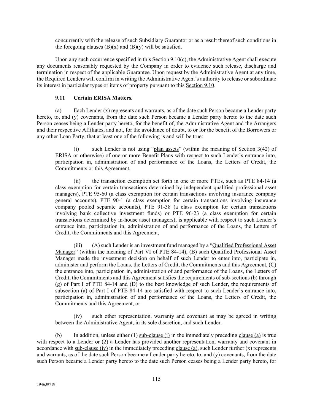 115 194639719 concurrently with the release of such Subsidiary Guarantor or as a result thereof such conditions in the foregoing clauses (B)(x) and (B)(y) will be satisfied. Upon any such occurrence specified in this Section 9.10(c), the Administrative Agent shall execute any documents reasonably requested by the Company in order to evidence such release, discharge and termination in respect of the applicable Guarantee. Upon request by the Administrative Agent at any time, the Required Lenders will confirm in writing the Administrative Agent’s authority to release or subordinate its interest in particular types or items of property pursuant to this Section 9.10. 9.11 Certain ERISA Matters. (a) Each Lender (x) represents and warrants, as of the date such Person became a Lender party hereto, to, and (y) covenants, from the date such Person became a Lender party hereto to the date such Person ceases being a Lender party hereto, for the benefit of, the Administrative Agent and the Arrangers and their respective Affiliates, and not, for the avoidance of doubt, to or for the benefit of the Borrowers or any other Loan Party, that at least one of the following is and will be true: (i) such Lender is not using “plan assets” (within the meaning of Section 3(42) of ERISA or otherwise) of one or more Benefit Plans with respect to such Lender’s entrance into, participation in, administration of and performance of the Loans, the Letters of Credit, the Commitments or this Agreement, (ii) the transaction exemption set forth in one or more PTEs, such as PTE 84-14 (a class exemption for certain transactions determined by independent qualified professional asset managers), PTE 95-60 (a class exemption for certain transactions involving insurance company general accounts), PTE 90-1 (a class exemption for certain transactions involving insurance company pooled separate accounts), PTE 91-38 (a class exemption for certain transactions involving bank collective investment funds) or PTE 96-23 (a class exemption for certain transactions determined by in-house asset managers), is applicable with respect to such Lender’s entrance into, participation in, administration of and performance of the Loans, the Letters of Credit, the Commitments and this Agreement, (iii) (A) such Lender is an investment fund managed by a “Qualified Professional Asset Manager” (within the meaning of Part VI of PTE 84-14), (B) such Qualified Professional Asset Manager made the investment decision on behalf of such Lender to enter into, participate in, administer and perform the Loans, the Letters of Credit, the Commitments and this Agreement, (C) the entrance into, participation in, administration of and performance of the Loans, the Letters of Credit, the Commitments and this Agreement satisfies the requirements of sub-sections (b) through (g) of Part I of PTE 84-14 and (D) to the best knowledge of such Lender, the requirements of subsection (a) of Part I of PTE 84-14 are satisfied with respect to such Lender’s entrance into, participation in, administration of and performance of the Loans, the Letters of Credit, the Commitments and this Agreement, or (iv) such other representation, warranty and covenant as may be agreed in writing between the Administrative Agent, in its sole discretion, and such Lender. (b) In addition, unless either (1) sub-clause (i) in the immediately preceding clause (a) is true with respect to a Lender or (2) a Lender has provided another representation, warranty and covenant in accordance with sub-clause (iv) in the immediately preceding clause (a), such Lender further (x) represents and warrants, as of the date such Person became a Lender party hereto, to, and (y) covenants, from the date such Person became a Lender party hereto to the date such Person ceases being a Lender party hereto, for