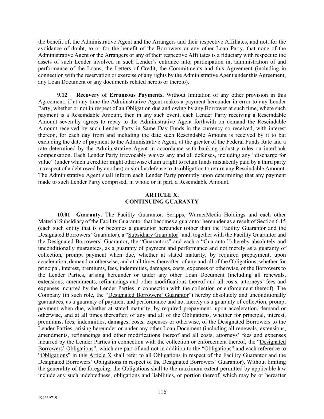 116 194639719 the benefit of, the Administrative Agent and the Arrangers and their respective Affiliates, and not, for the avoidance of doubt, to or for the benefit of the Borrowers or any other Loan Party, that none of the Administrative Agent or the Arrangers or any of their respective Affiliates is a fiduciary with respect to the assets of such Lender involved in such Lender’s entrance into, participation in, administration of and performance of the Loans, the Letters of Credit, the Commitments and this Agreement (including in connection with the reservation or exercise of any rights by the Administrative Agent under this Agreement, any Loan Document or any documents related hereto or thereto). 9.12 Recovery of Erroneous Payments. Without limitation of any other provision in this Agreement, if at any time the Administrative Agent makes a payment hereunder in error to any Lender Party, whether or not in respect of an Obligation due and owing by any Borrower at such time, where such payment is a Rescindable Amount, then in any such event, each Lender Party receiving a Rescindable Amount severally agrees to repay to the Administrative Agent forthwith on demand the Rescindable Amount received by such Lender Party in Same Day Funds in the currency so received, with interest thereon, for each day from and including the date such Rescindable Amount is received by it to but excluding the date of payment to the Administrative Agent, at the greater of the Federal Funds Rate and a rate determined by the Administrative Agent in accordance with banking industry rules on interbank compensation. Each Lender Party irrevocably waives any and all defenses, including any “discharge for value” (under which a creditor might otherwise claim a right to retain funds mistakenly paid by a third party in respect of a debt owed by another) or similar defense to its obligation to return any Rescindable Amount. The Administrative Agent shall inform each Lender Party promptly upon determining that any payment made to such Lender Party comprised, in whole or in part, a Rescindable Amount. ARTICLE X. CONTINUING GUARANTY 10.01 Guaranty. The Facility Guarantor, Scripps, WarnerMedia Holdings and each other Material Subsidiary of the Facility Guarantor that becomes a guarantor hereunder as a result of Section 6.15 (each such entity that is or becomes a guarantor hereunder (other than the Facility Guarantor and the Designated Borrowers’ Guarantor), a “Subsidiary Guarantor” and, together with the Facility Guarantor and the Designated Borrowers’ Guarantor, the “Guarantors” and each a “Guarantor”) hereby absolutely and unconditionally guarantees, as a guaranty of payment and performance and not merely as a guaranty of collection, prompt payment when due, whether at stated maturity, by required prepayment, upon acceleration, demand or otherwise, and at all times thereafter, of any and all of the Obligations, whether for principal, interest, premiums, fees, indemnities, damages, costs, expenses or otherwise, of the Borrowers to the Lender Parties, arising hereunder or under any other Loan Document (including all renewals, extensions, amendments, refinancings and other modifications thereof and all costs, attorneys’ fees and expenses incurred by the Lender Parties in connection with the collection or enforcement thereof). The Company (in such role, the “Designated Borrowers’ Guarantor”) hereby absolutely and unconditionally guarantees, as a guaranty of payment and performance and not merely as a guaranty of collection, prompt payment when due, whether at stated maturity, by required prepayment, upon acceleration, demand or otherwise, and at all times thereafter, of any and all of the Obligations, whether for principal, interest, premiums, fees, indemnities, damages, costs, expenses or otherwise, of the Designated Borrowers to the Lender Parties, arising hereunder or under any other Loan Document (including all renewals, extensions, amendments, refinancings and other modifications thereof and all costs, attorneys’ fees and expenses incurred by the Lender Parties in connection with the collection or enforcement thereof, the “Designated Borrowers’ Obligations”, which are part of and not in addition to the “Obligations” and each reference to “Obligations” in this Article X shall refer to all Obligations in respect of the Facility Guarantor and the Designated Borrowers’ Obligations in respect of the Designated Borrowers’ Guarantor). Without limiting the generality of the foregoing, the Obligations shall to the maximum extent permitted by applicable law include any such indebtedness, obligations and liabilities, or portion thereof, which may be or hereafter