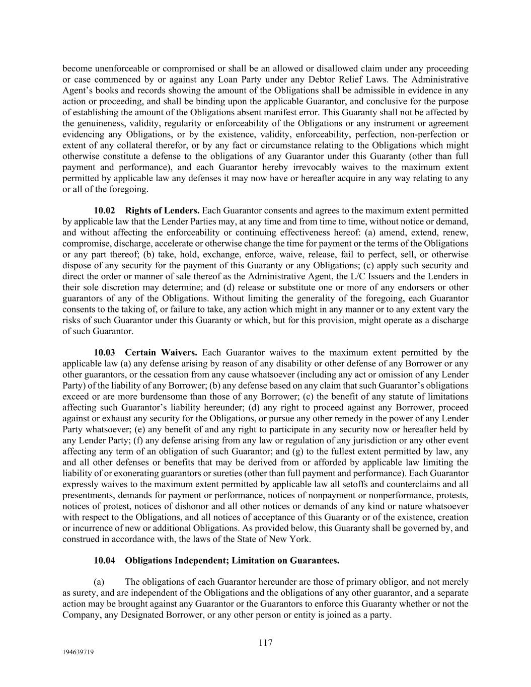 117 194639719 become unenforceable or compromised or shall be an allowed or disallowed claim under any proceeding or case commenced by or against any Loan Party under any Debtor Relief Laws. The Administrative Agent’s books and records showing the amount of the Obligations shall be admissible in evidence in any action or proceeding, and shall be binding upon the applicable Guarantor, and conclusive for the purpose of establishing the amount of the Obligations absent manifest error. This Guaranty shall not be affected by the genuineness, validity, regularity or enforceability of the Obligations or any instrument or agreement evidencing any Obligations, or by the existence, validity, enforceability, perfection, non-perfection or extent of any collateral therefor, or by any fact or circumstance relating to the Obligations which might otherwise constitute a defense to the obligations of any Guarantor under this Guaranty (other than full payment and performance), and each Guarantor hereby irrevocably waives to the maximum extent permitted by applicable law any defenses it may now have or hereafter acquire in any way relating to any or all of the foregoing. 10.02 Rights of Lenders. Each Guarantor consents and agrees to the maximum extent permitted by applicable law that the Lender Parties may, at any time and from time to time, without notice or demand, and without affecting the enforceability or continuing effectiveness hereof: (a) amend, extend, renew, compromise, discharge, accelerate or otherwise change the time for payment or the terms of the Obligations or any part thereof; (b) take, hold, exchange, enforce, waive, release, fail to perfect, sell, or otherwise dispose of any security for the payment of this Guaranty or any Obligations; (c) apply such security and direct the order or manner of sale thereof as the Administrative Agent, the L/C Issuers and the Lenders in their sole discretion may determine; and (d) release or substitute one or more of any endorsers or other guarantors of any of the Obligations. Without limiting the generality of the foregoing, each Guarantor consents to the taking of, or failure to take, any action which might in any manner or to any extent vary the risks of such Guarantor under this Guaranty or which, but for this provision, might operate as a discharge of such Guarantor. 10.03 Certain Waivers. Each Guarantor waives to the maximum extent permitted by the applicable law (a) any defense arising by reason of any disability or other defense of any Borrower or any other guarantors, or the cessation from any cause whatsoever (including any act or omission of any Lender Party) of the liability of any Borrower; (b) any defense based on any claim that such Guarantor’s obligations exceed or are more burdensome than those of any Borrower; (c) the benefit of any statute of limitations affecting such Guarantor’s liability hereunder; (d) any right to proceed against any Borrower, proceed against or exhaust any security for the Obligations, or pursue any other remedy in the power of any Lender Party whatsoever; (e) any benefit of and any right to participate in any security now or hereafter held by any Lender Party; (f) any defense arising from any law or regulation of any jurisdiction or any other event affecting any term of an obligation of such Guarantor; and (g) to the fullest extent permitted by law, any and all other defenses or benefits that may be derived from or afforded by applicable law limiting the liability of or exonerating guarantors or sureties (other than full payment and performance). Each Guarantor expressly waives to the maximum extent permitted by applicable law all setoffs and counterclaims and all presentments, demands for payment or performance, notices of nonpayment or nonperformance, protests, notices of protest, notices of dishonor and all other notices or demands of any kind or nature whatsoever with respect to the Obligations, and all notices of acceptance of this Guaranty or of the existence, creation or incurrence of new or additional Obligations. As provided below, this Guaranty shall be governed by, and construed in accordance with, the laws of the State of New York. 10.04 Obligations Independent; Limitation on Guarantees. (a) The obligations of each Guarantor hereunder are those of primary obligor, and not merely as surety, and are independent of the Obligations and the obligations of any other guarantor, and a separate action may be brought against any Guarantor or the Guarantors to enforce this Guaranty whether or not the Company, any Designated Borrower, or any other person or entity is joined as a party.