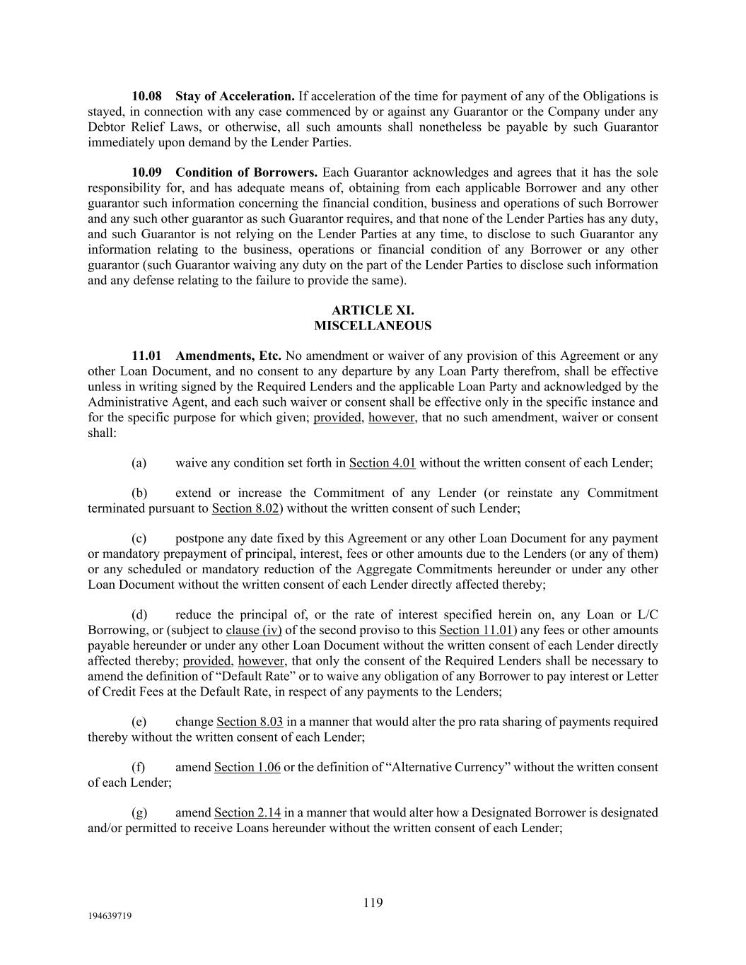 119 194639719 10.08 Stay of Acceleration. If acceleration of the time for payment of any of the Obligations is stayed, in connection with any case commenced by or against any Guarantor or the Company under any Debtor Relief Laws, or otherwise, all such amounts shall nonetheless be payable by such Guarantor immediately upon demand by the Lender Parties. 10.09 Condition of Borrowers. Each Guarantor acknowledges and agrees that it has the sole responsibility for, and has adequate means of, obtaining from each applicable Borrower and any other guarantor such information concerning the financial condition, business and operations of such Borrower and any such other guarantor as such Guarantor requires, and that none of the Lender Parties has any duty, and such Guarantor is not relying on the Lender Parties at any time, to disclose to such Guarantor any information relating to the business, operations or financial condition of any Borrower or any other guarantor (such Guarantor waiving any duty on the part of the Lender Parties to disclose such information and any defense relating to the failure to provide the same). ARTICLE XI. MISCELLANEOUS 11.01 Amendments, Etc. No amendment or waiver of any provision of this Agreement or any other Loan Document, and no consent to any departure by any Loan Party therefrom, shall be effective unless in writing signed by the Required Lenders and the applicable Loan Party and acknowledged by the Administrative Agent, and each such waiver or consent shall be effective only in the specific instance and for the specific purpose for which given; provided, however, that no such amendment, waiver or consent shall: (a) waive any condition set forth in Section 4.01 without the written consent of each Lender; (b) extend or increase the Commitment of any Lender (or reinstate any Commitment terminated pursuant to Section 8.02) without the written consent of such Lender; (c) postpone any date fixed by this Agreement or any other Loan Document for any payment or mandatory prepayment of principal, interest, fees or other amounts due to the Lenders (or any of them) or any scheduled or mandatory reduction of the Aggregate Commitments hereunder or under any other Loan Document without the written consent of each Lender directly affected thereby; (d) reduce the principal of, or the rate of interest specified herein on, any Loan or L/C Borrowing, or (subject to clause (iv) of the second proviso to this Section 11.01) any fees or other amounts payable hereunder or under any other Loan Document without the written consent of each Lender directly affected thereby; provided, however, that only the consent of the Required Lenders shall be necessary to amend the definition of “Default Rate” or to waive any obligation of any Borrower to pay interest or Letter of Credit Fees at the Default Rate, in respect of any payments to the Lenders; (e) change Section 8.03 in a manner that would alter the pro rata sharing of payments required thereby without the written consent of each Lender; (f) amend Section 1.06 or the definition of “Alternative Currency” without the written consent of each Lender; (g) amend Section 2.14 in a manner that would alter how a Designated Borrower is designated and/or permitted to receive Loans hereunder without the written consent of each Lender;